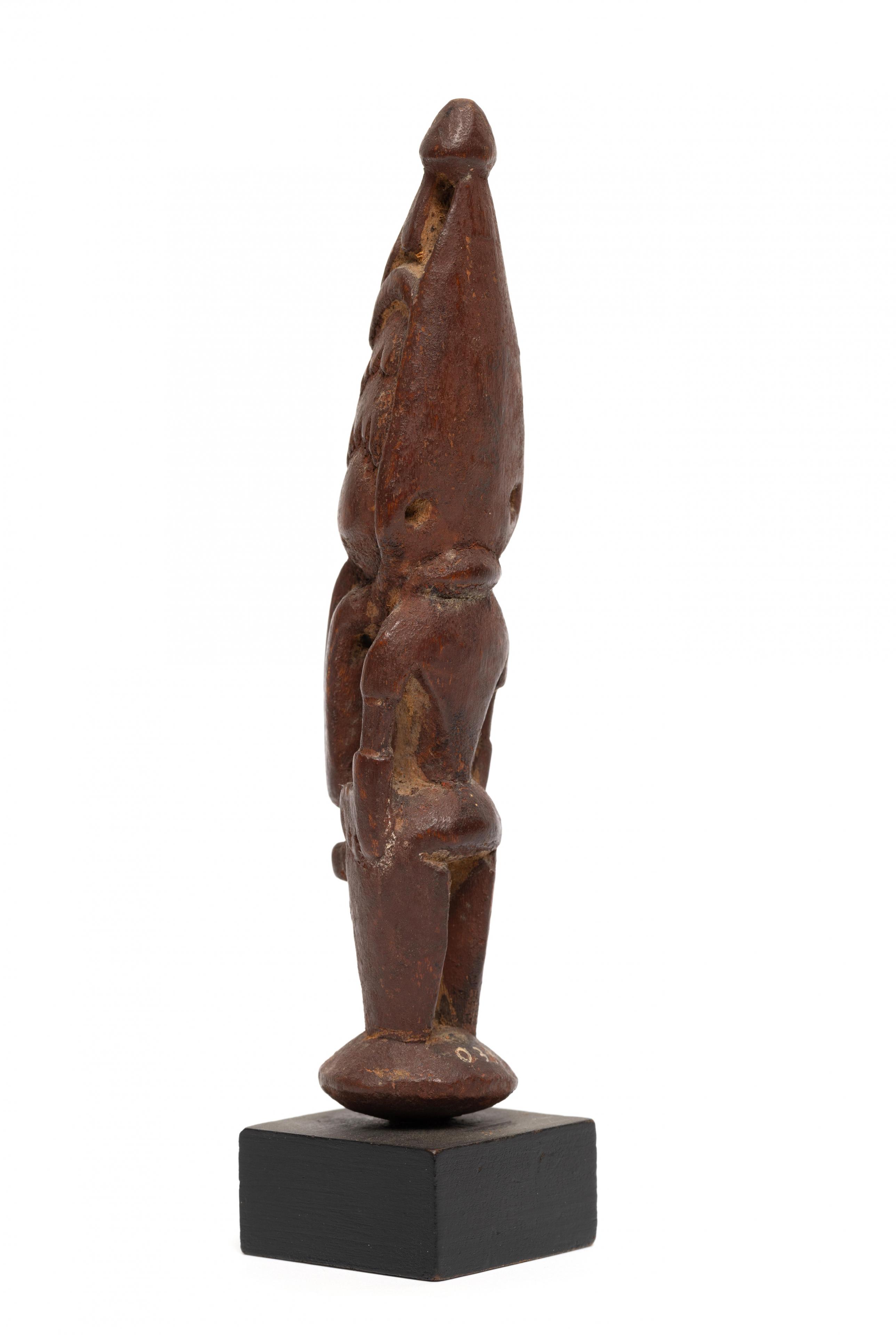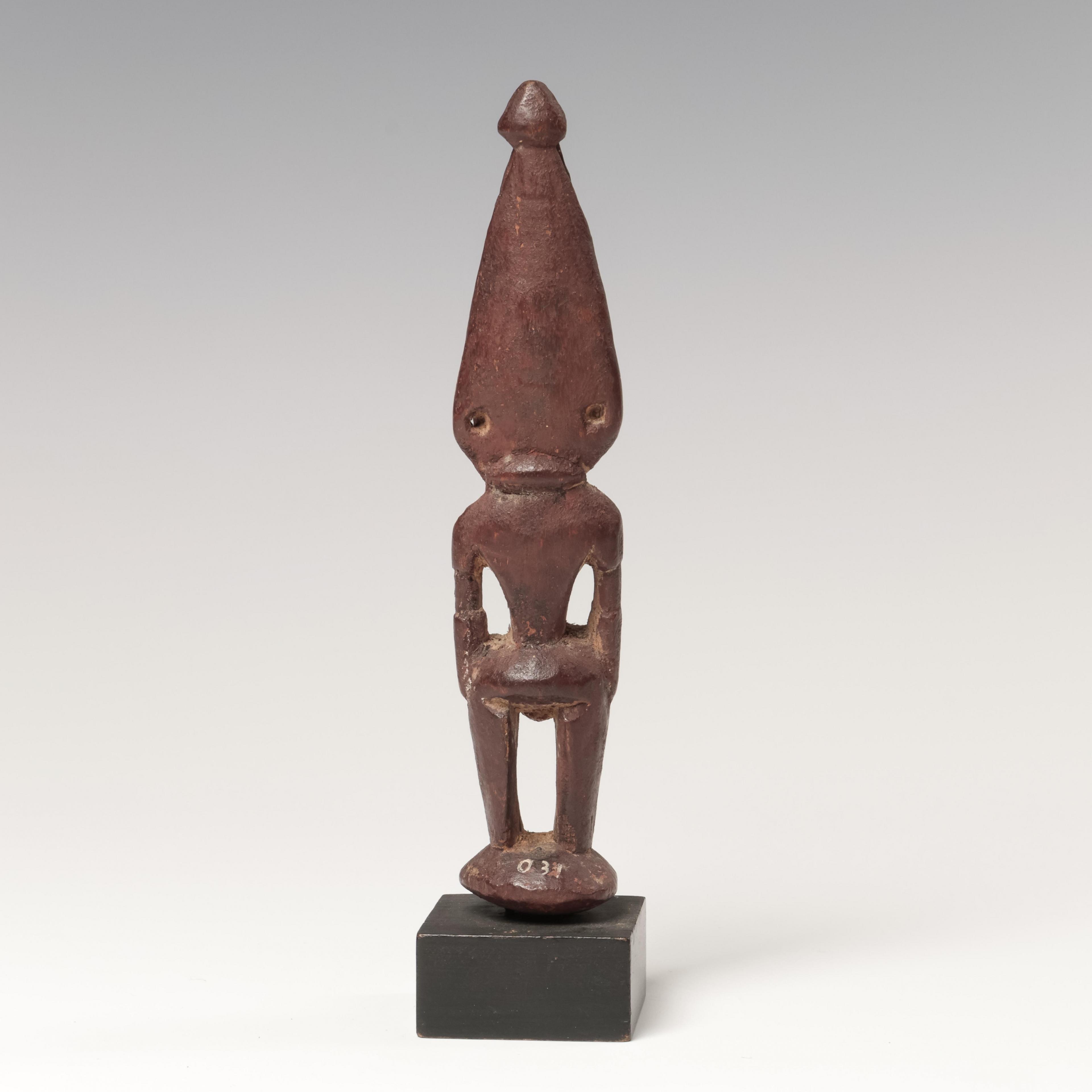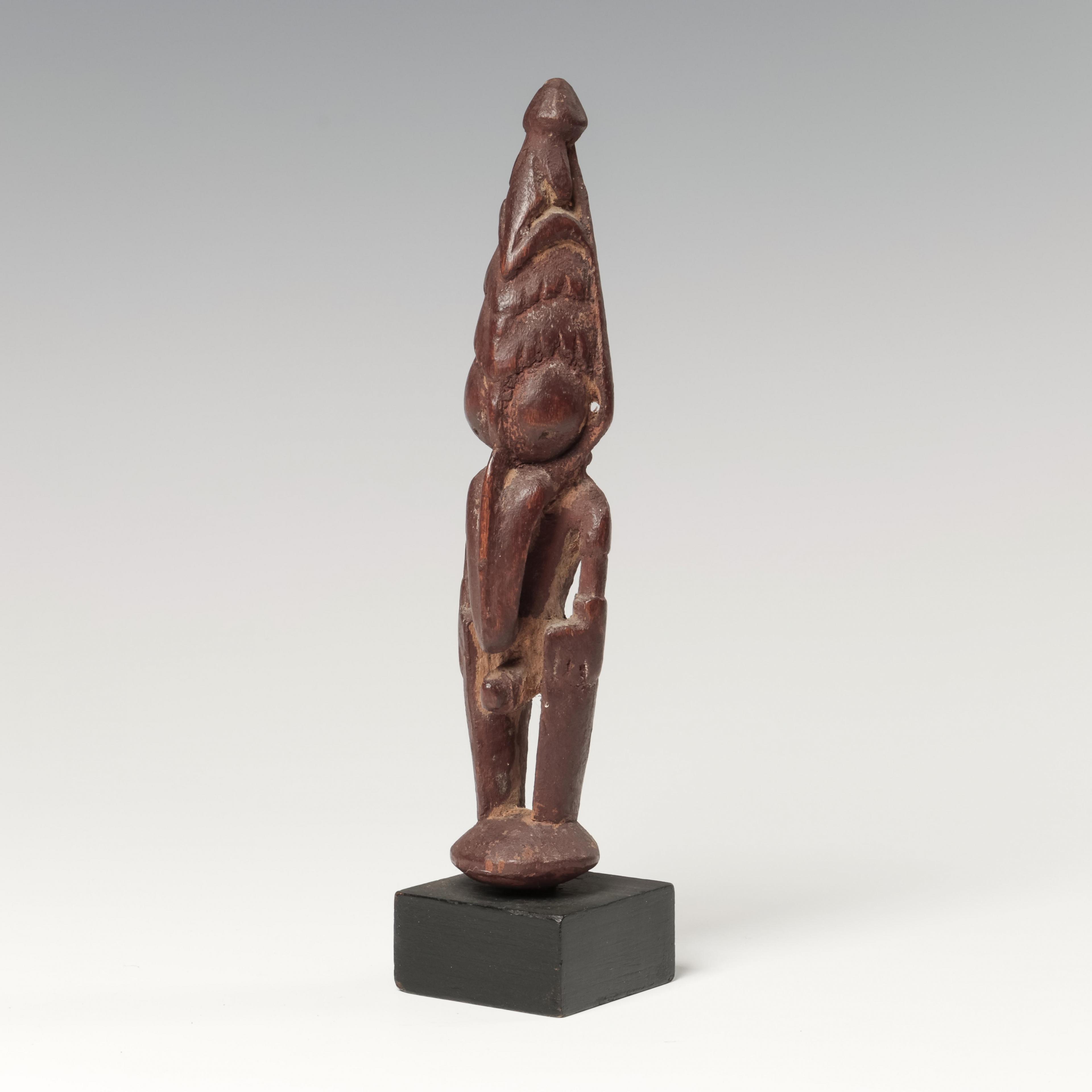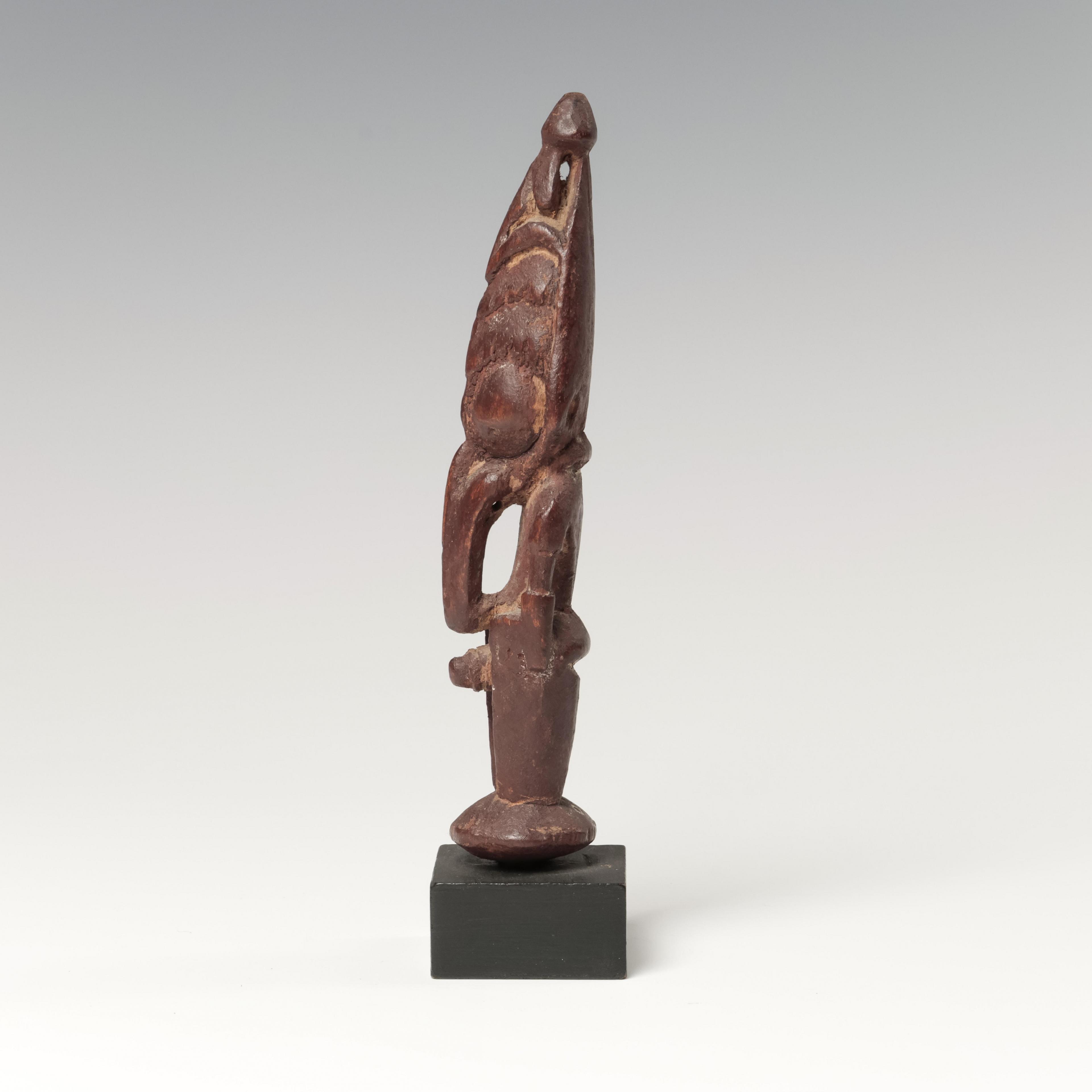 pierced ears, headdress finial carved as a stylized reptile and remains of old reddish pigments.