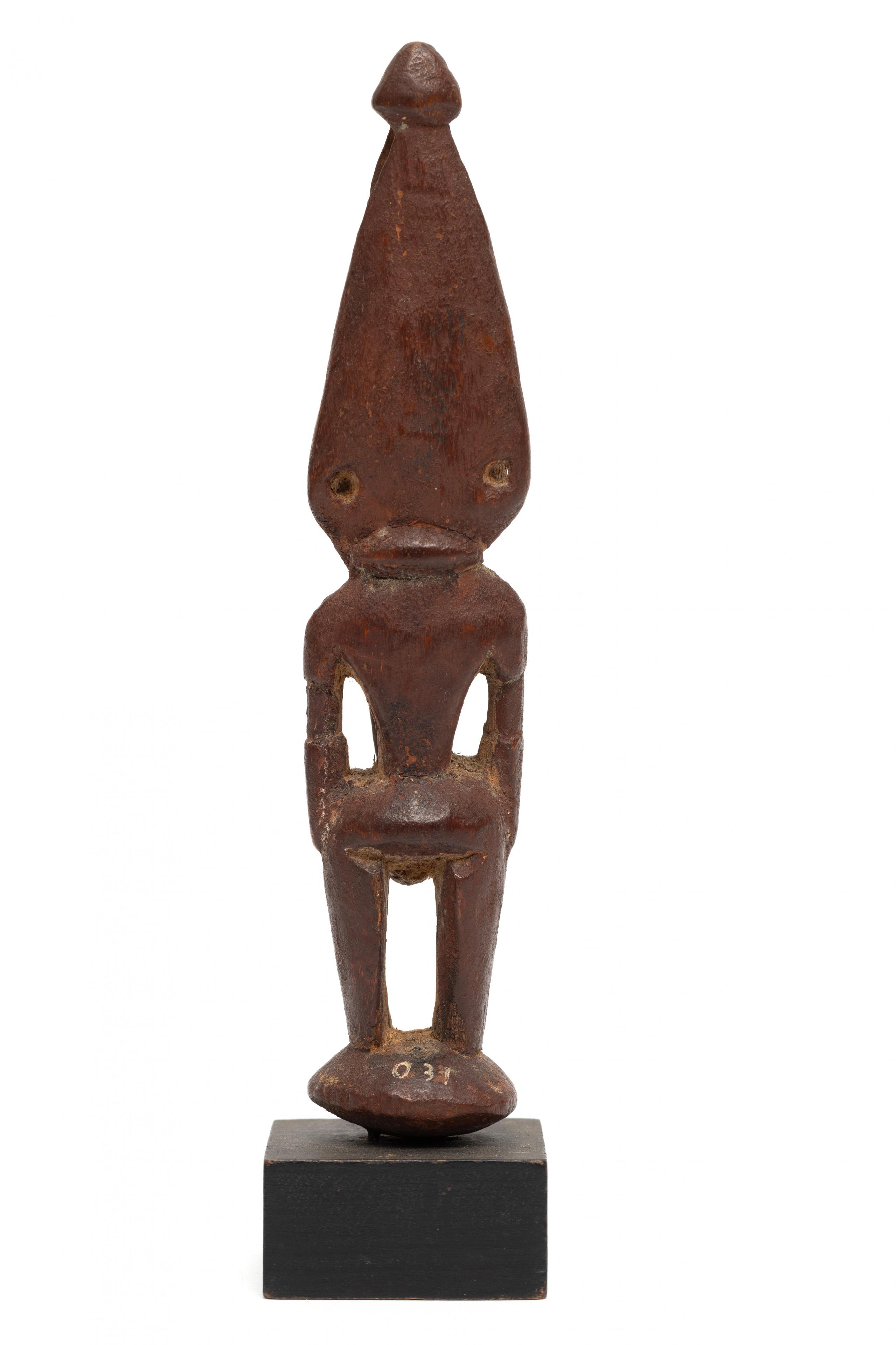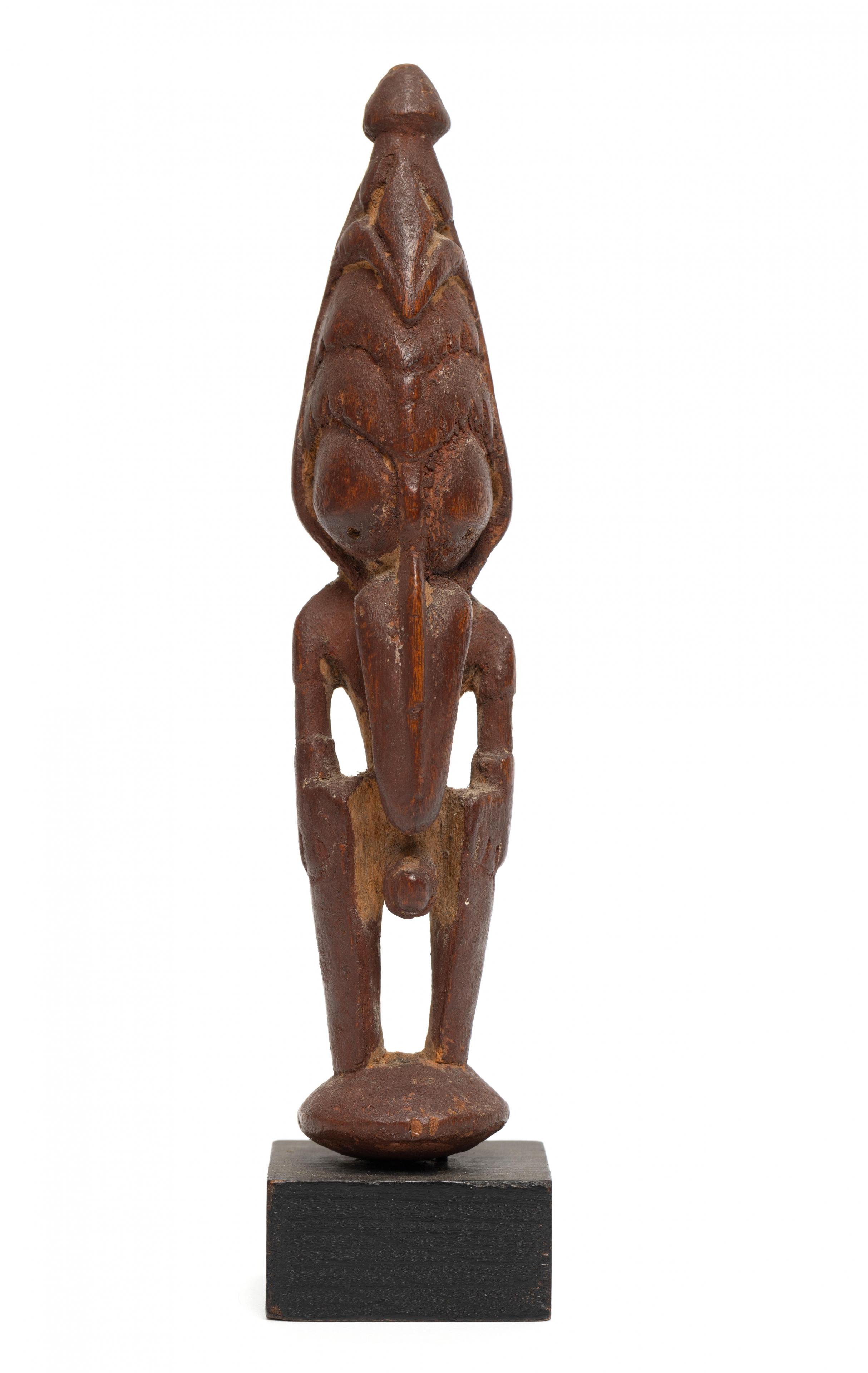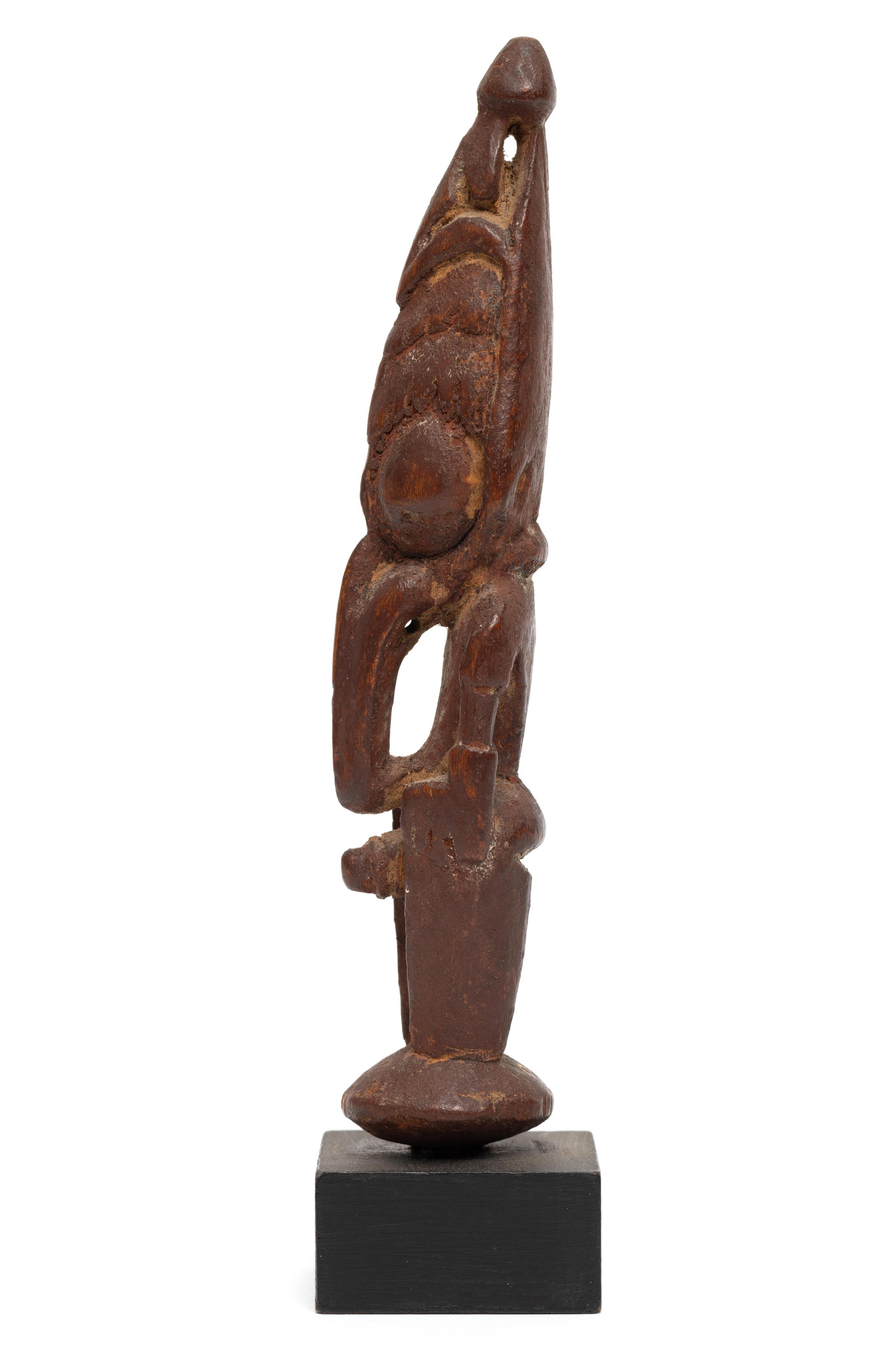 pierced ears, headdress finial carved as a stylized reptile and remains of old reddish pigments.