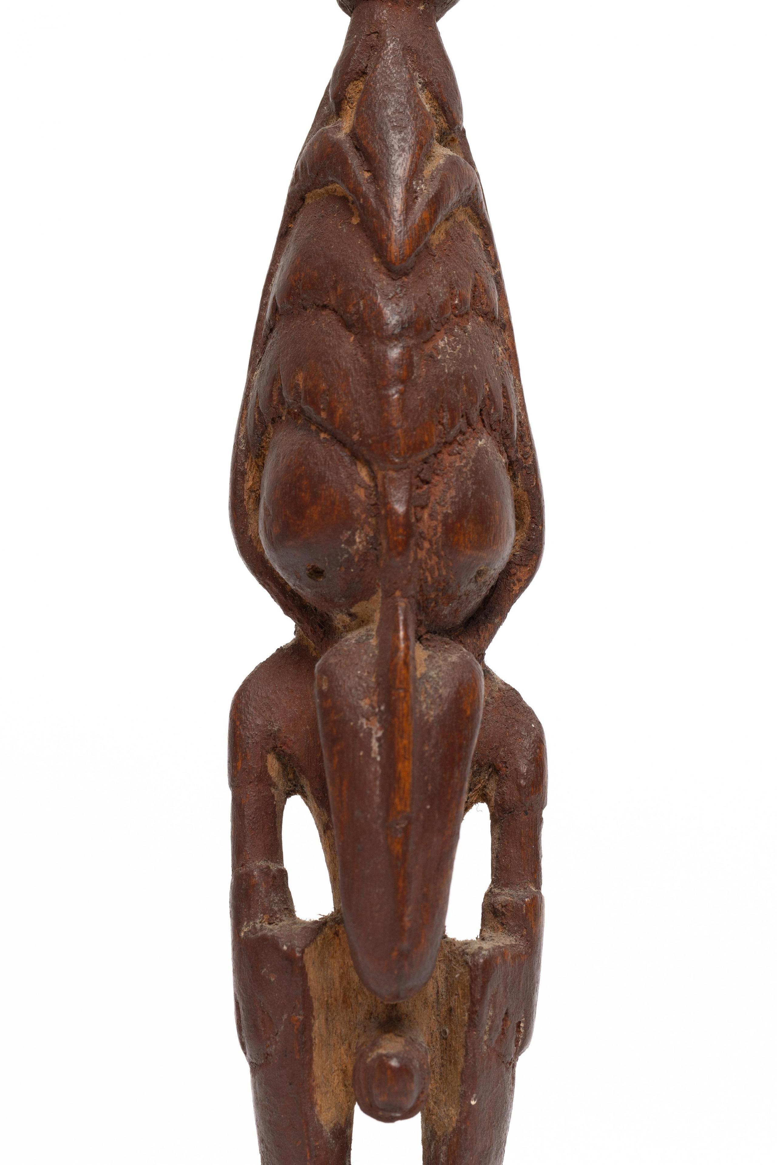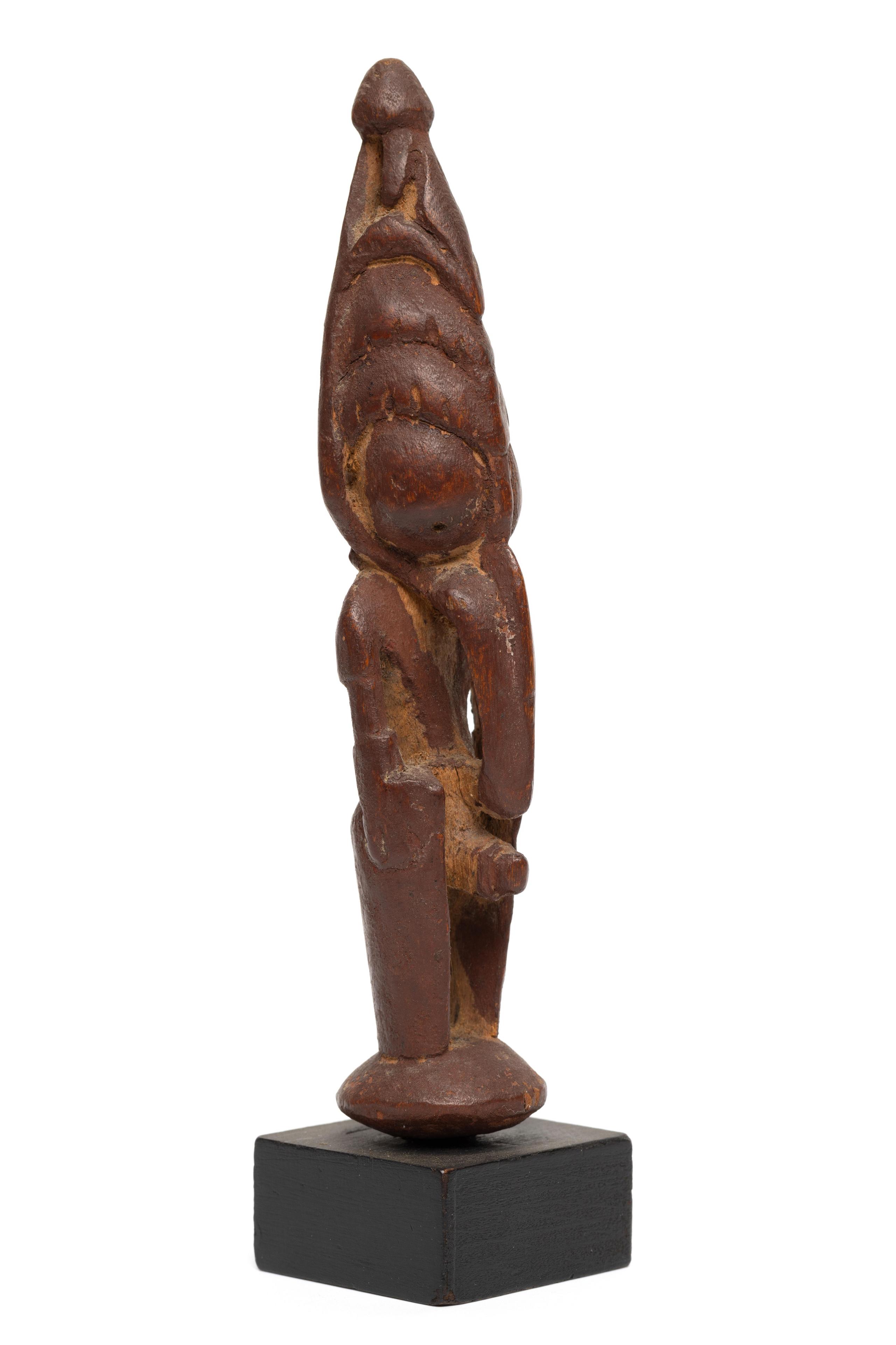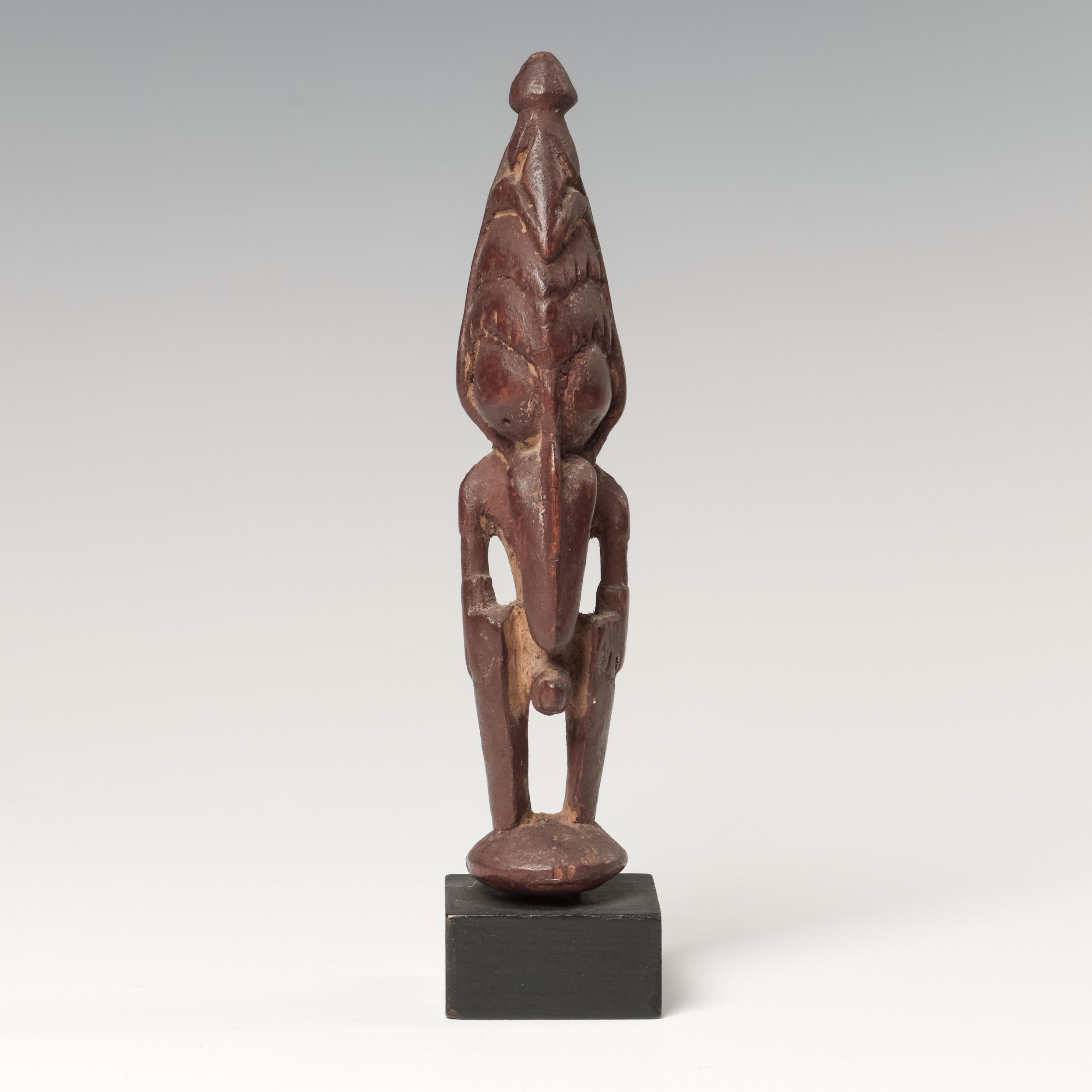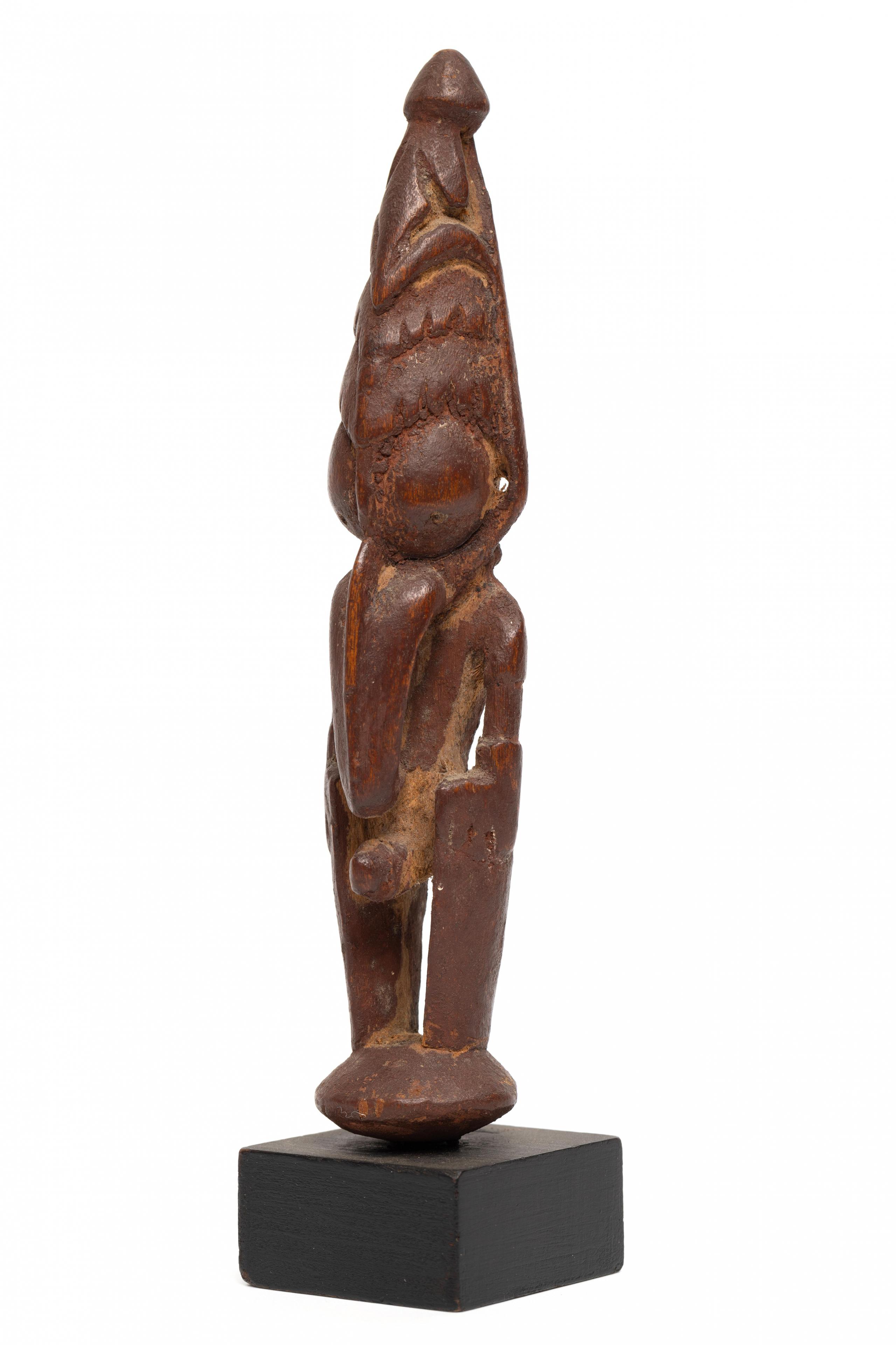 pierced ears, headdress finial carved as a stylized reptile and remains of old reddish pigments.