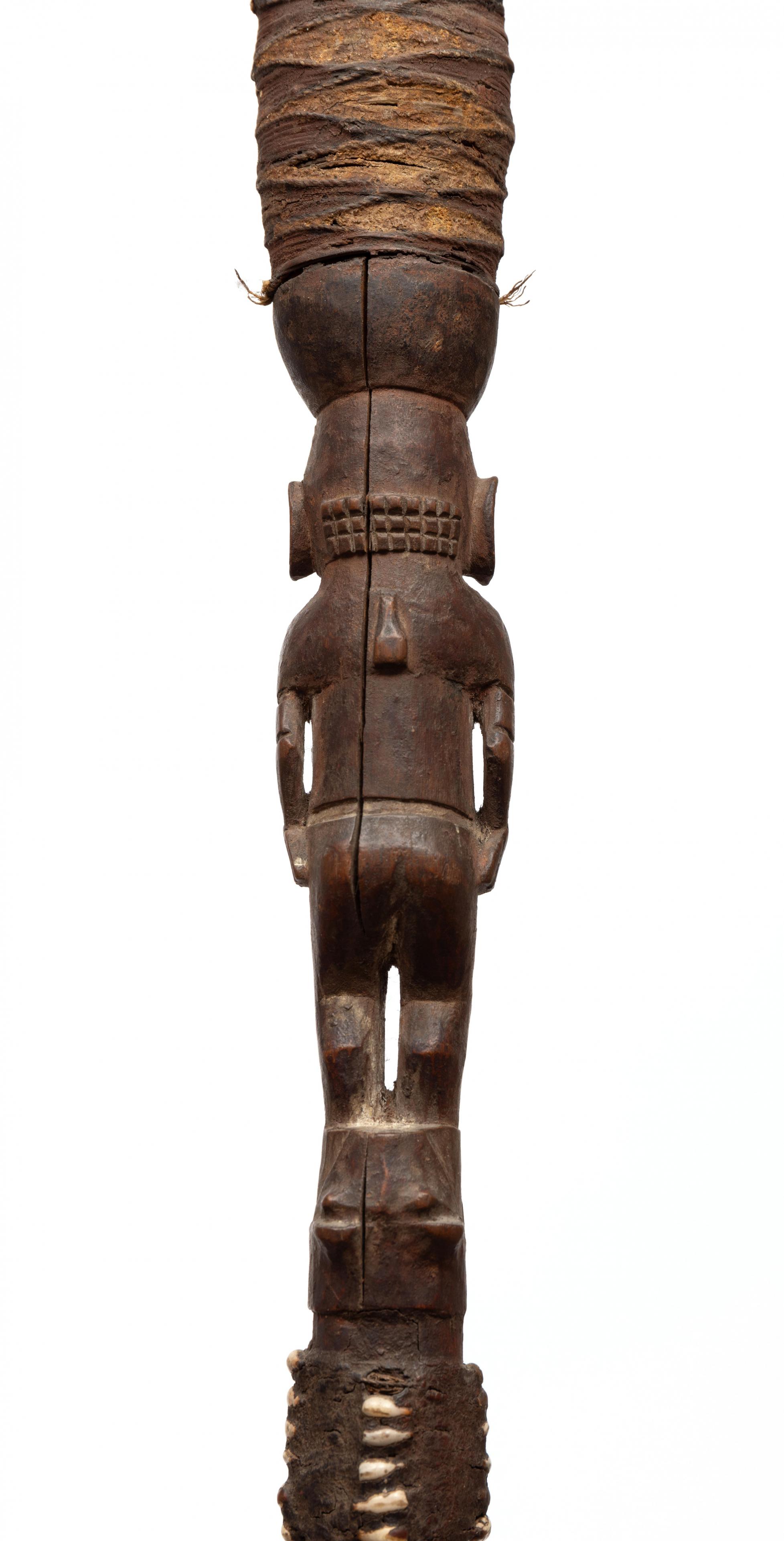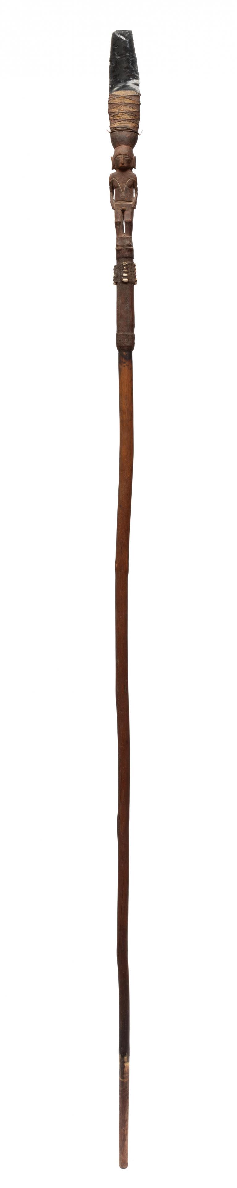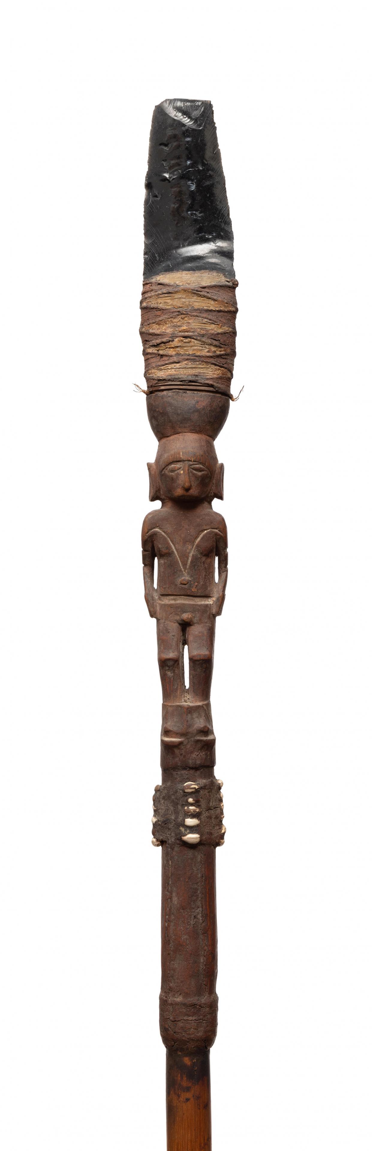 standing figure emerging from a janiform head, coix seeds, parinarum paste and obsidian spear head, mounted on a wooden shaft.