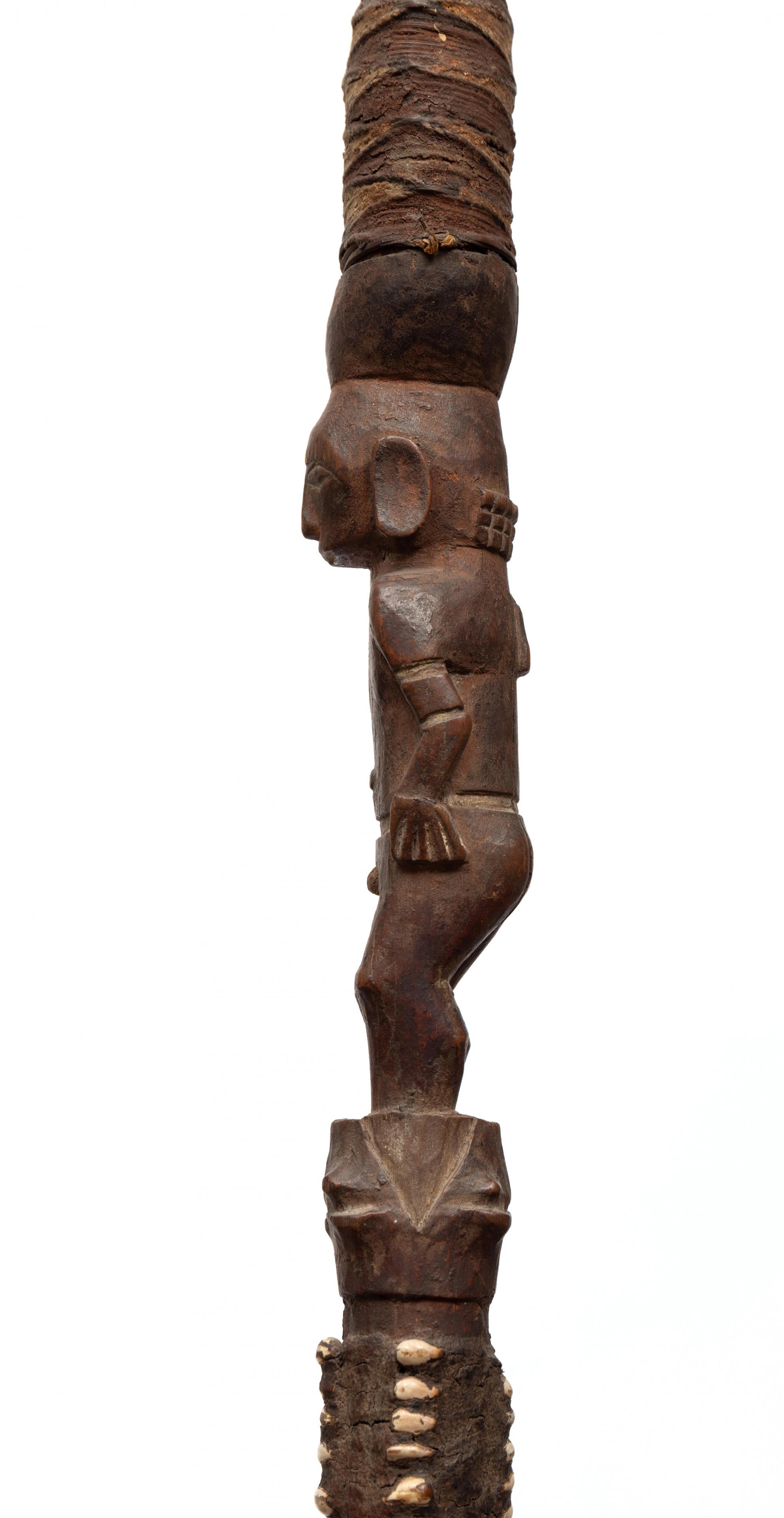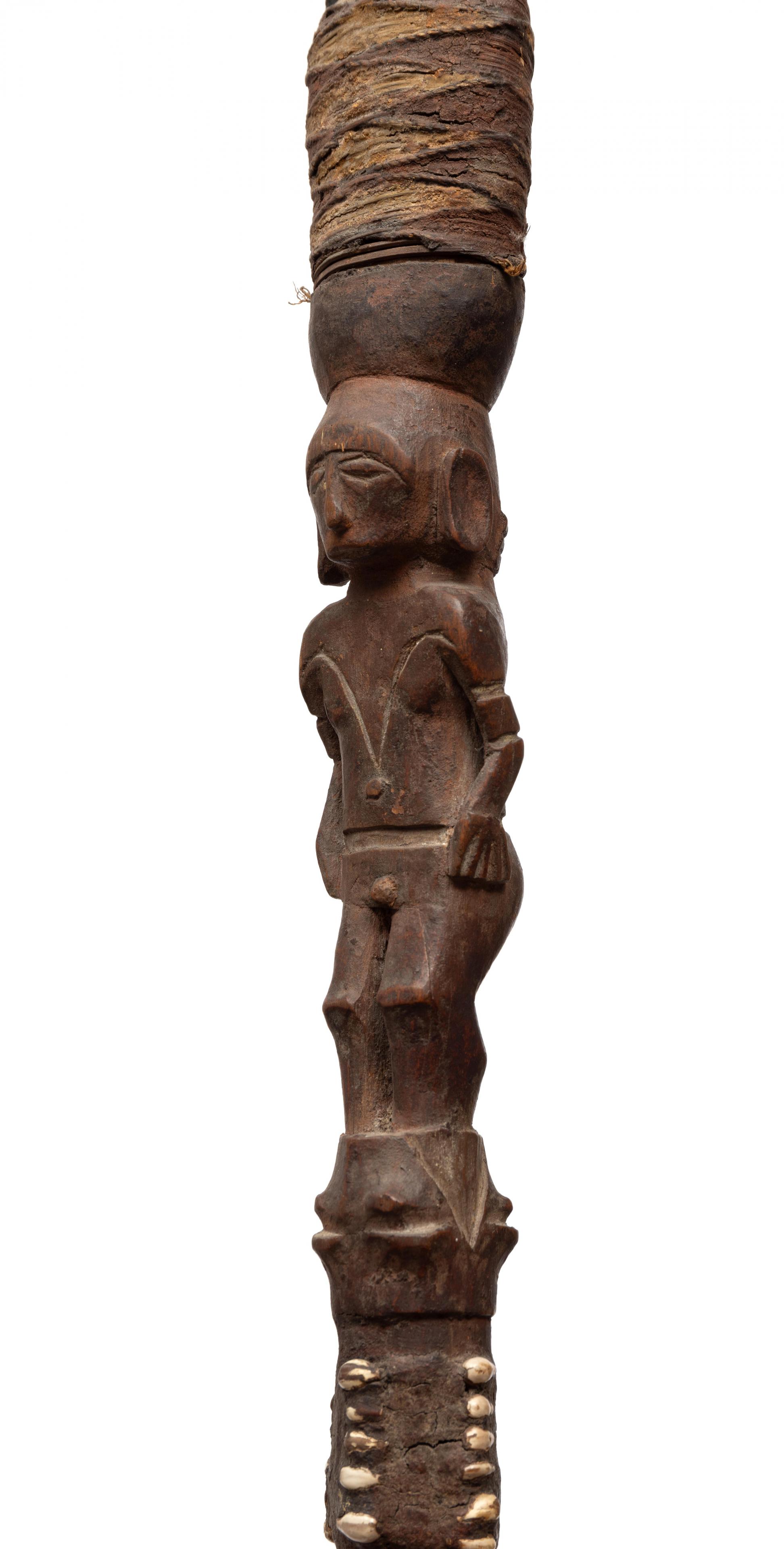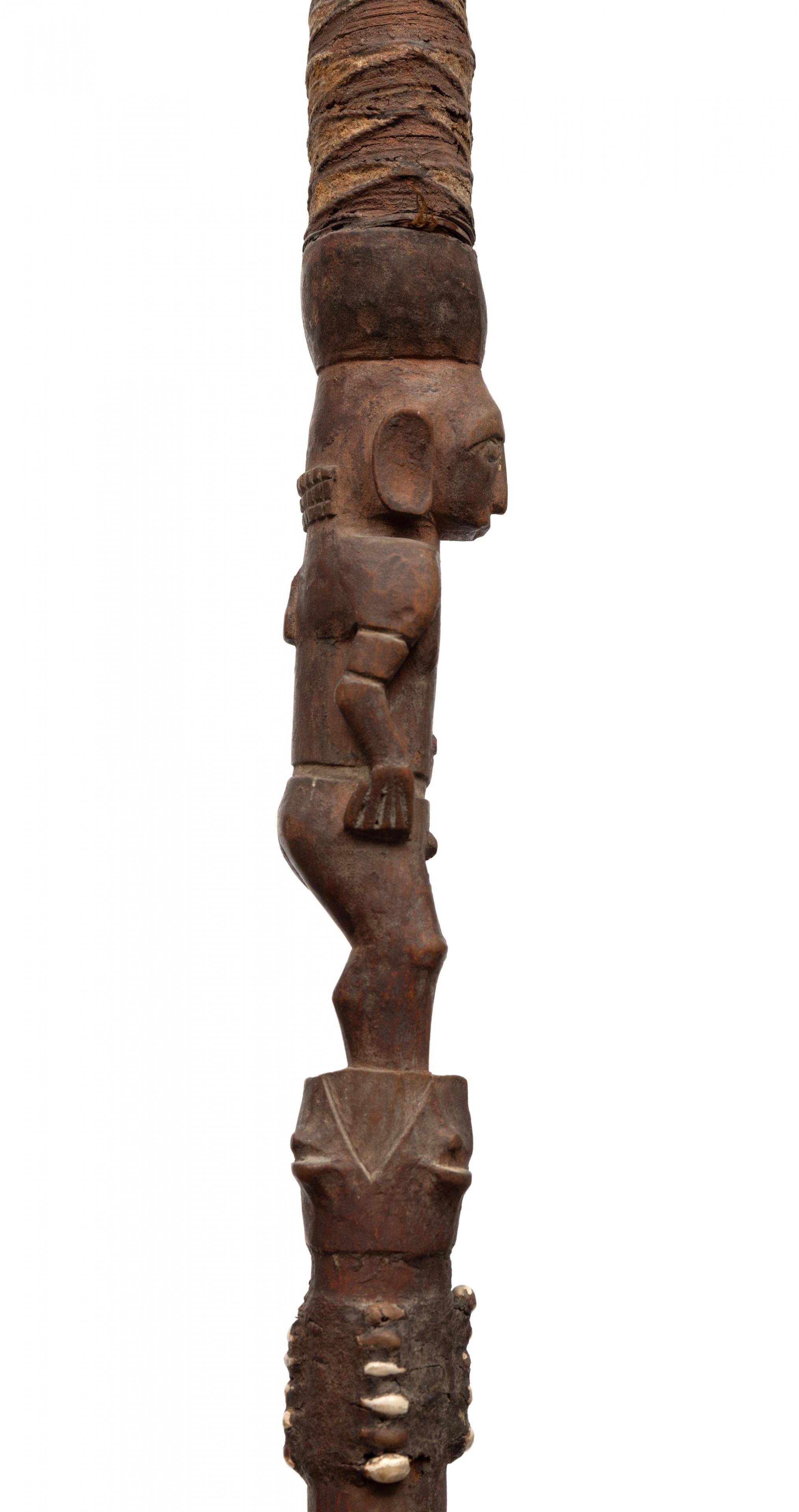 standing figure emerging from a janiform head, coix seeds, parinarum paste and obsidian spear head, mounted on a wooden shaft.