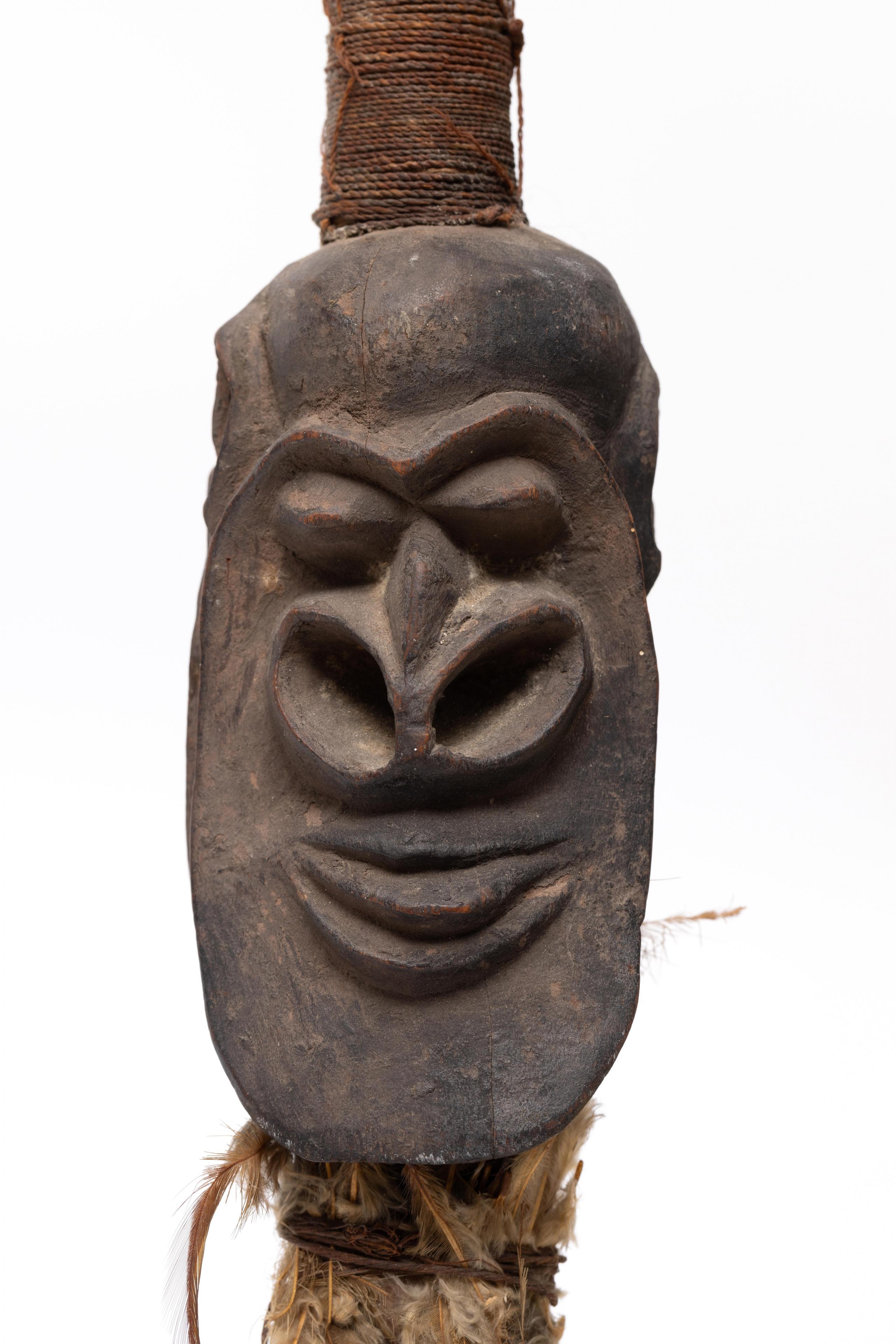 in the centre a janiform head with prominent nose, above the head twisted plant fibre, below a collection of bound feathers.
