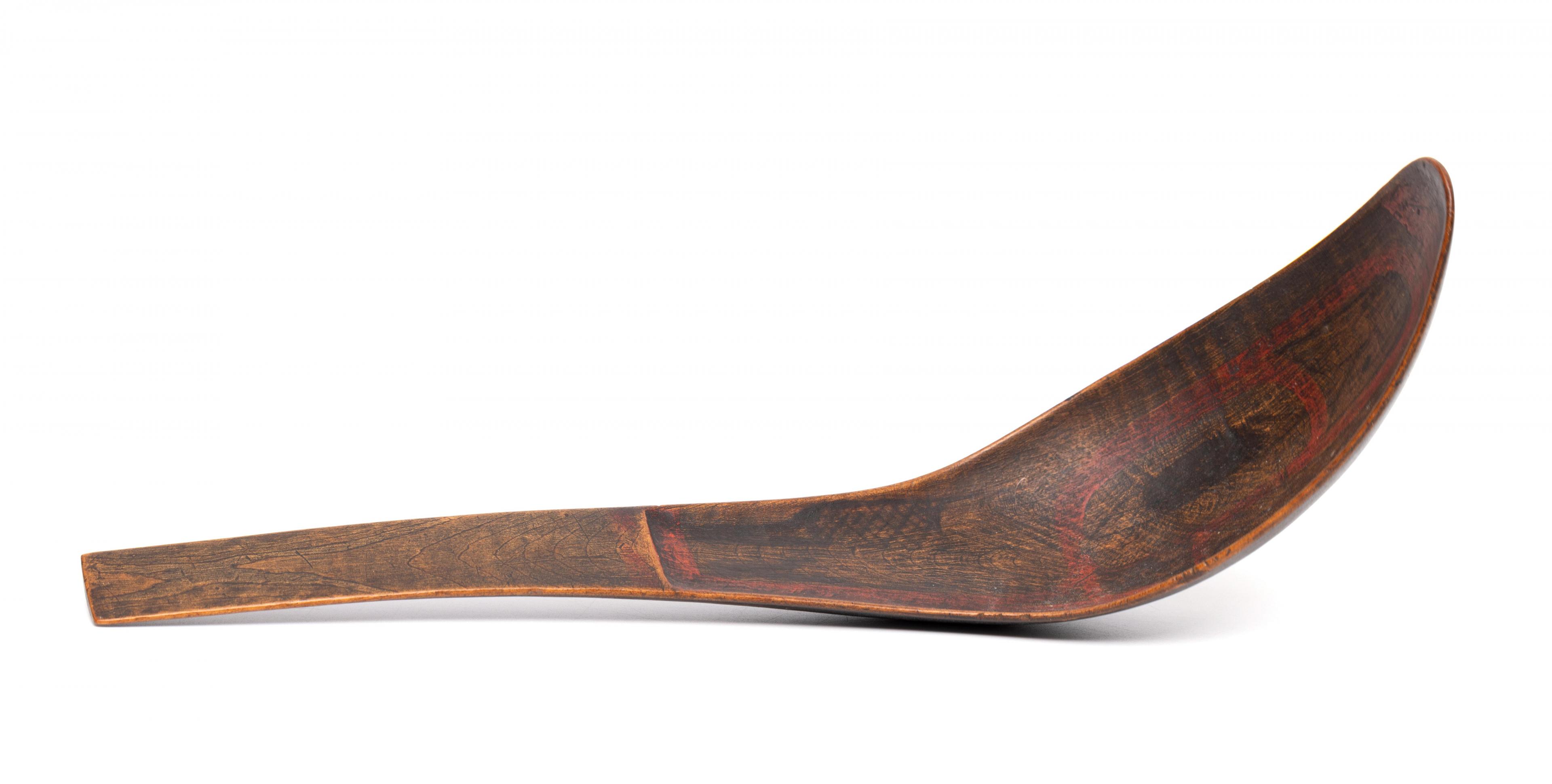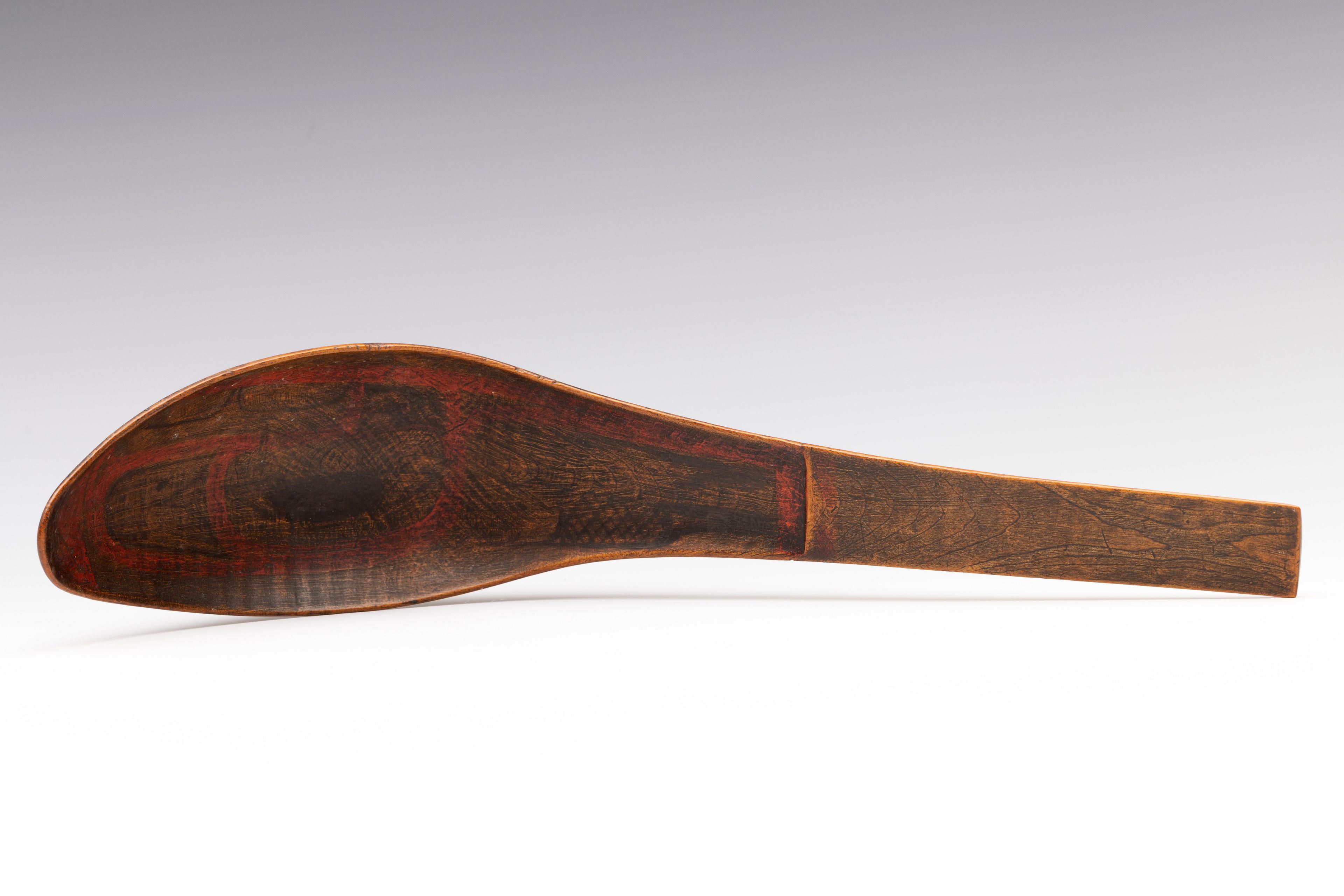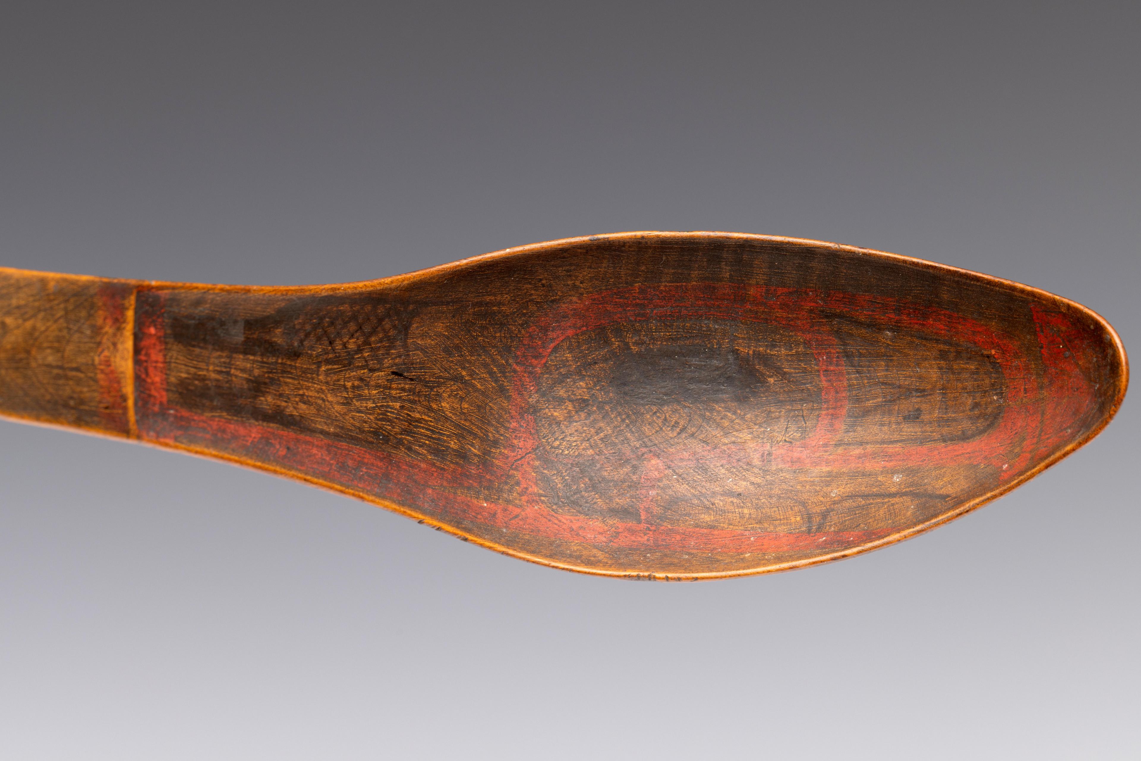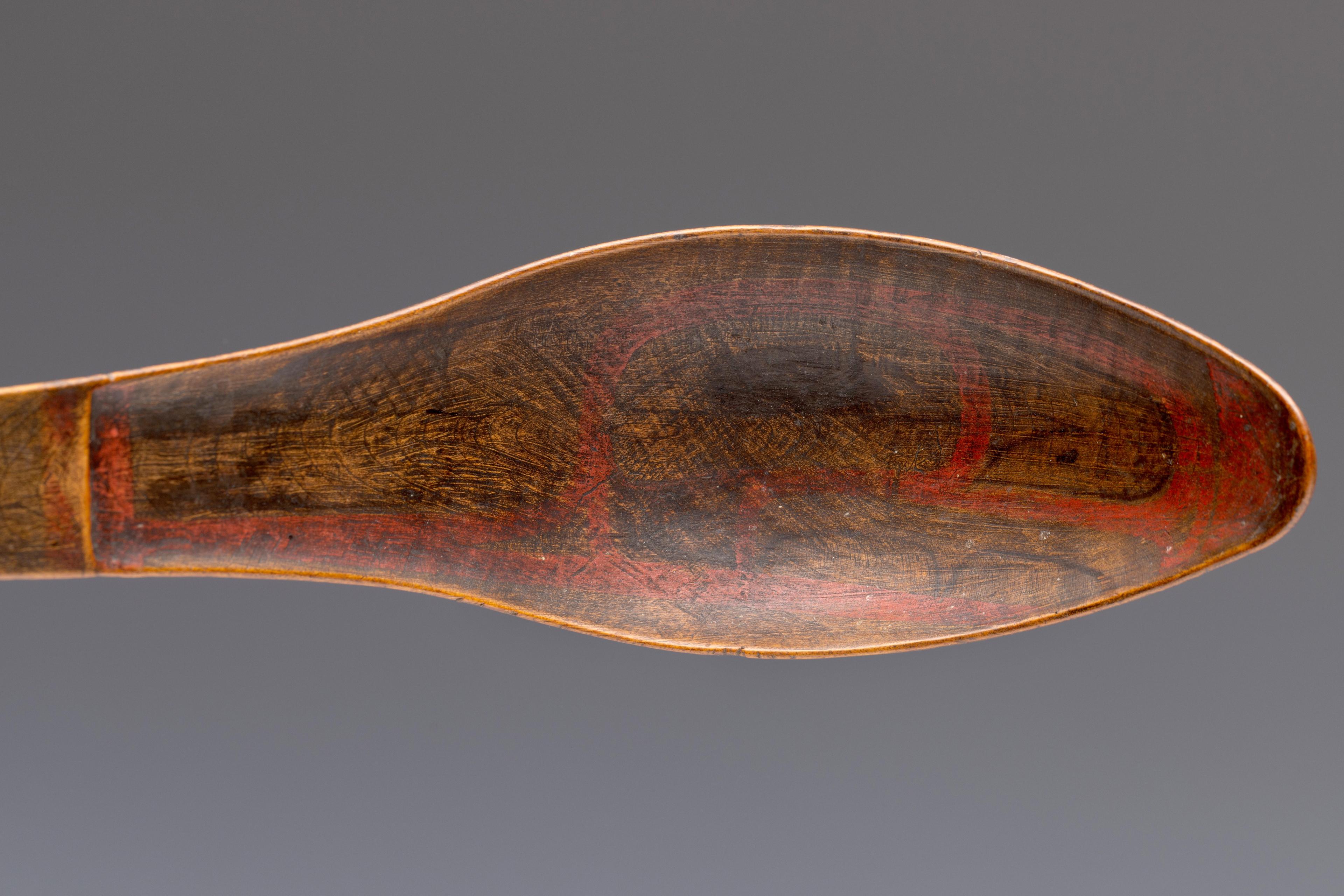 the interior of the scoop decorated with a zoomorphic pattern in black and red.