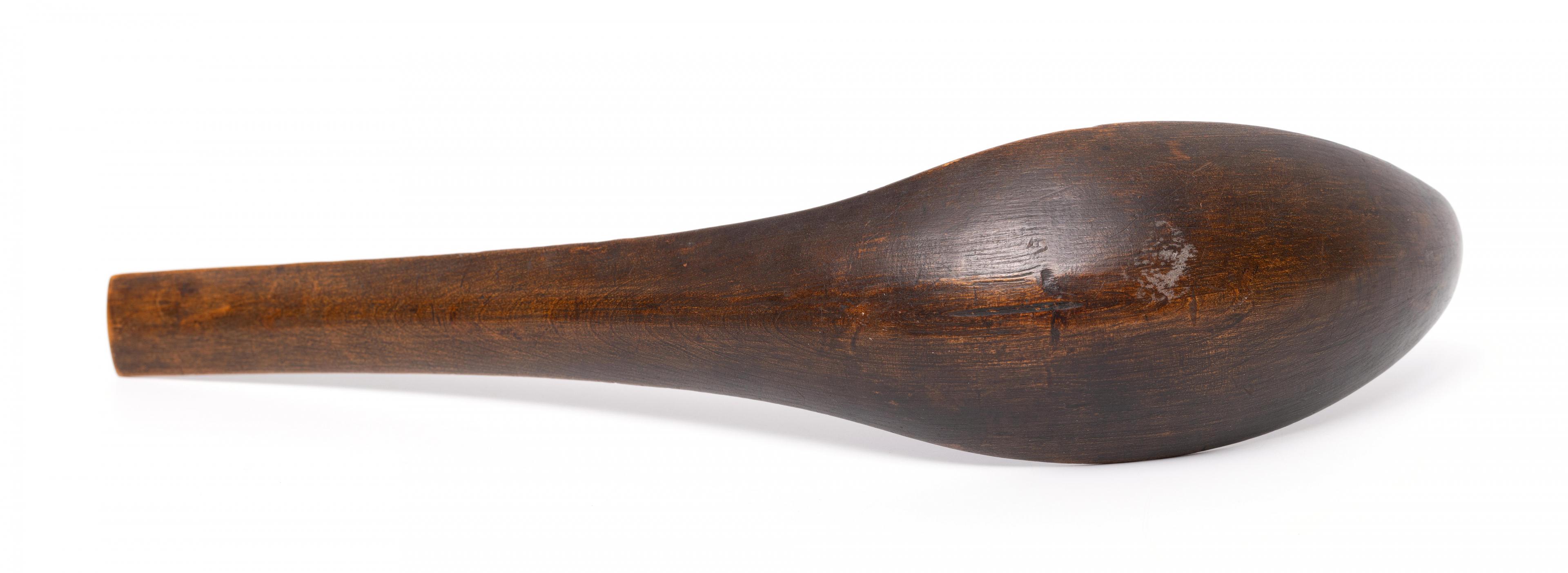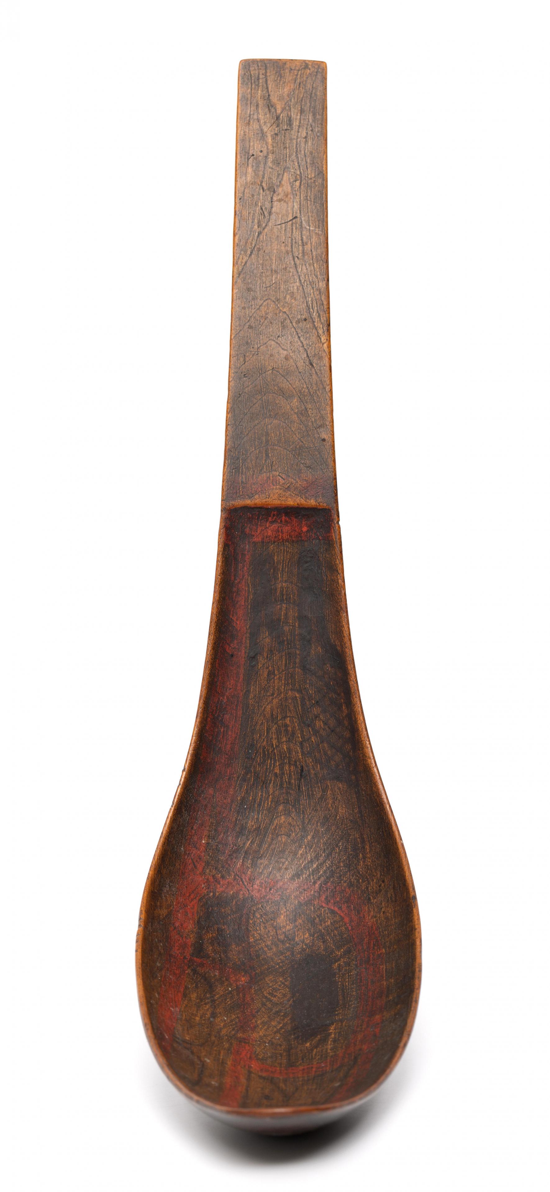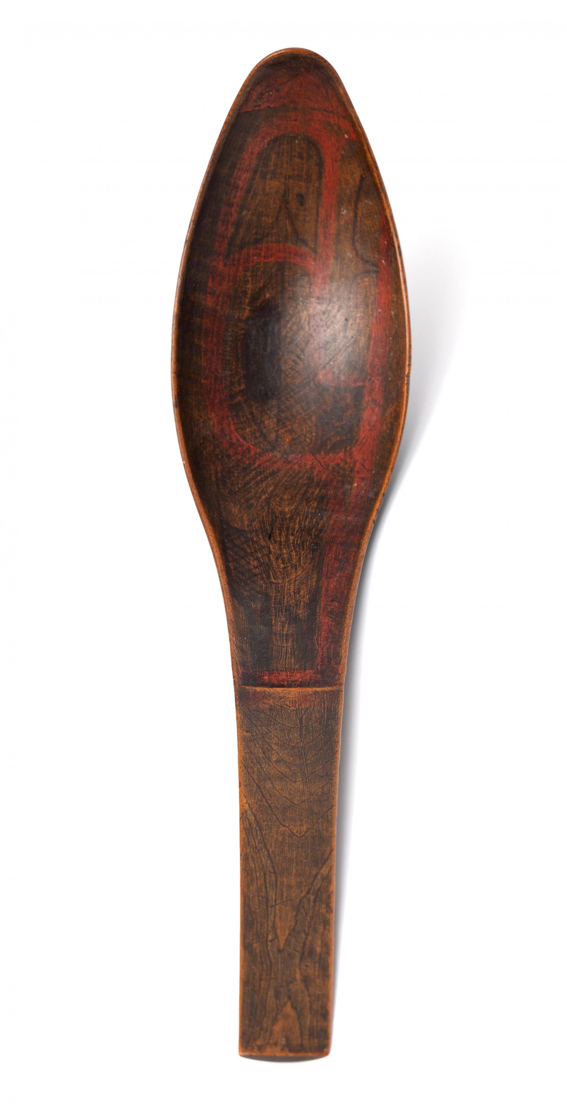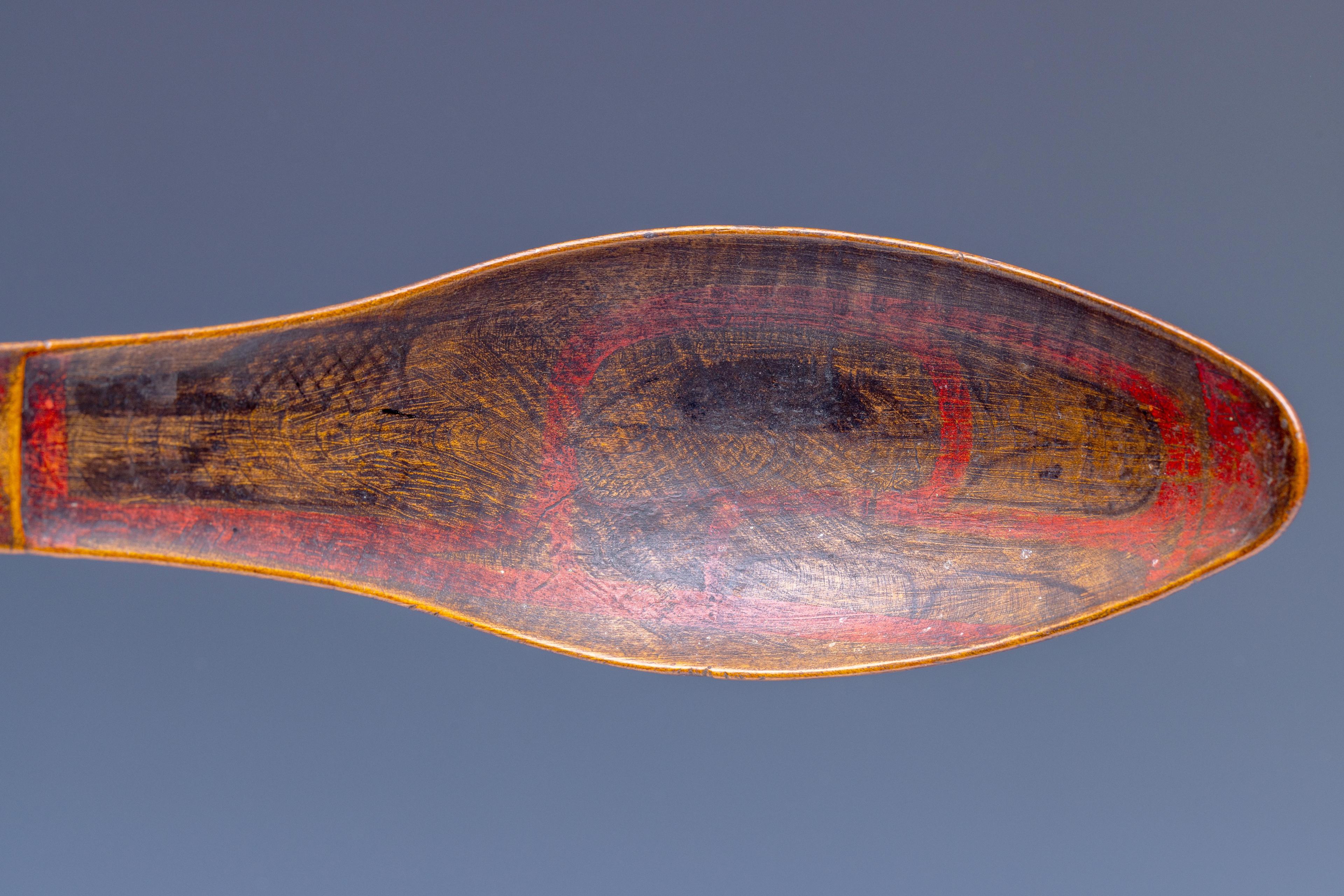 the interior of the scoop decorated with a zoomorphic pattern in black and red.