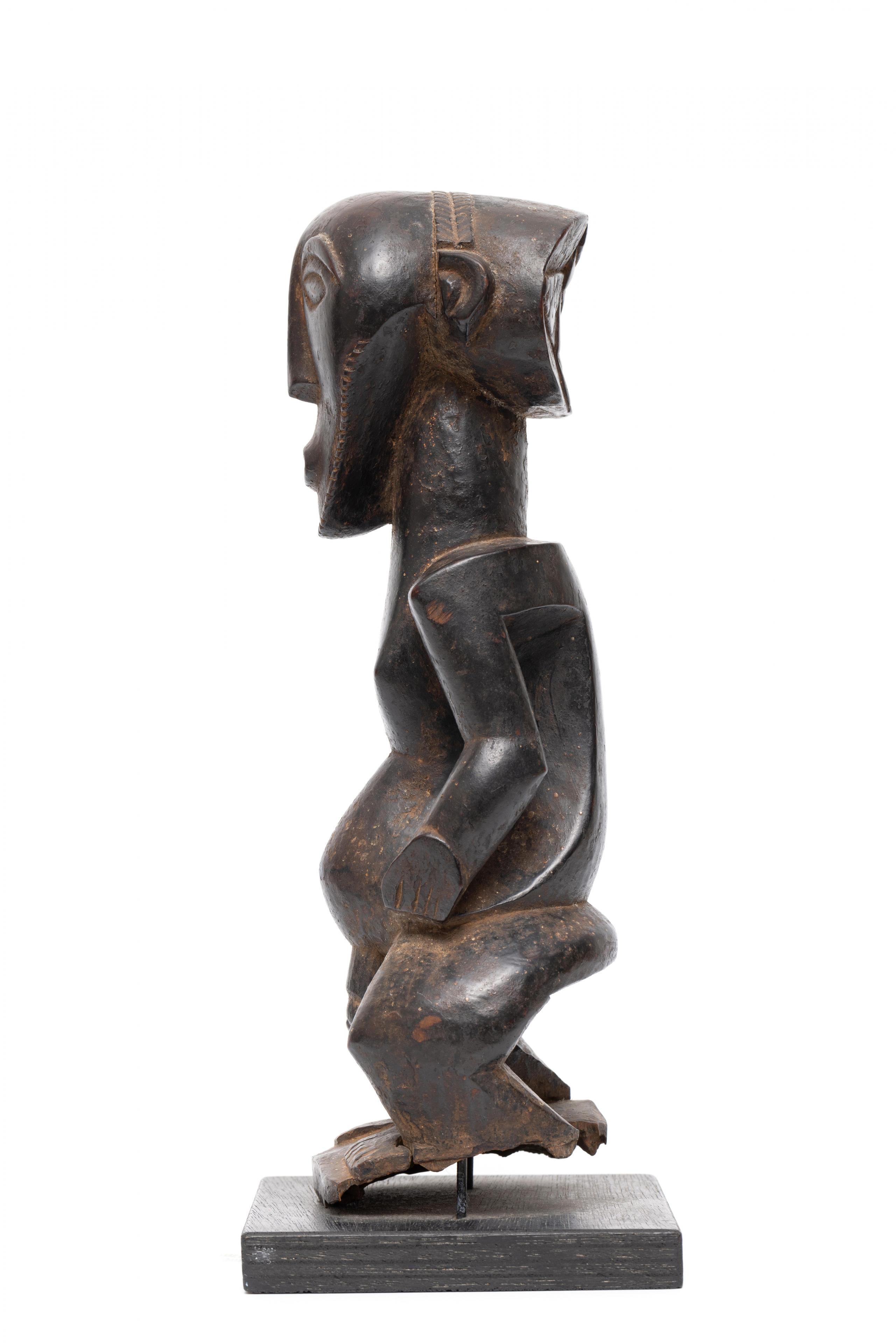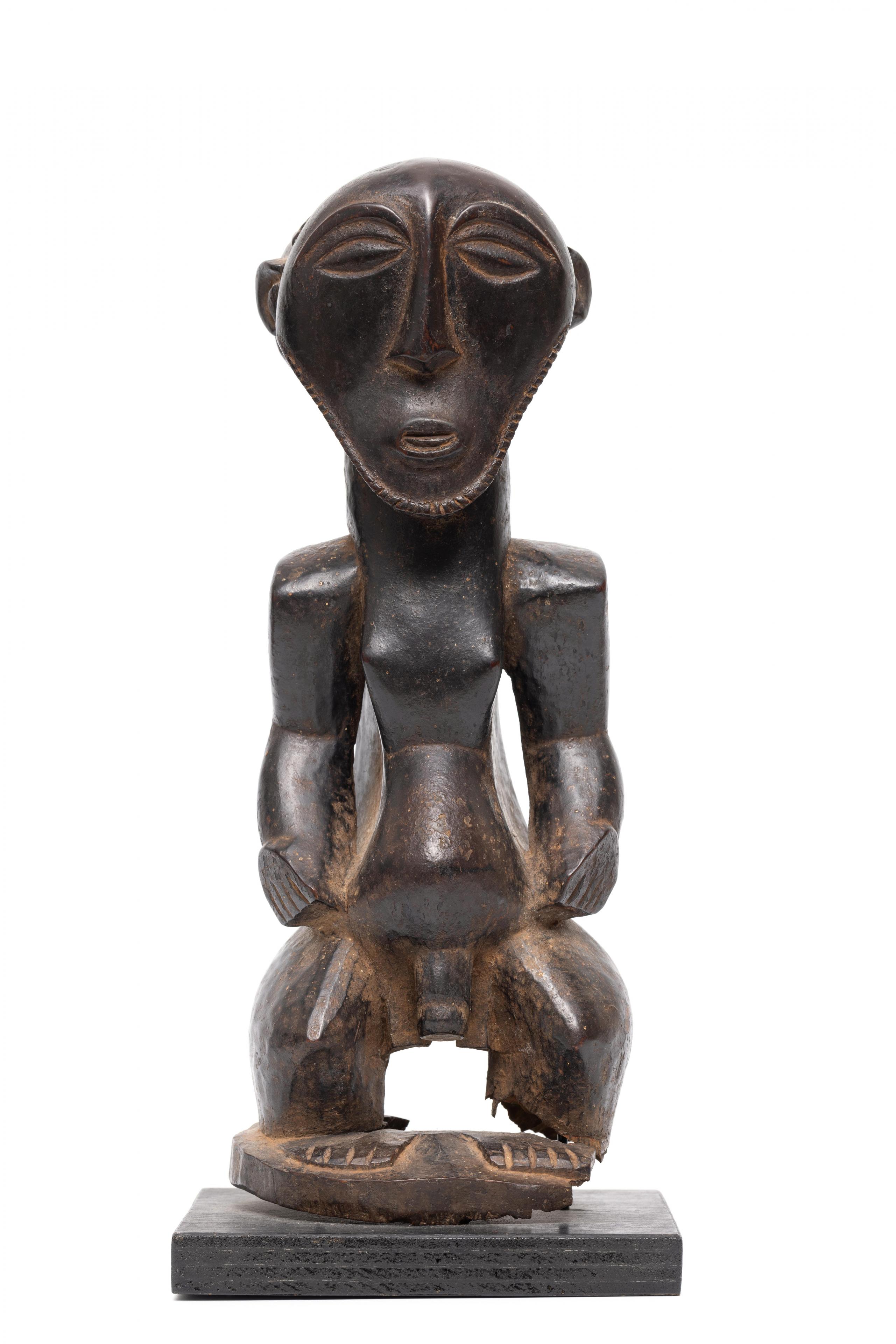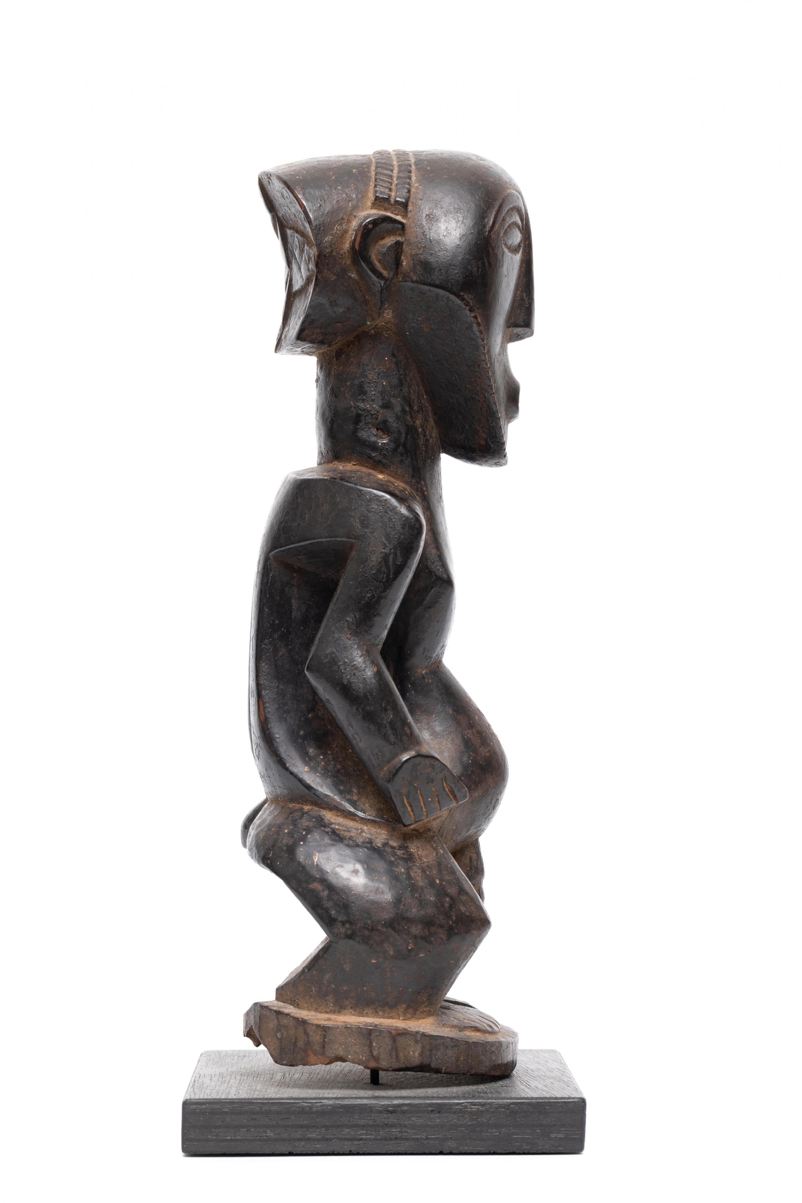 male figure with beard, in a squat stance, well proportioned free carved arms flanking the narrow torso, and short legs. Old black patina.