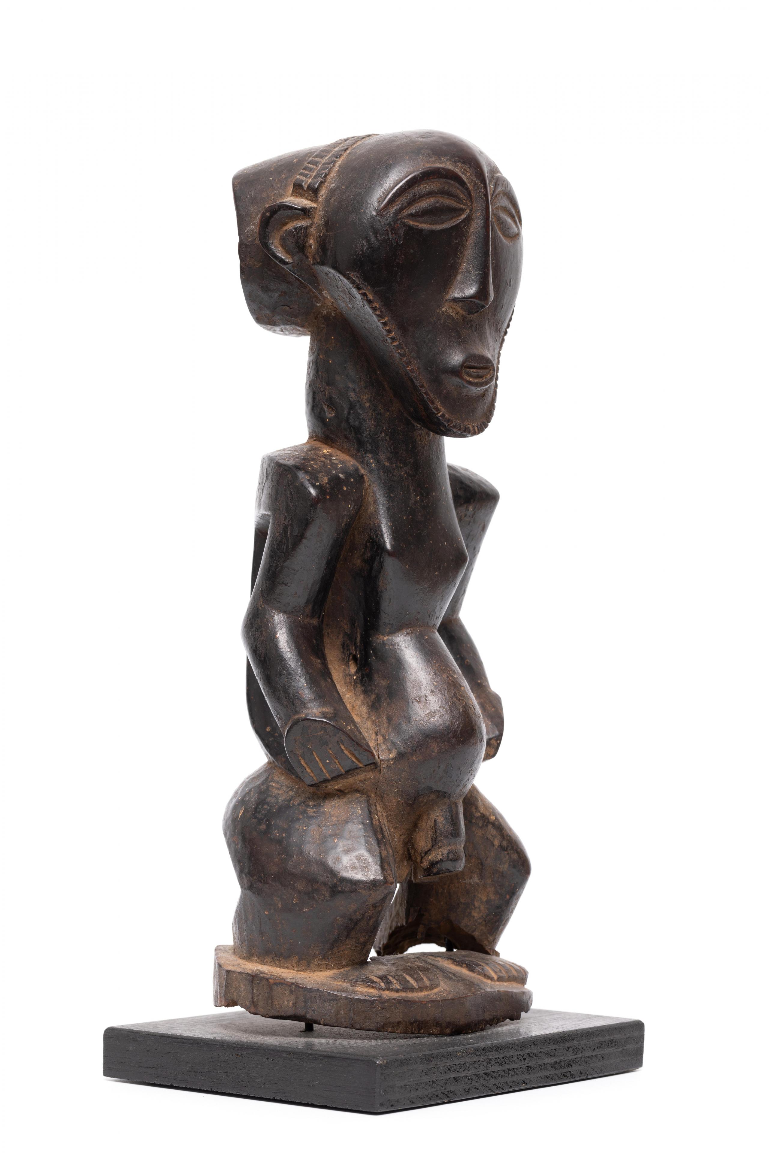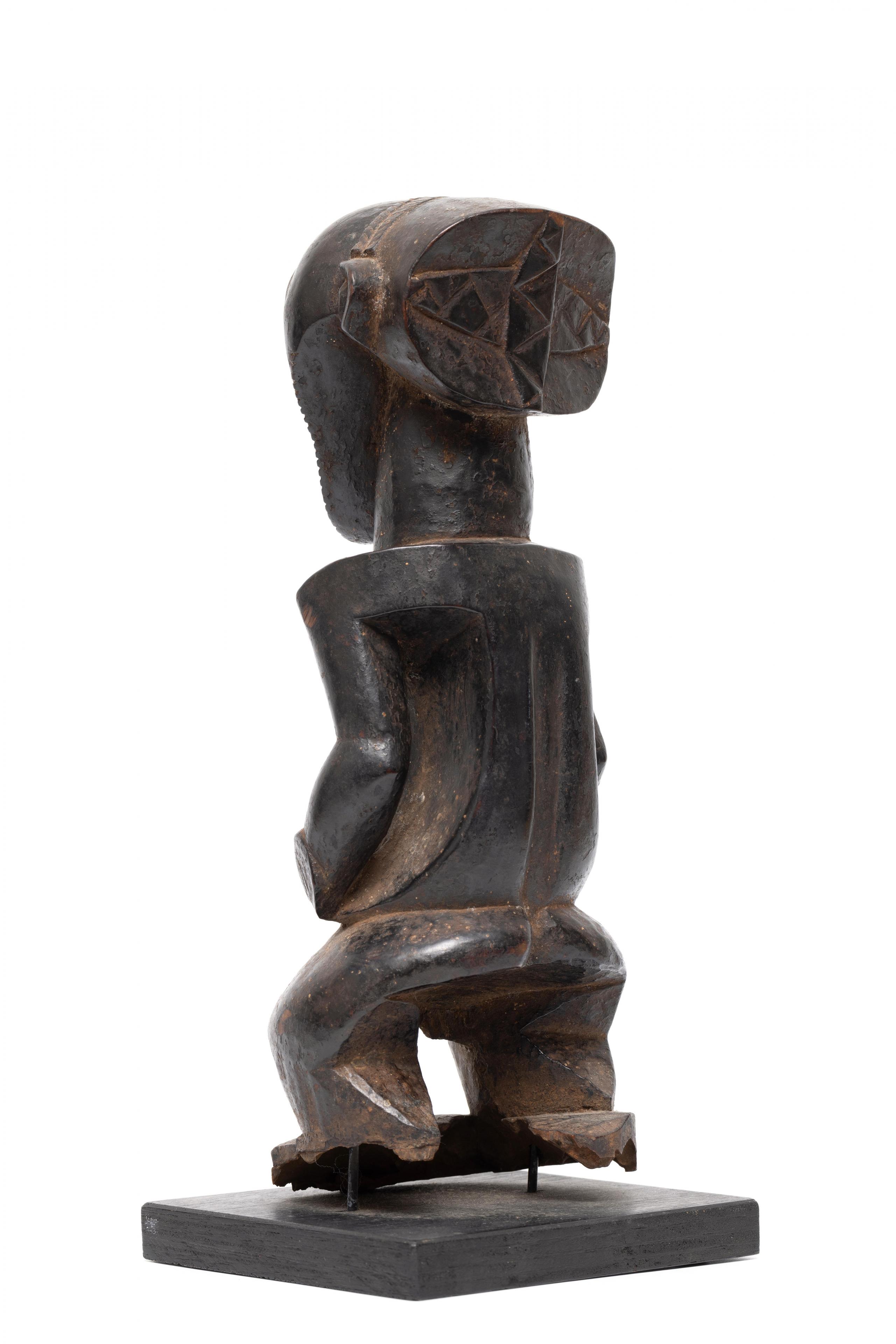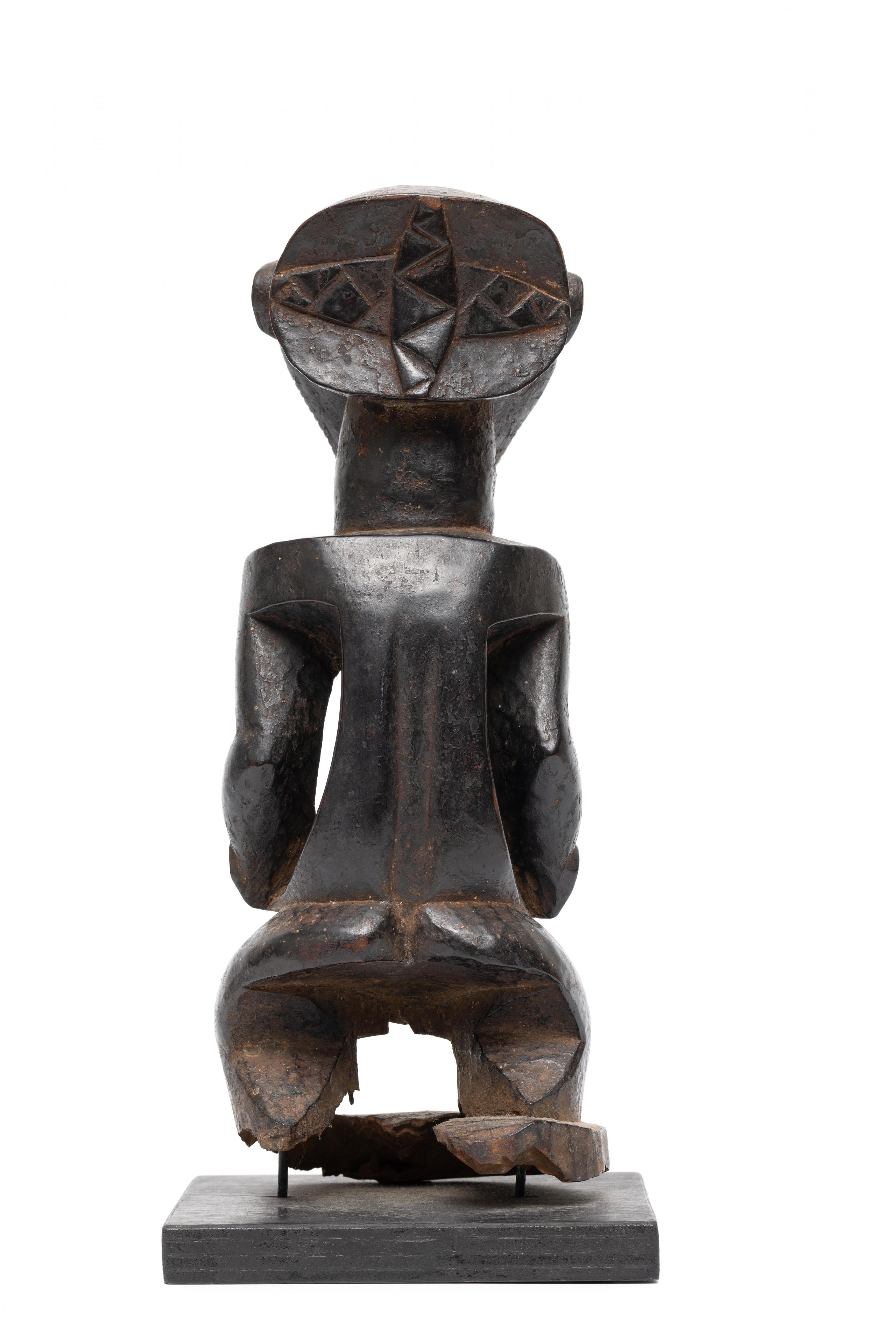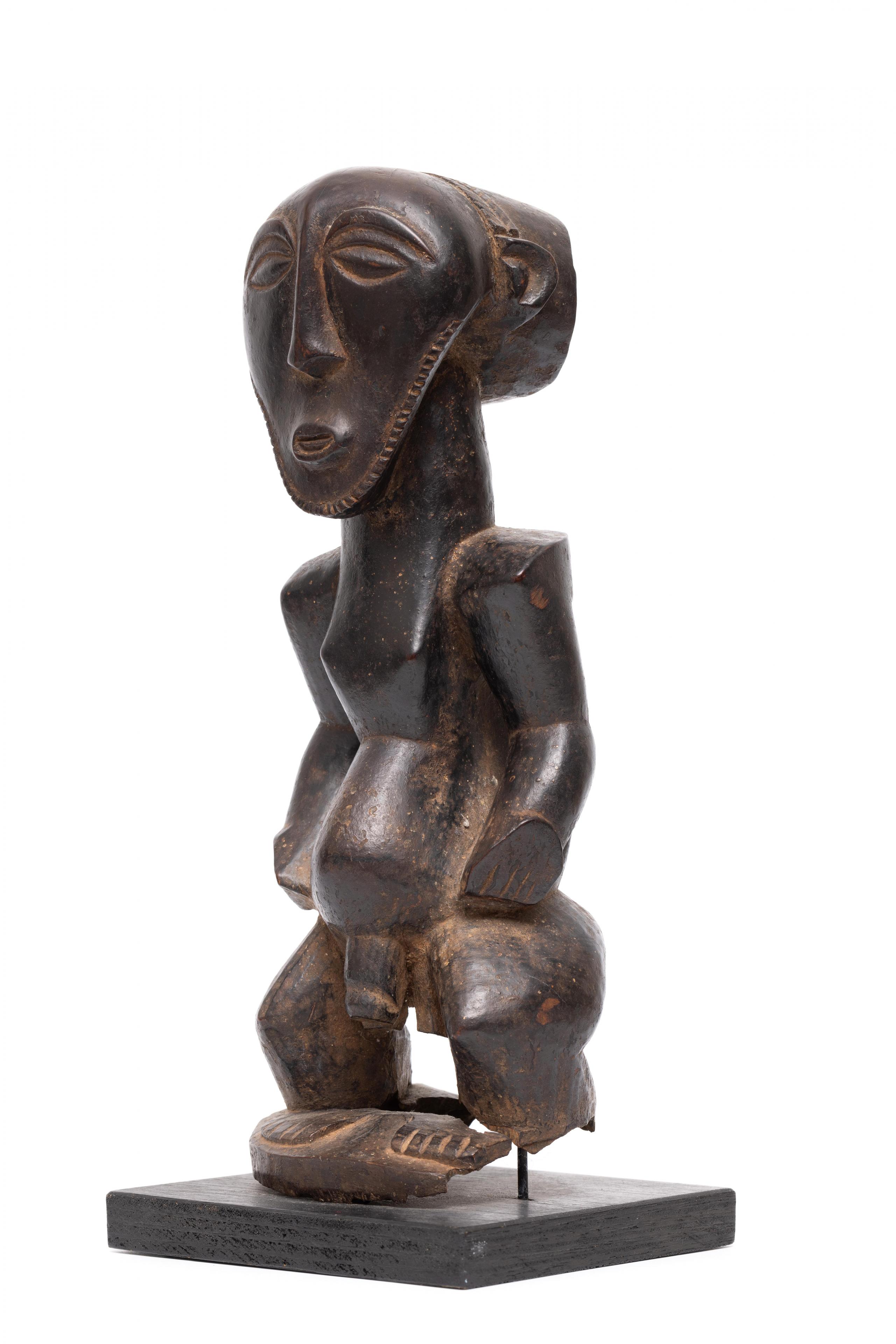male figure with beard, in a squat stance, well proportioned free carved arms flanking the narrow torso, and short legs. Old black patina.