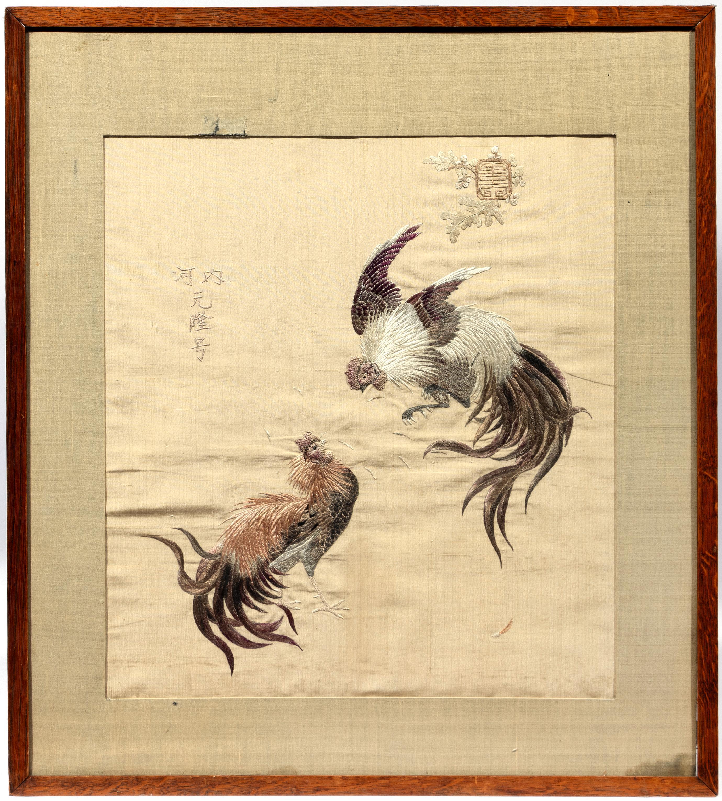 depicting two fighting cockerels, embroidered with seal and calligraphy, framed