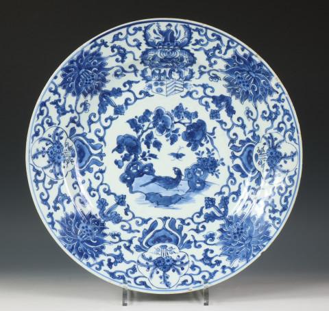 the centre painted with a pheasant, encircled by lotus heads and scroll at the rim, the top with the coat-of-arms of Pelgrom, the base with conch shell mark (some rim chips, some retouched rim chips)