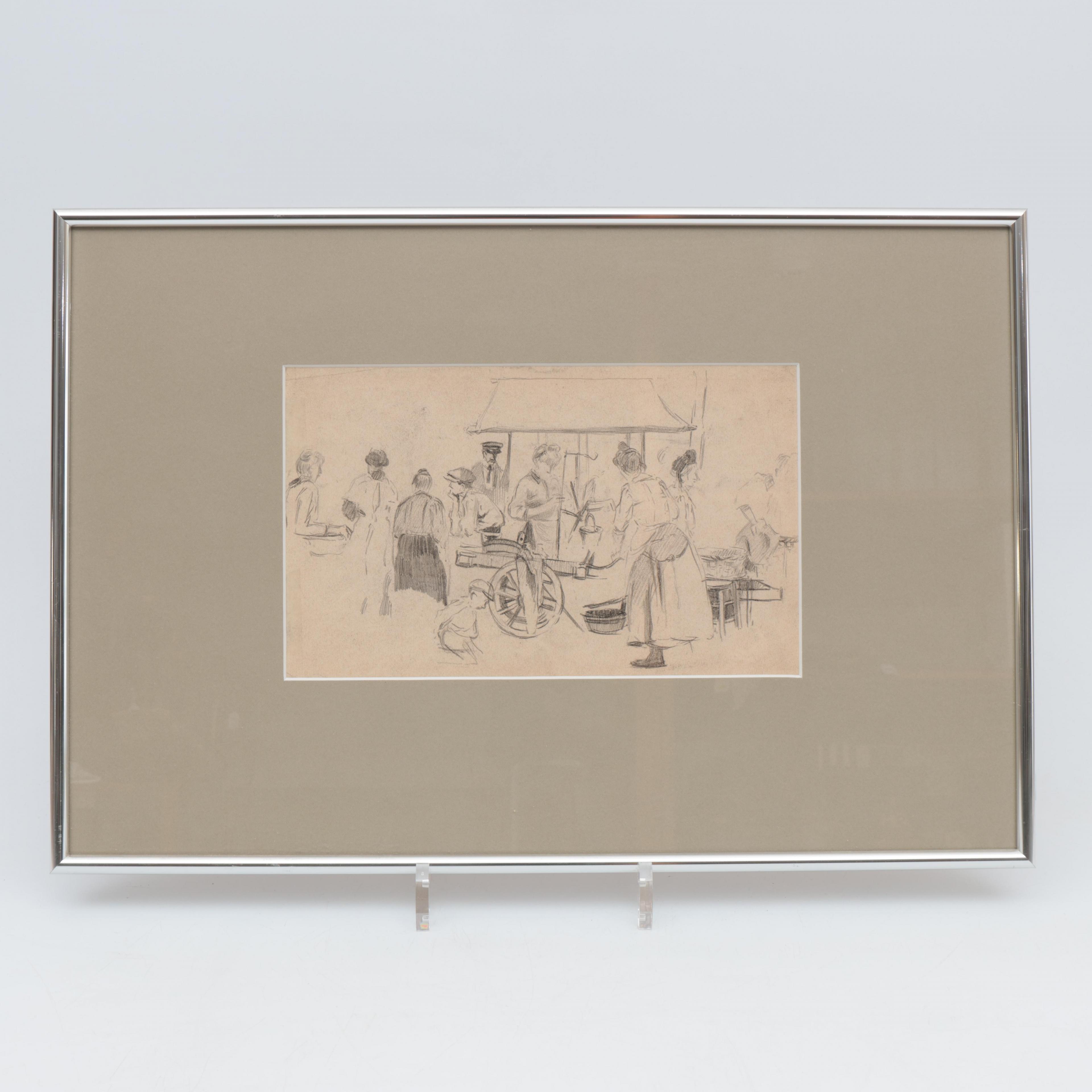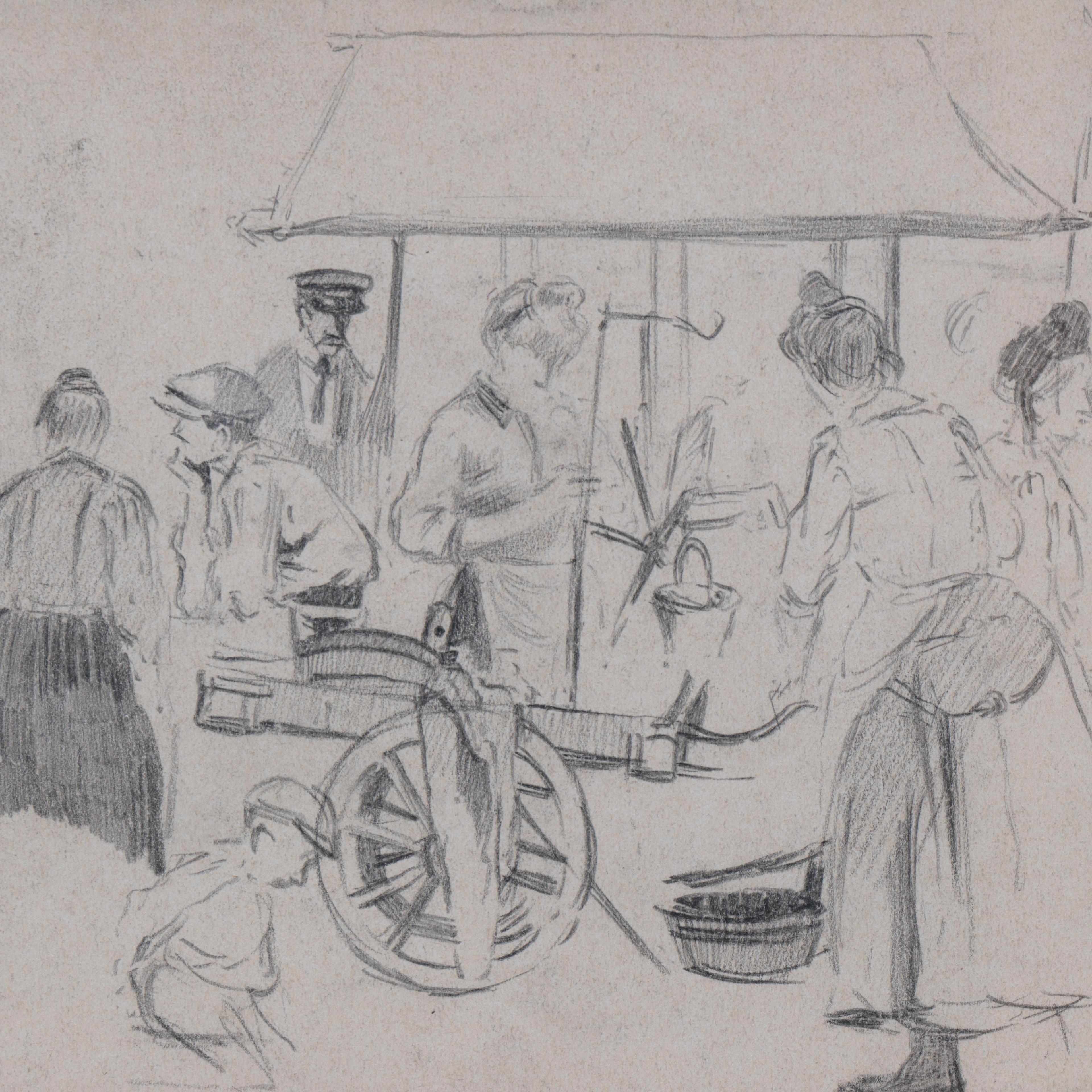 Vrouw op het strand / Figuren bij een marktkraam / Studie van twee mannen