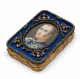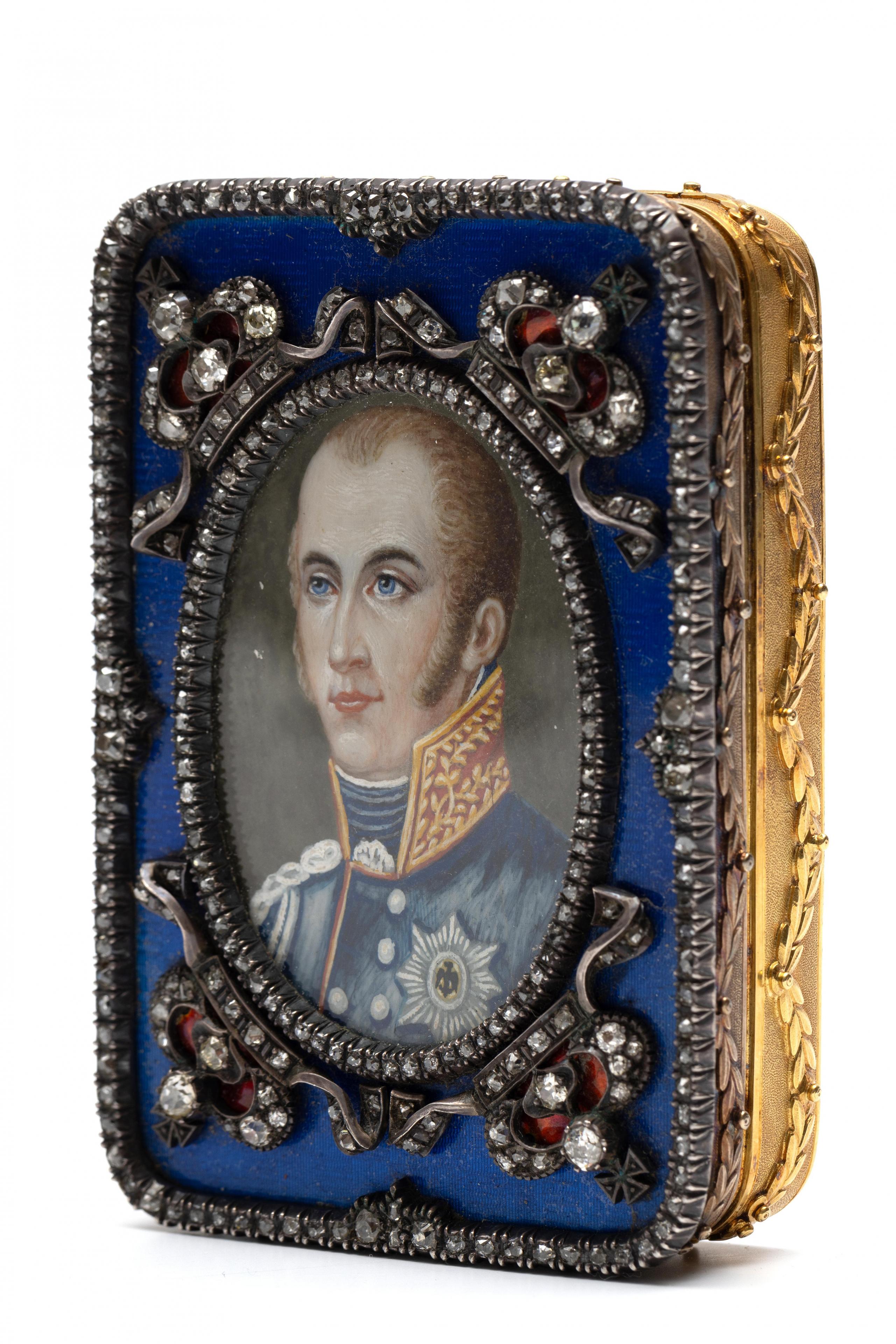 De voorzijde met achter glas, een ovaal miniatuurportret van een Pruisische officier, omlijst door kleine oud briljant geslepen diamanten, met op de vier hoeken een kroon bezet met oud briljant geslepen diamant, de binnenzijde met rood email. Tegen een fond van helder blauwe guilloche email, wederom omlijst door oud briljant geslepen diamanten. Totaal diamant gewicht ca. 4,5 ct. De zijkanten met een decor van guirlandes, de achterzijde met gekroond monogram T.R.I., omlijst door guirlandes.