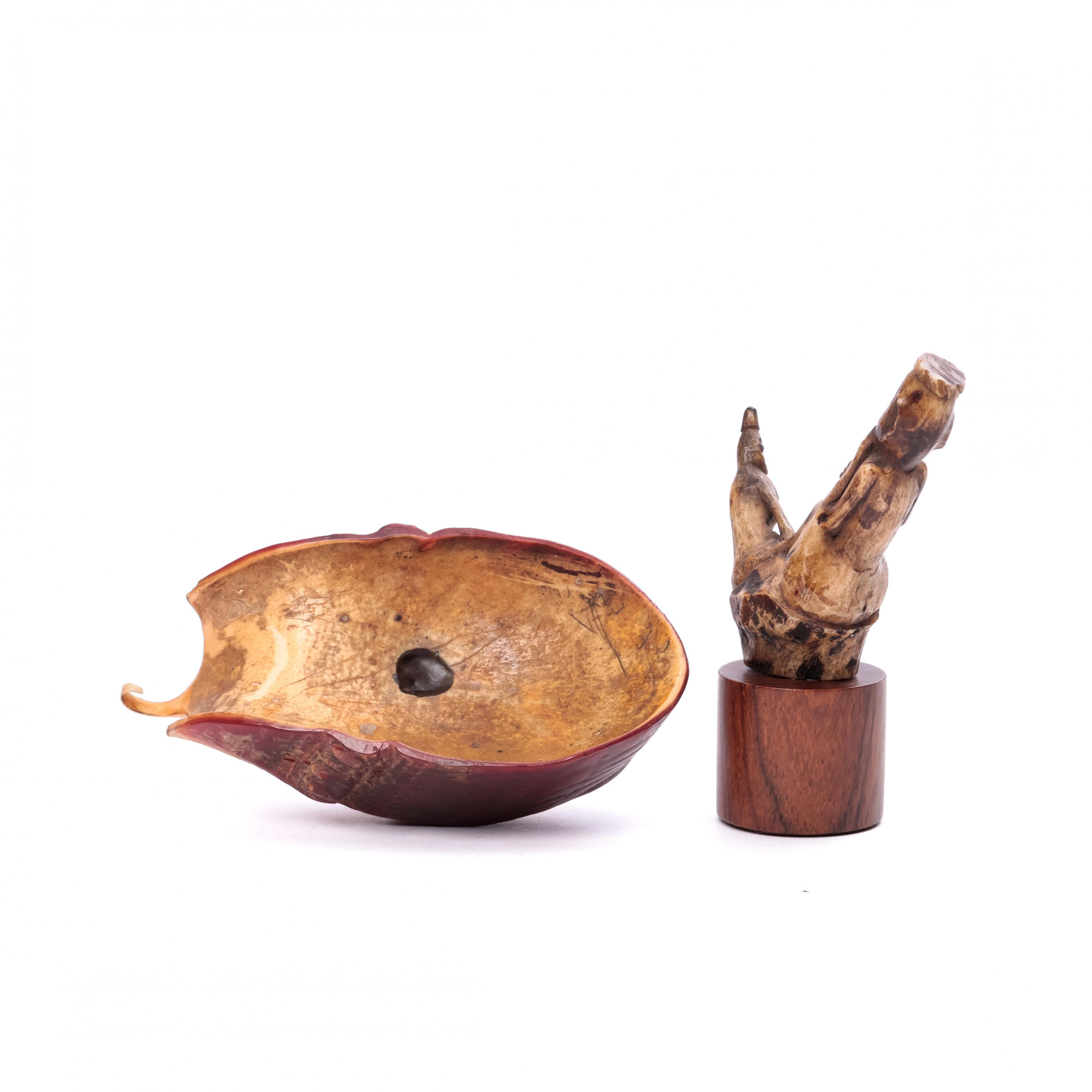 of hornbill ivory showing a demon head and a coloured stone in the centre; herewith a deer horn amulet with two figures.