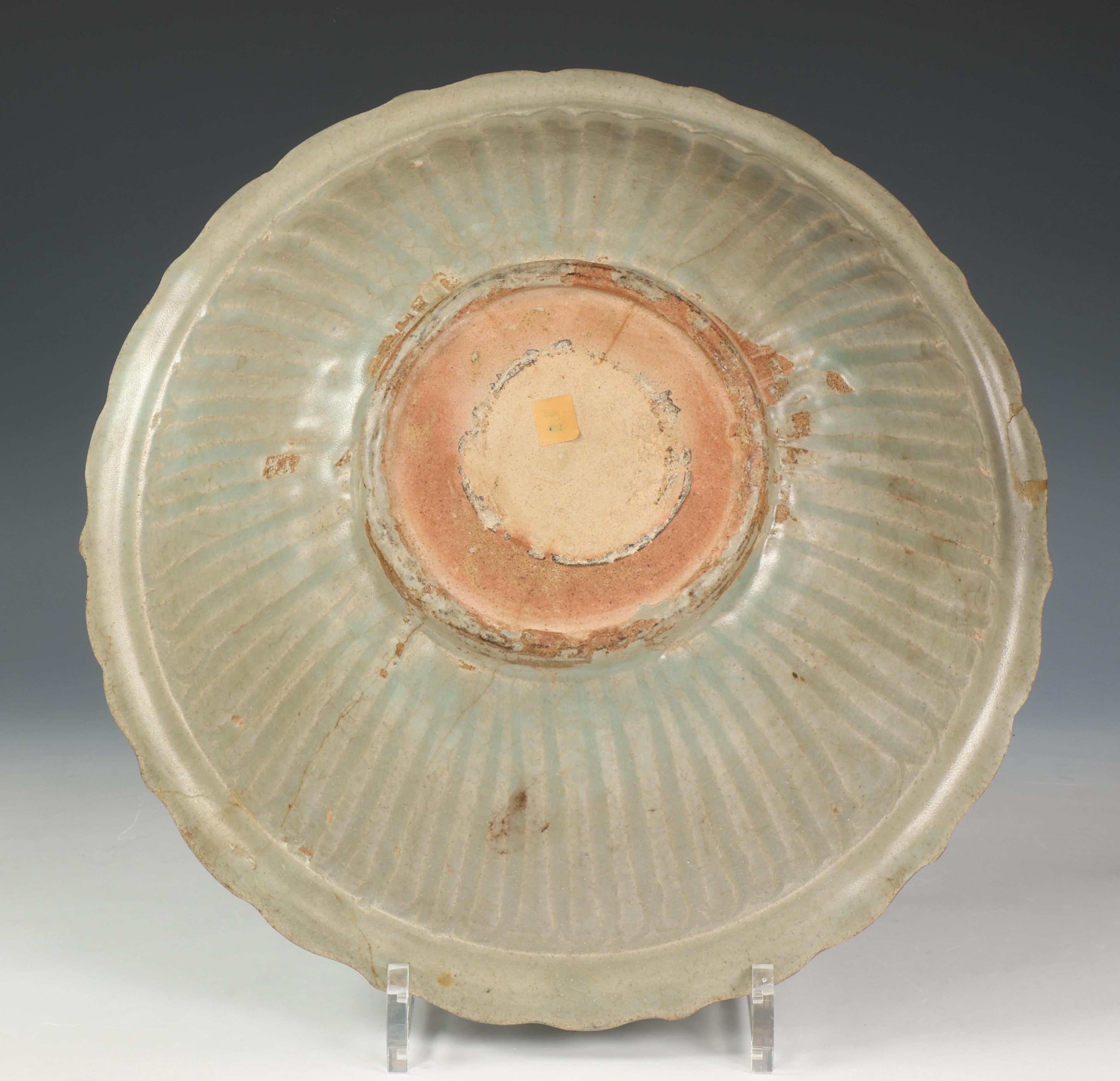 moulded with ribbed exterior sides and flower-shaped rim, the interior incised with flowing decoration, covered with a sea-green glaze (reglued rim chip of ca. 3 x 9 cm, some cracks, crackled glaze)
