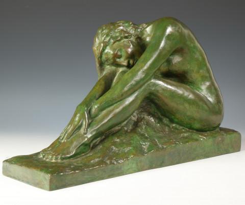 Mme de Pelleport, groen gepatineerd bronzen beeld, rustend vrouwelijk naakt,
