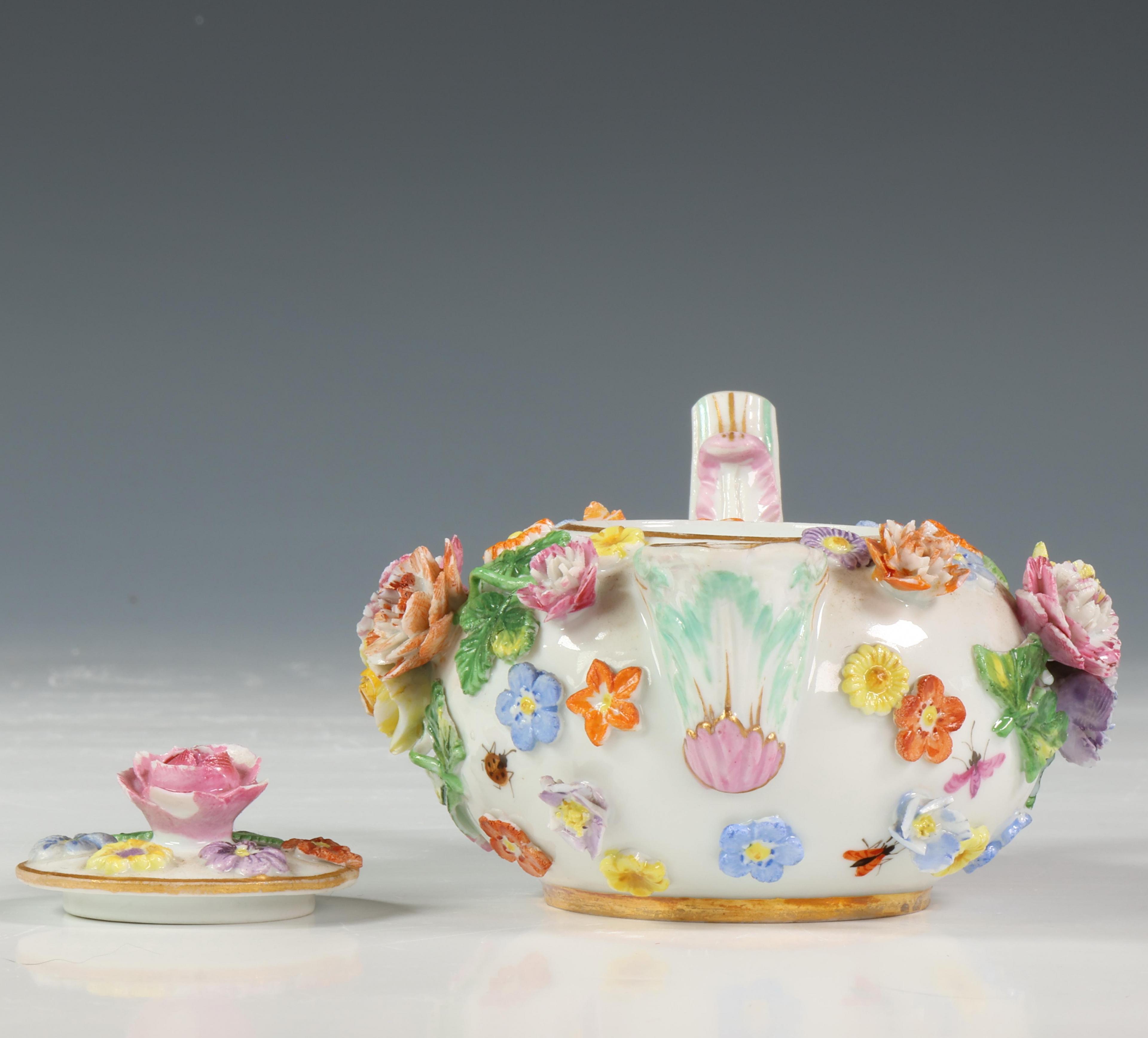 de buik met insecten beschilderd, gemerkt met gekruiste zwaarden in onderglazuur blauw. (de greep ingekort, kleine chips op verscheidene bloem appliques, de tuit en de voetrand)