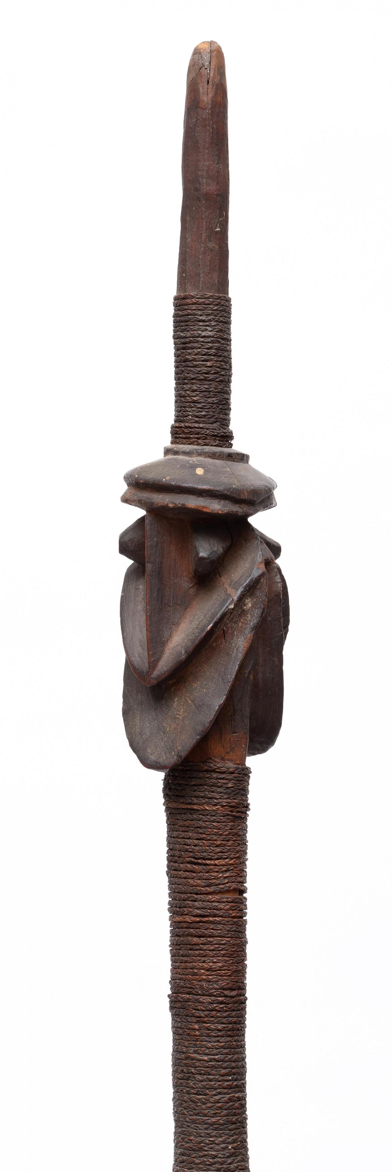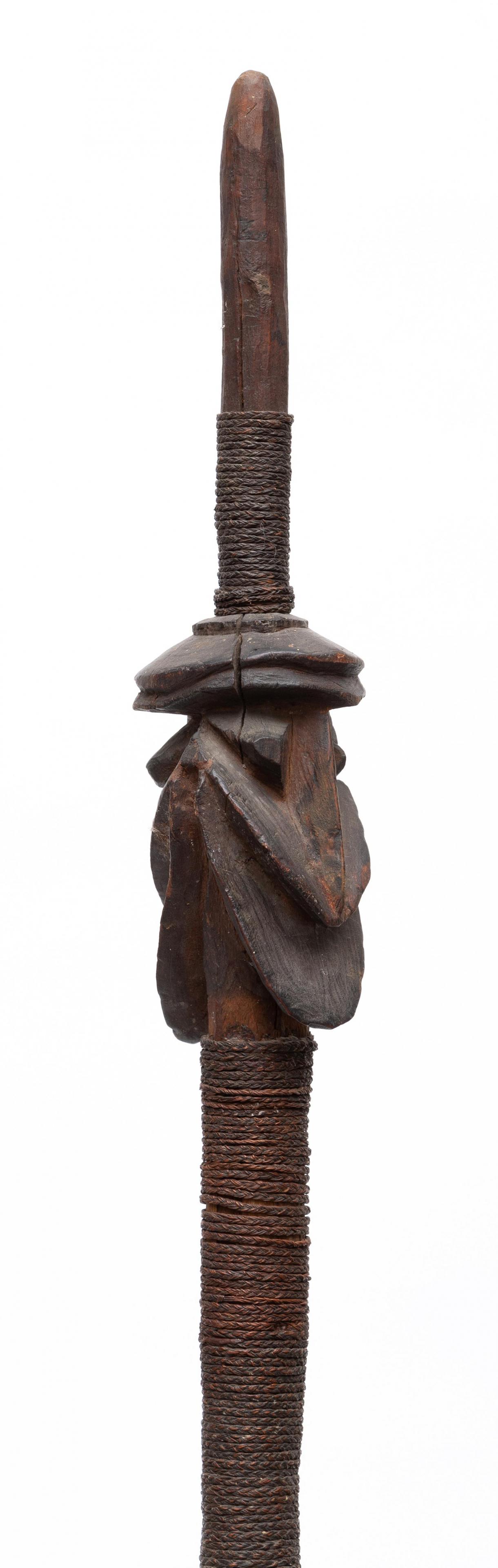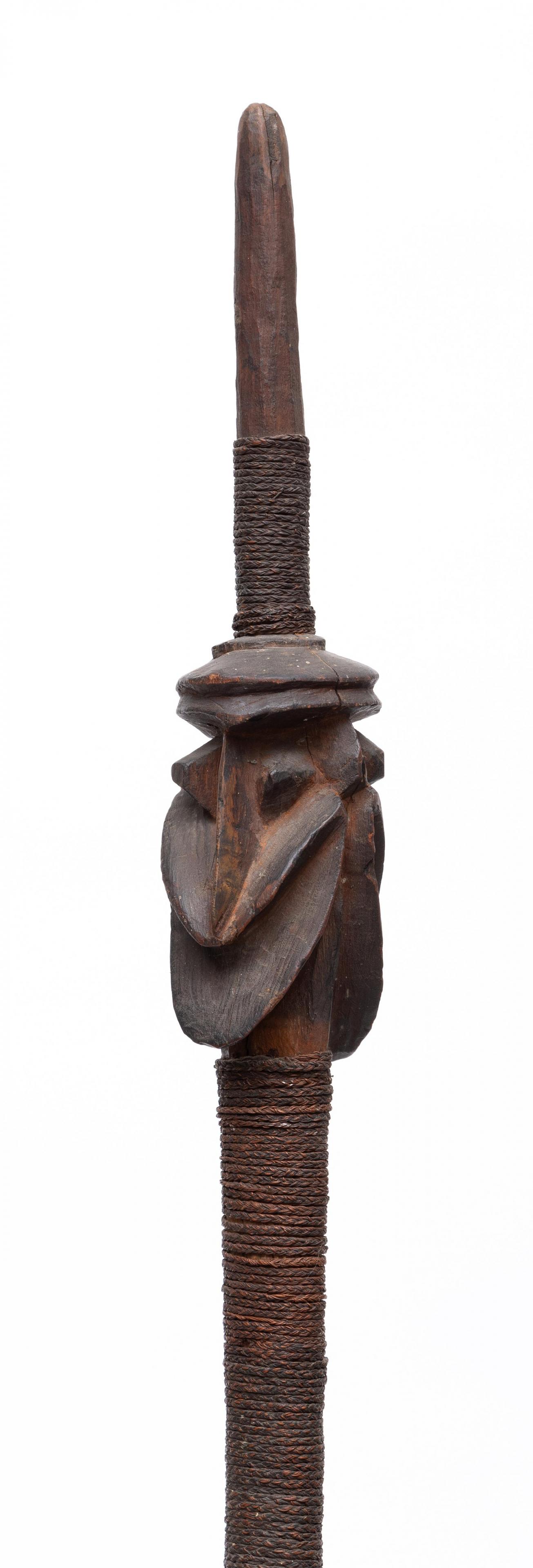 wooden janus head, braided plant fibre bindings, remnants of red pigments.