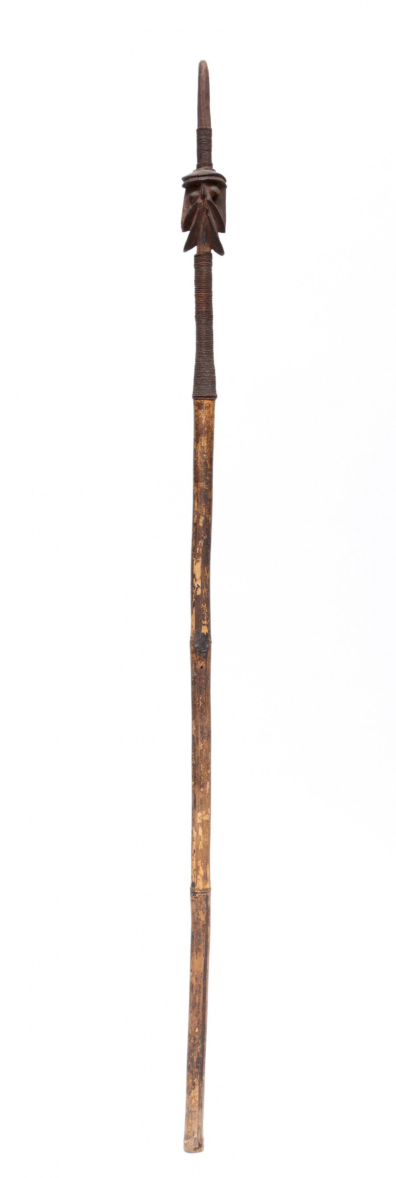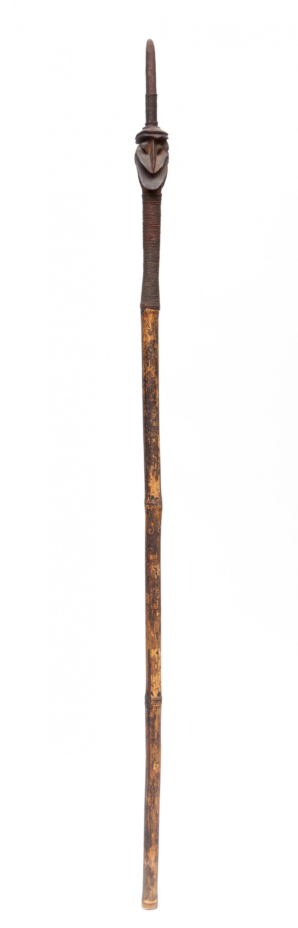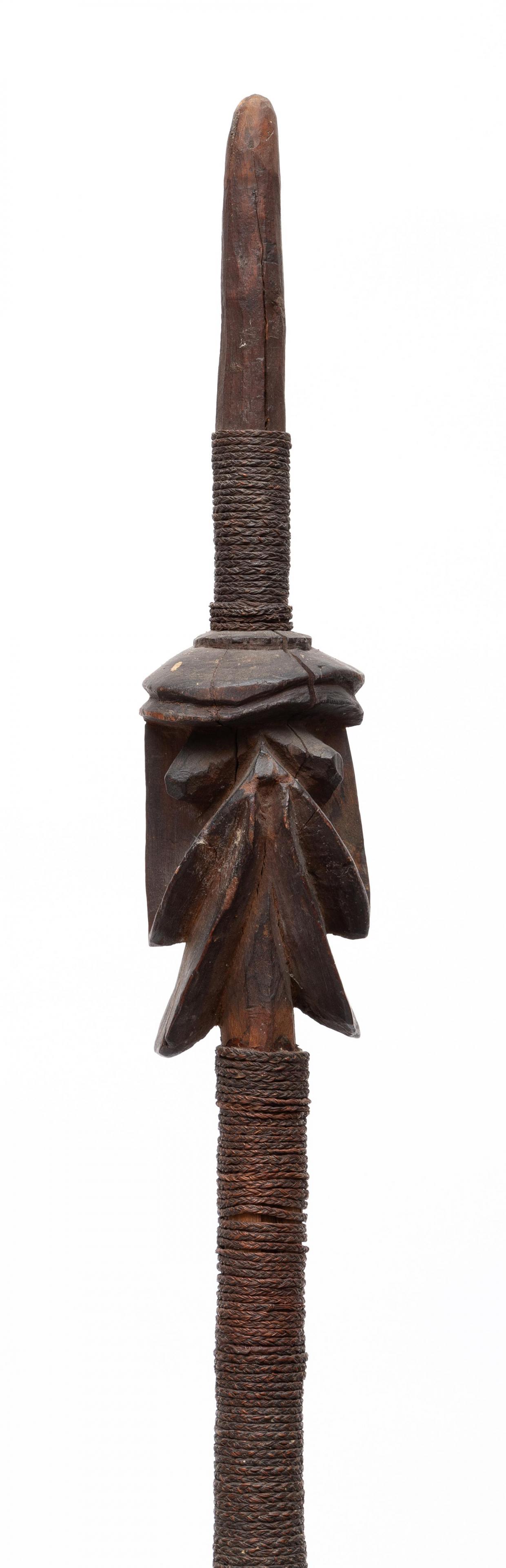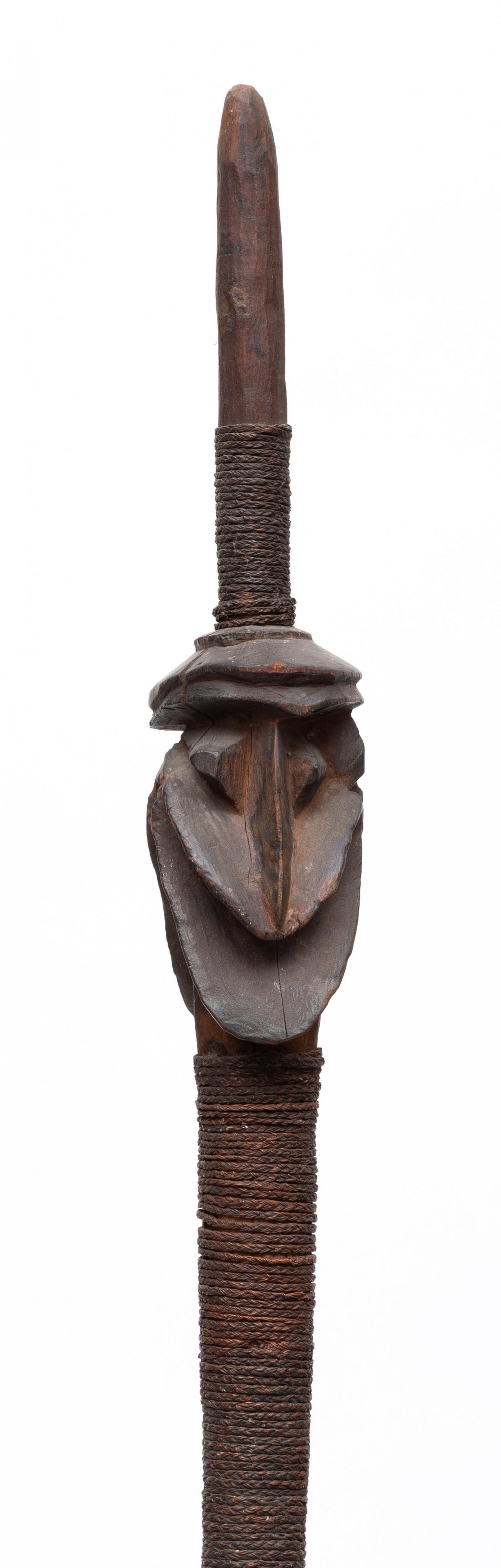wooden janus head, braided plant fibre bindings, remnants of red pigments.