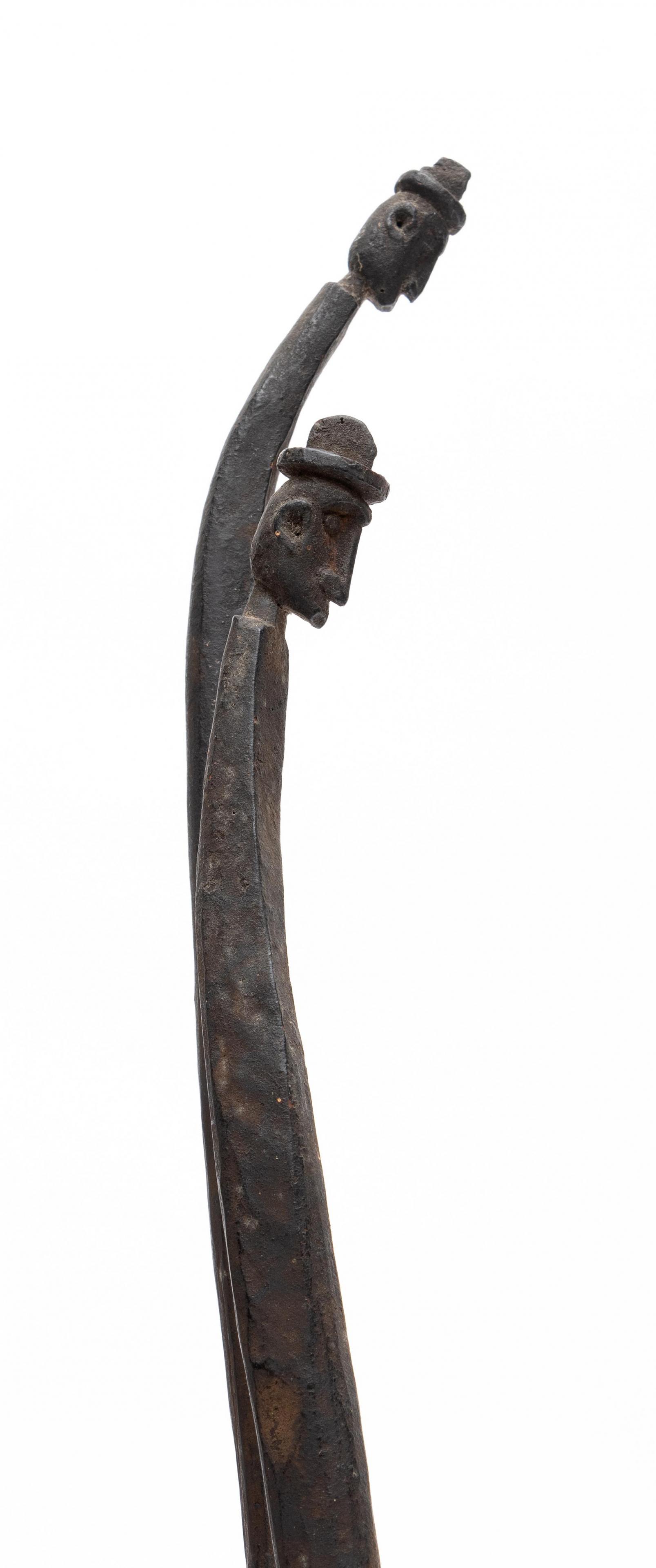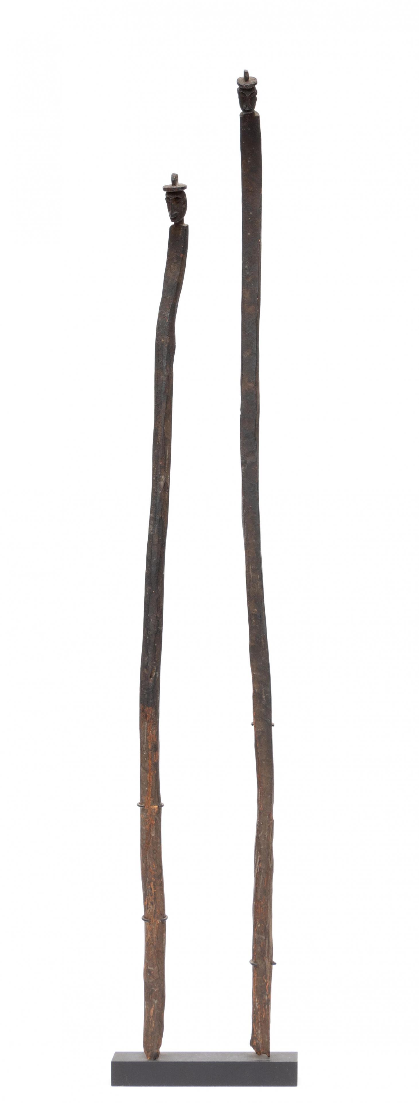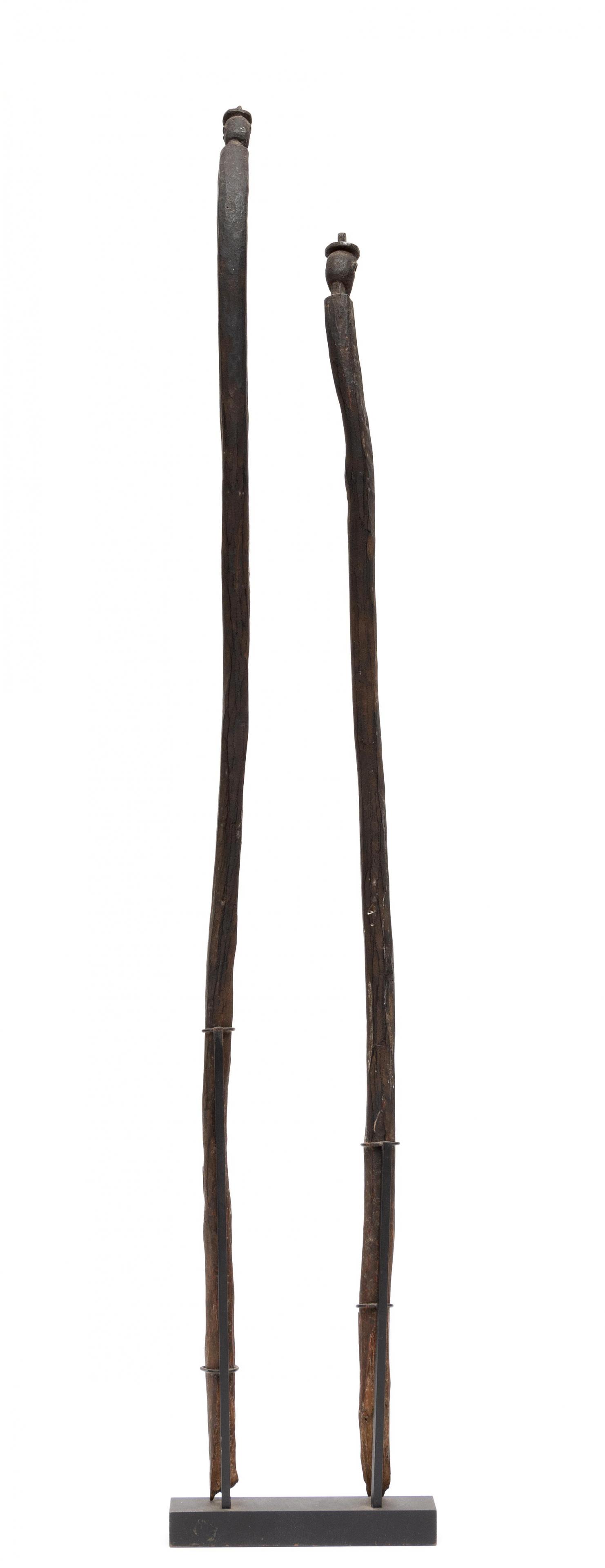 showing anthropomorphic heads on long curved wooden shafts, the upper part angled, the lower part circular following the natural shape of the wood. With black encusted patina,