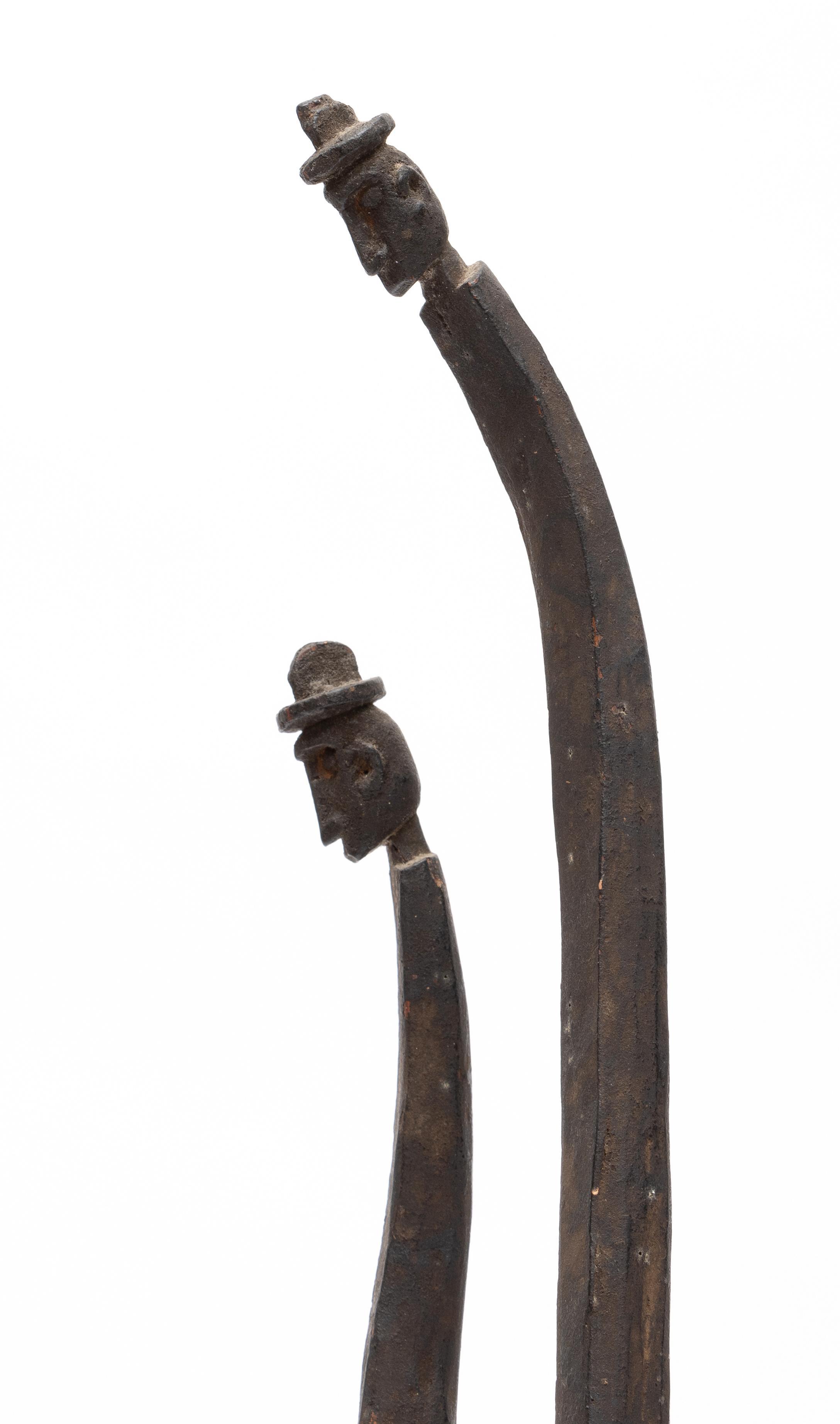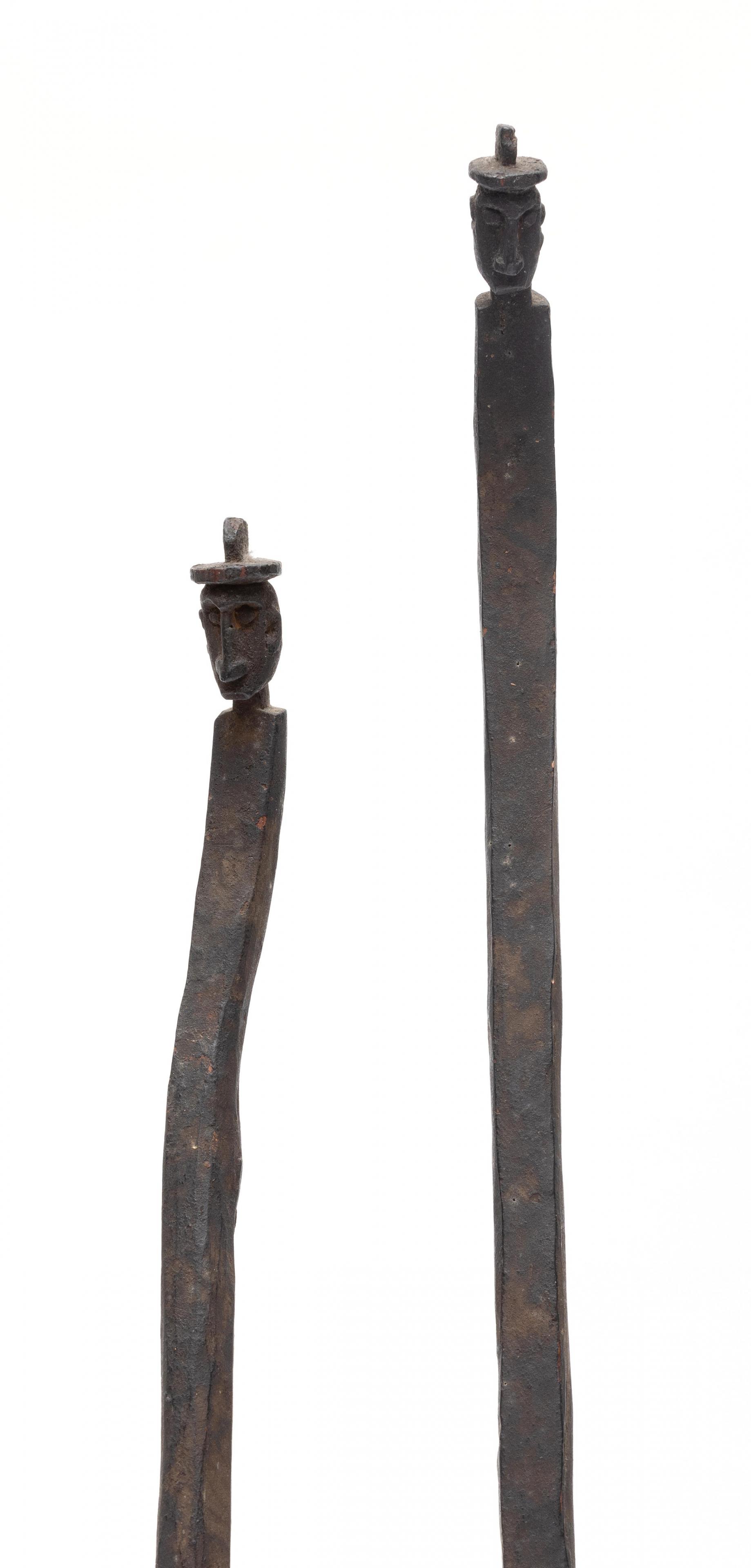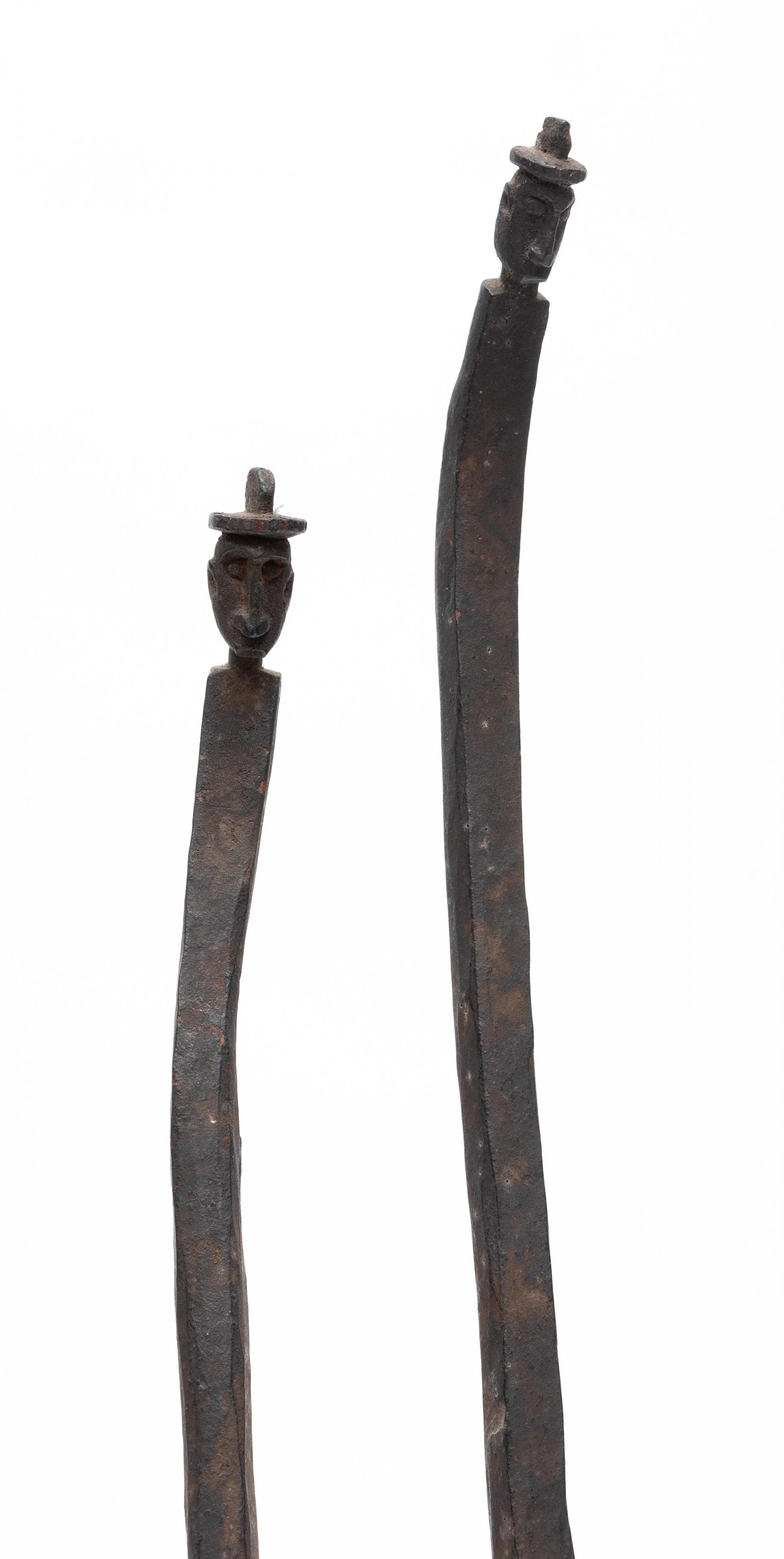 showing anthropomorphic heads on long curved wooden shafts, the upper part angled, the lower part circular following the natural shape of the wood. With black encusted patina,