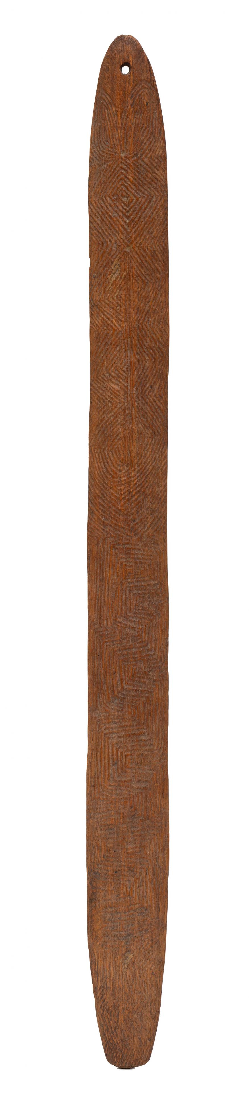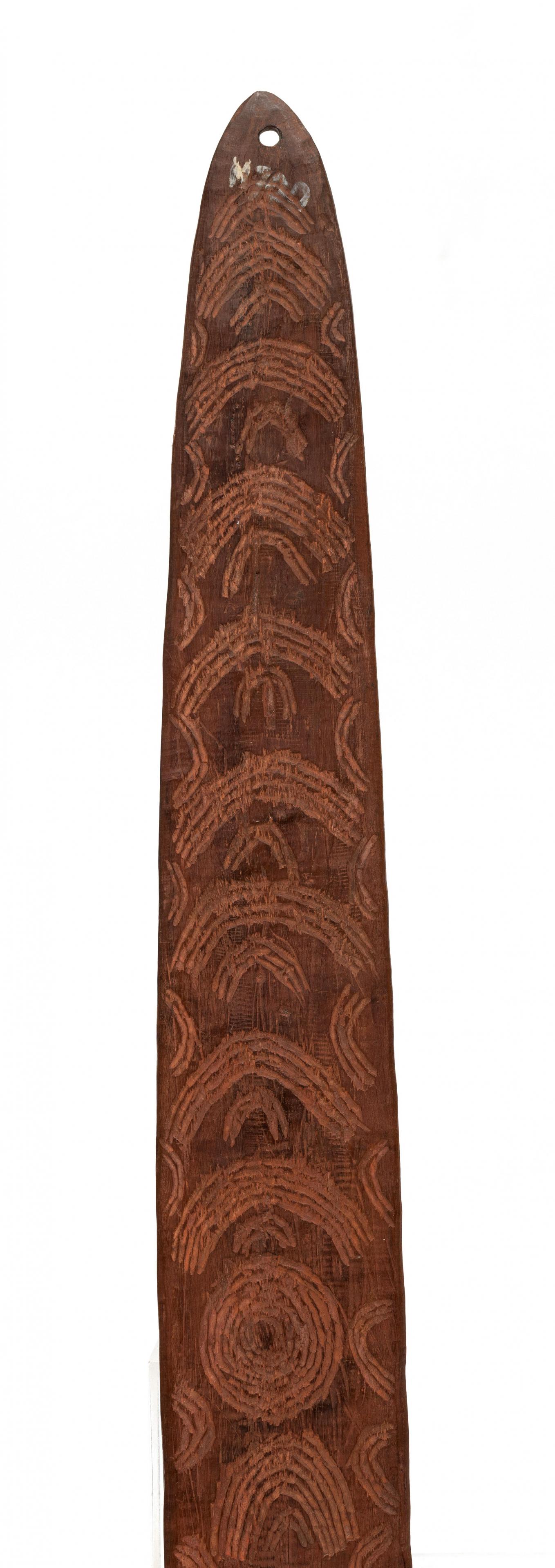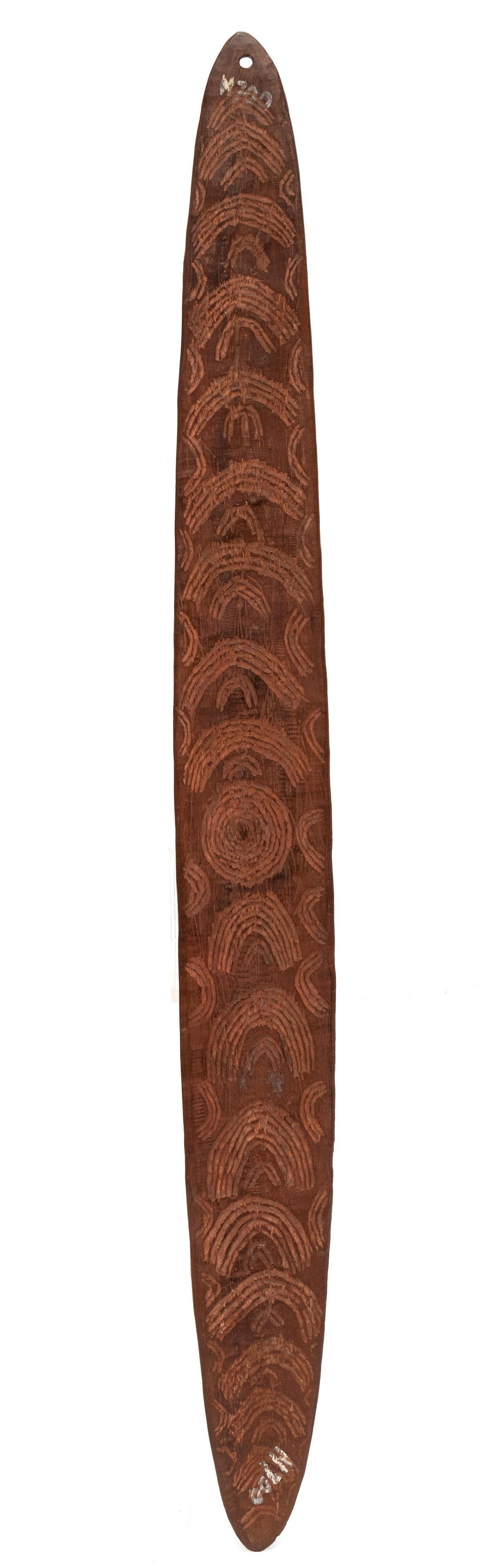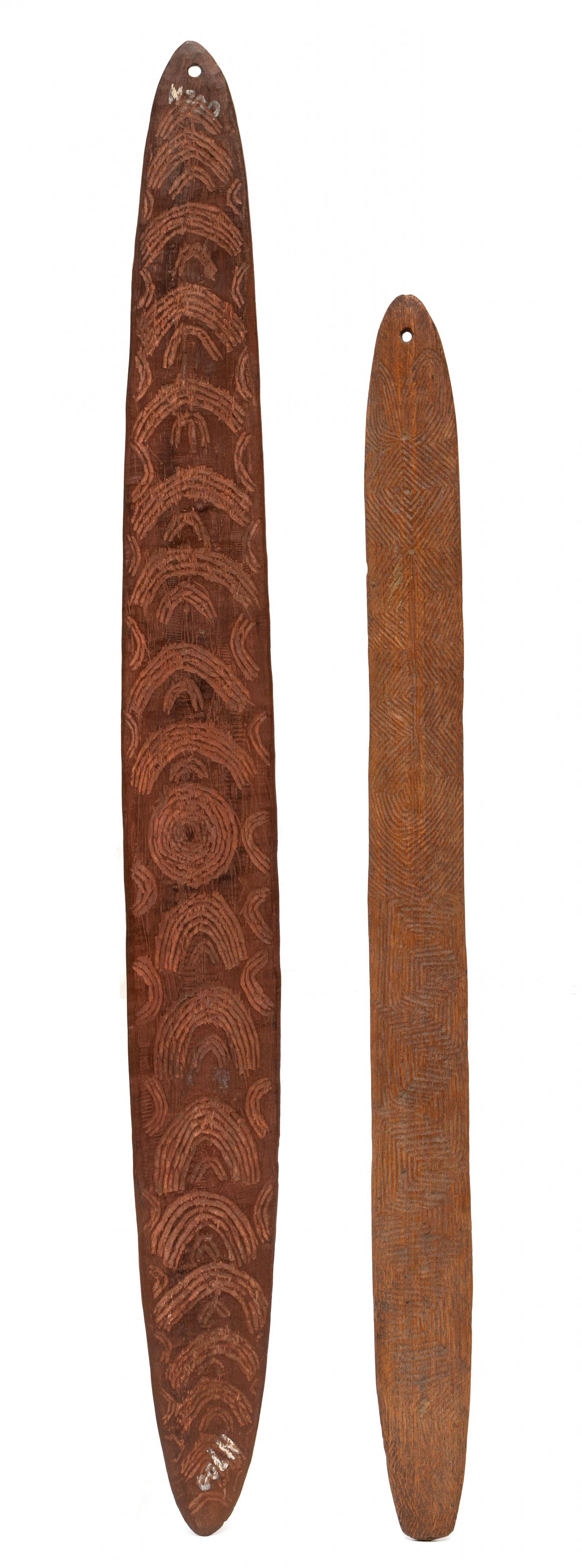 one with reddish patina showing notched design on both sides, the other with a plain reverse.