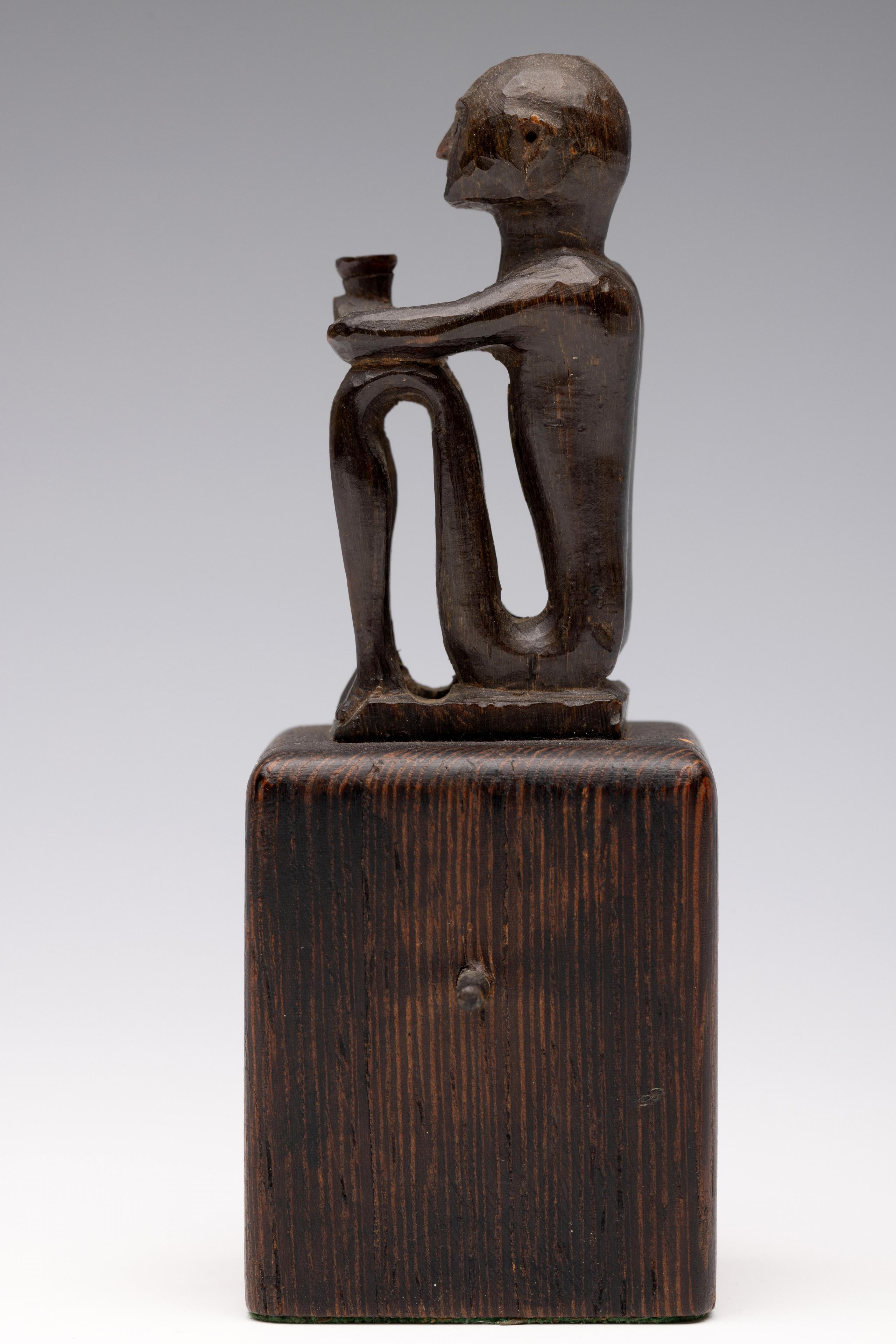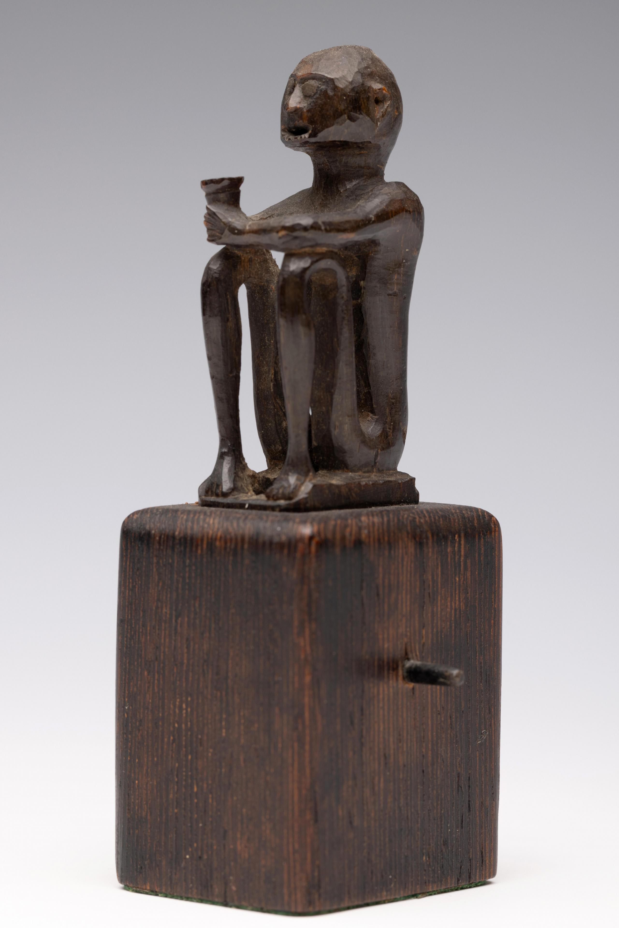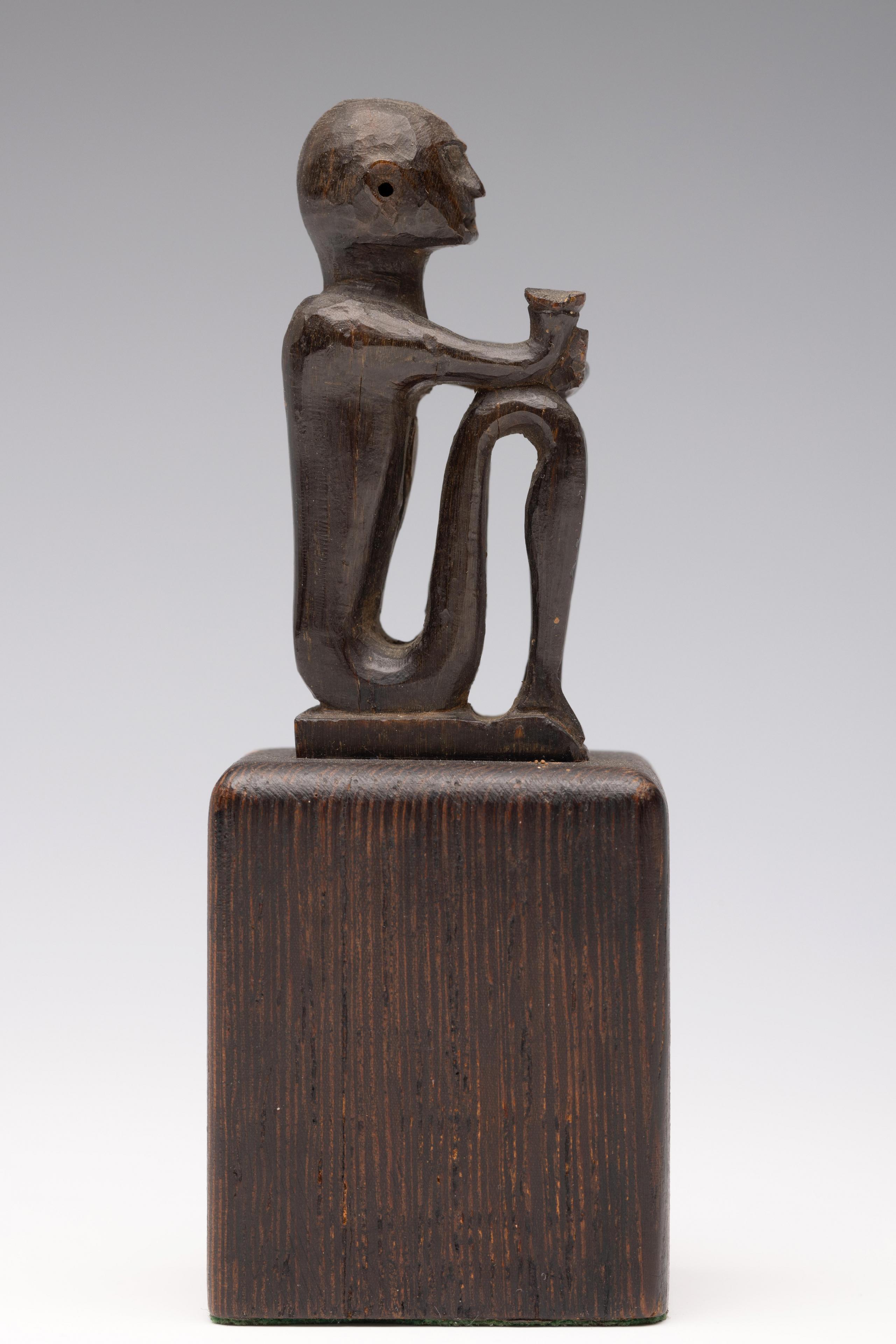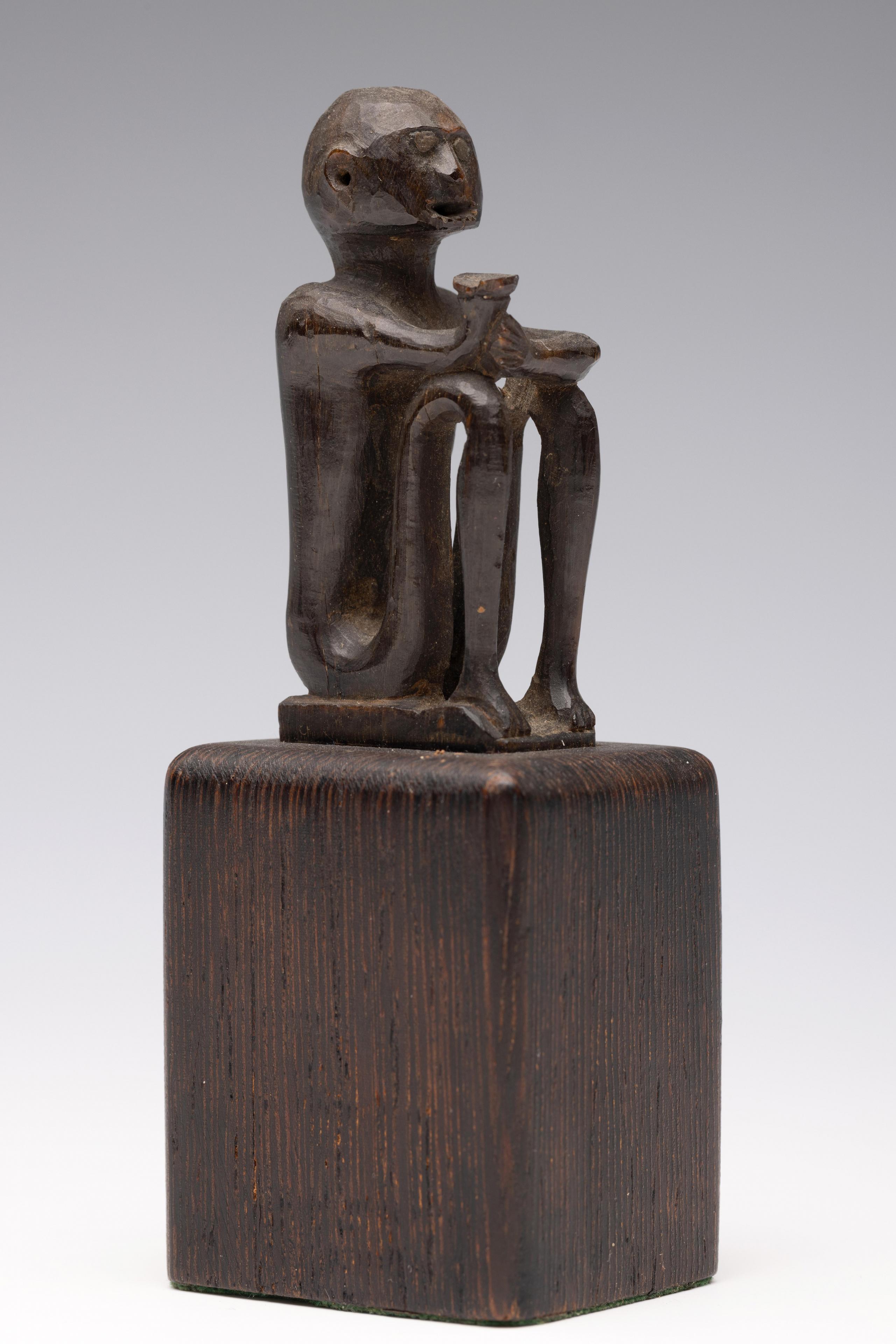 arms resting on raised legs, holding a cup in right hand, open mouth with notched lips. Mounted on a rectangular base with a wooden peg on left side.