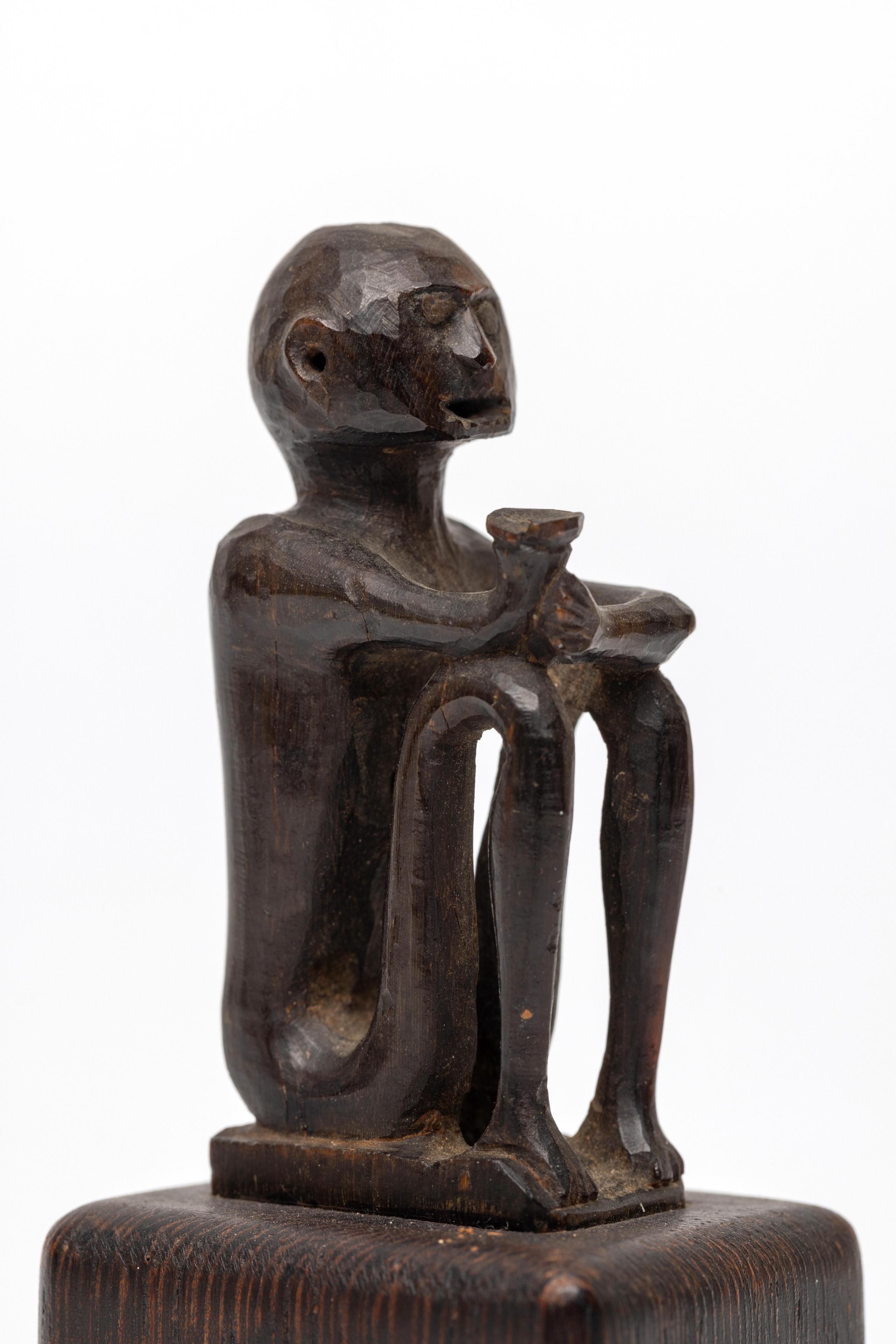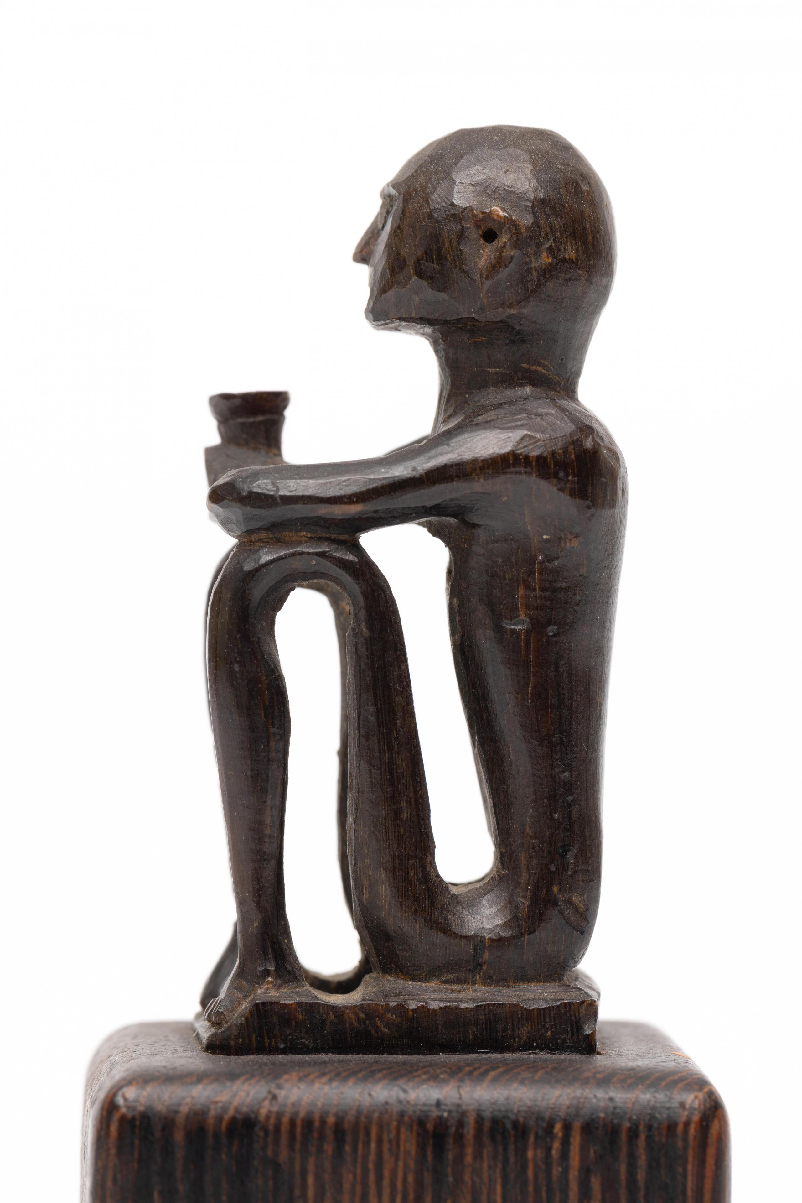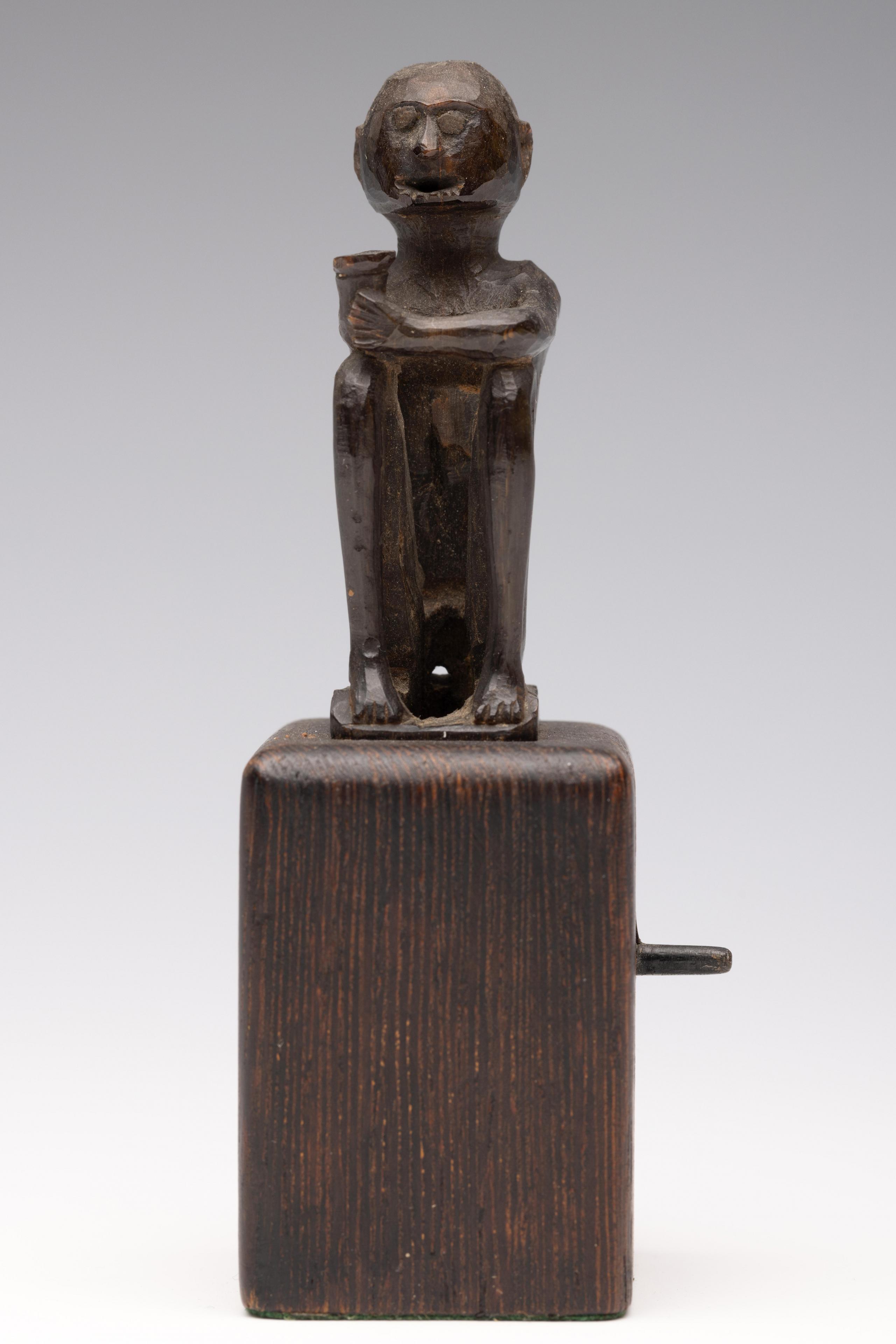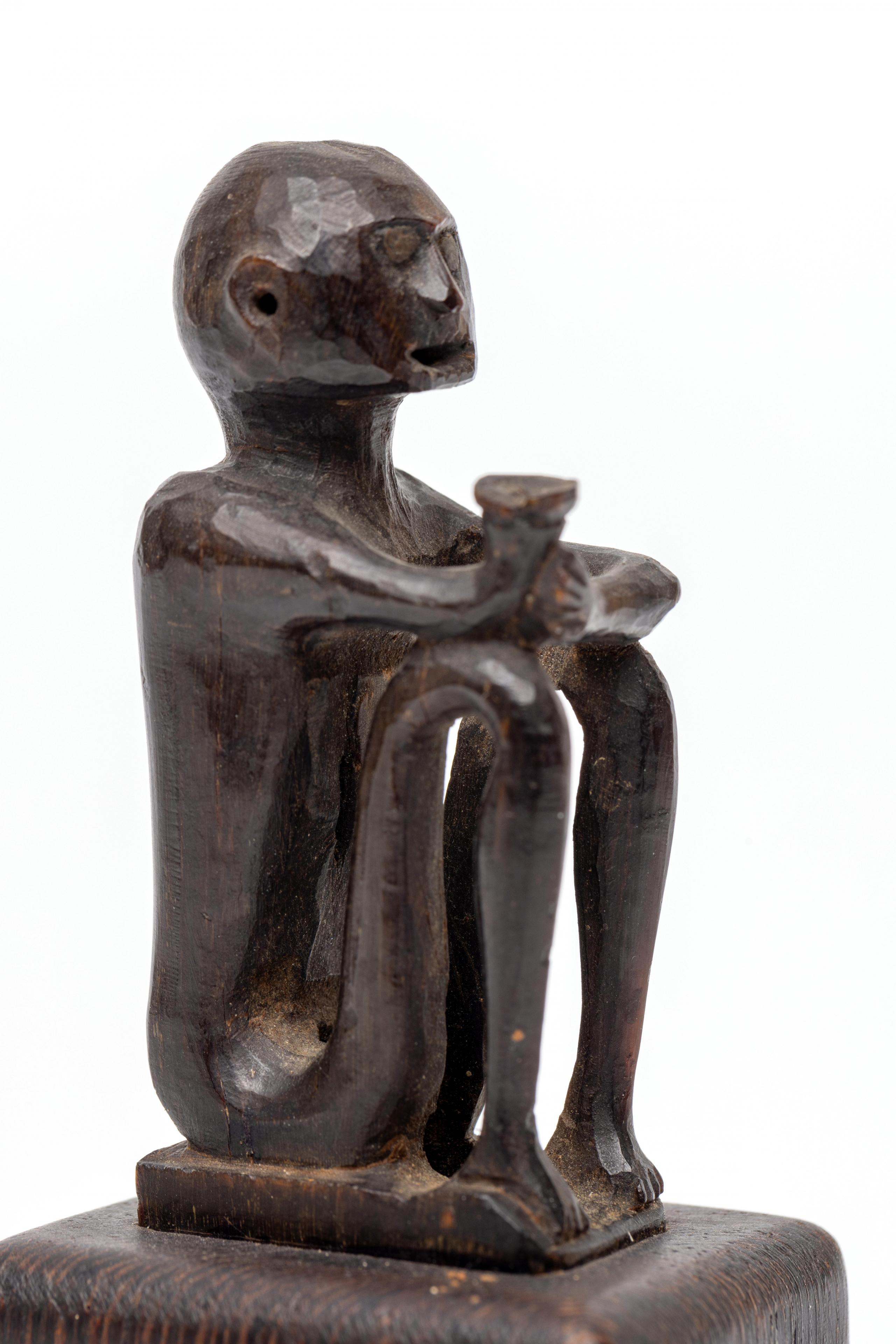 arms resting on raised legs, holding a cup in right hand, open mouth with notched lips. Mounted on a rectangular base with a wooden peg on left side.