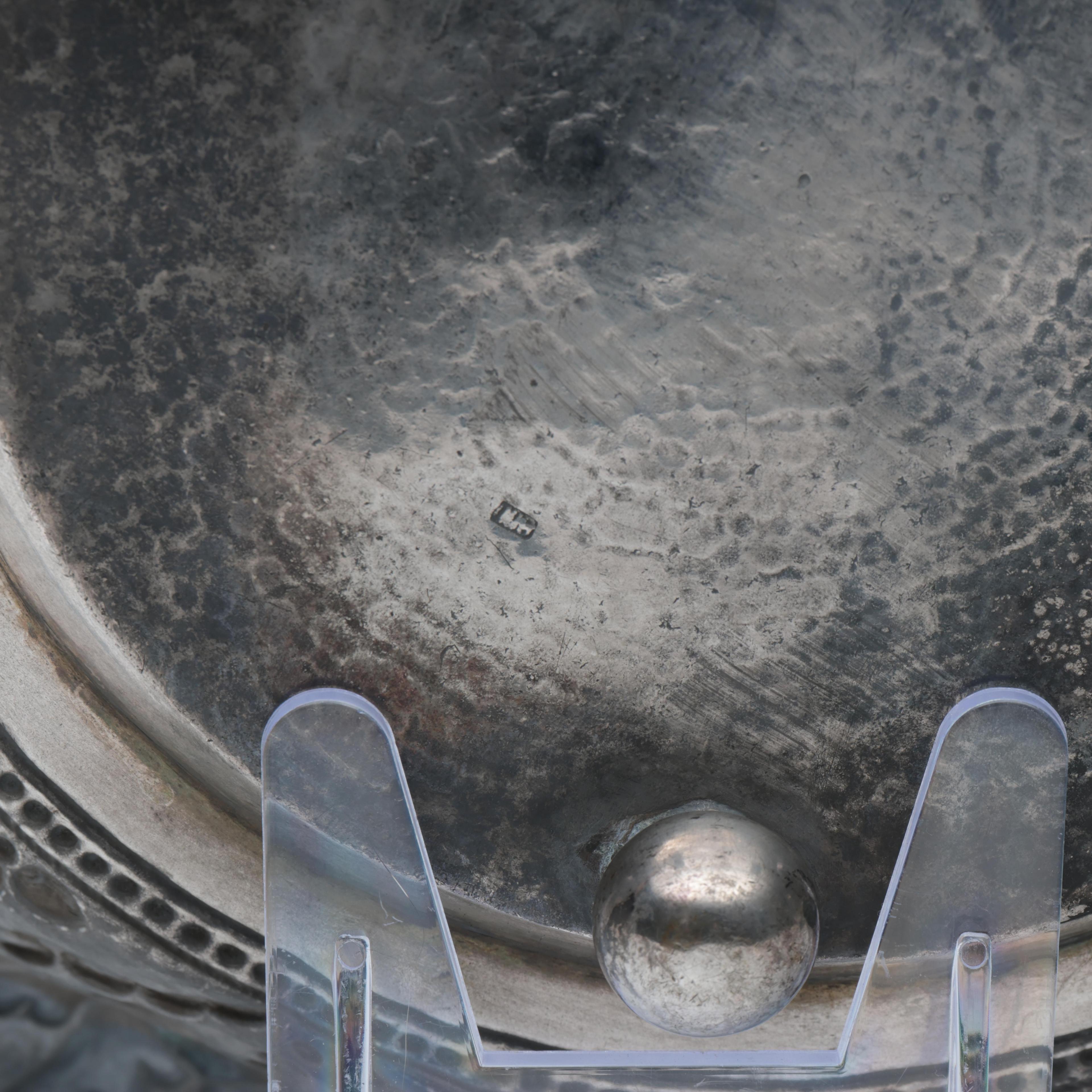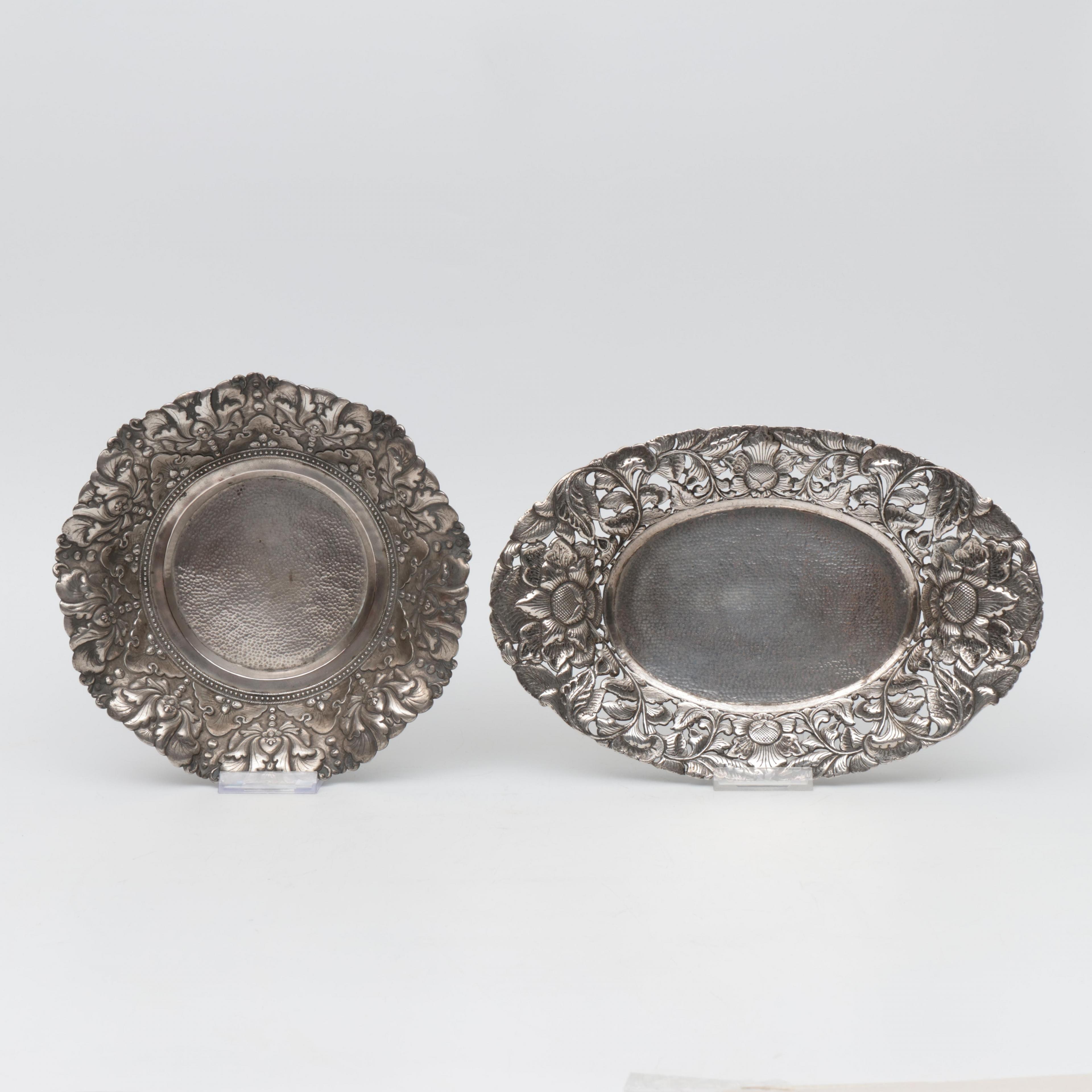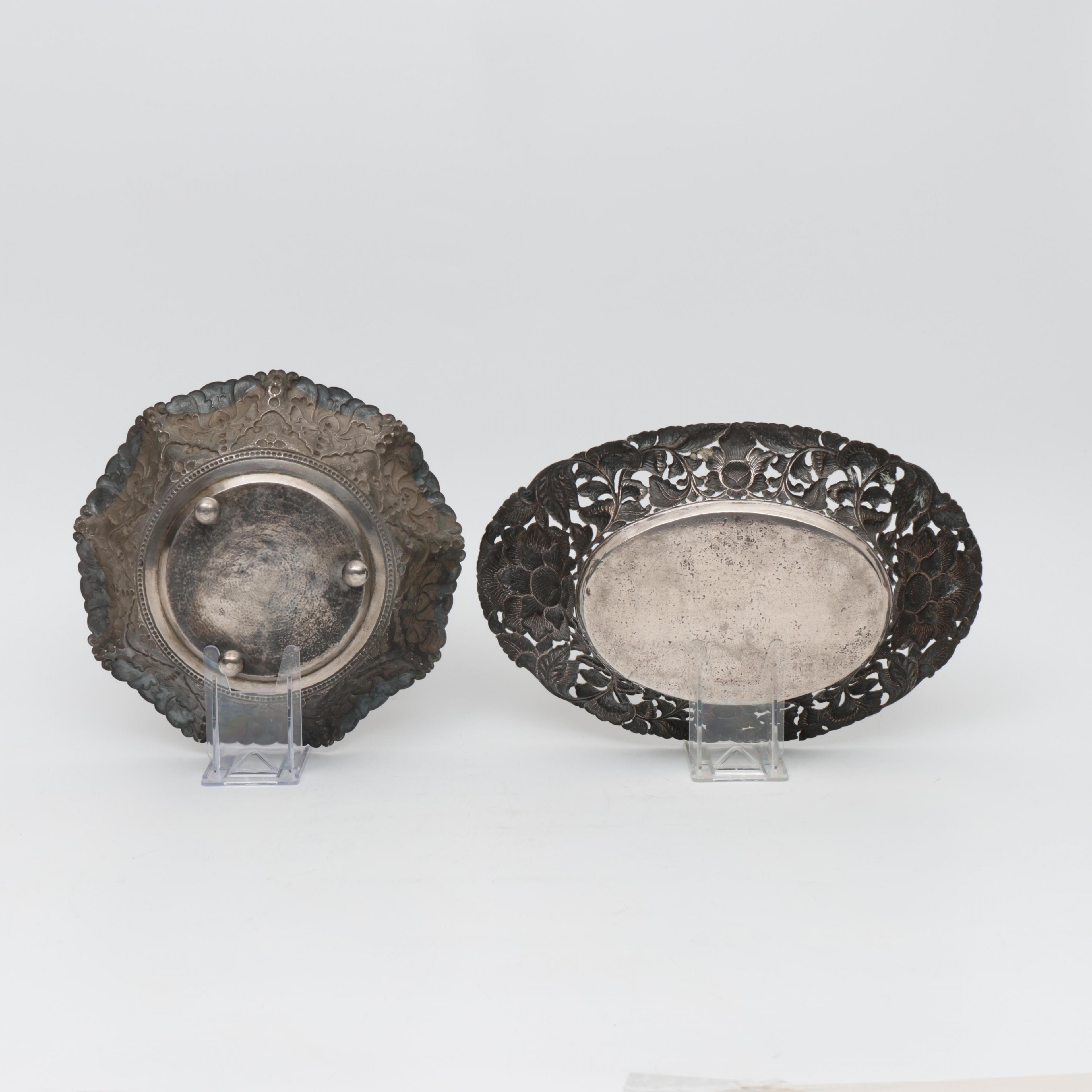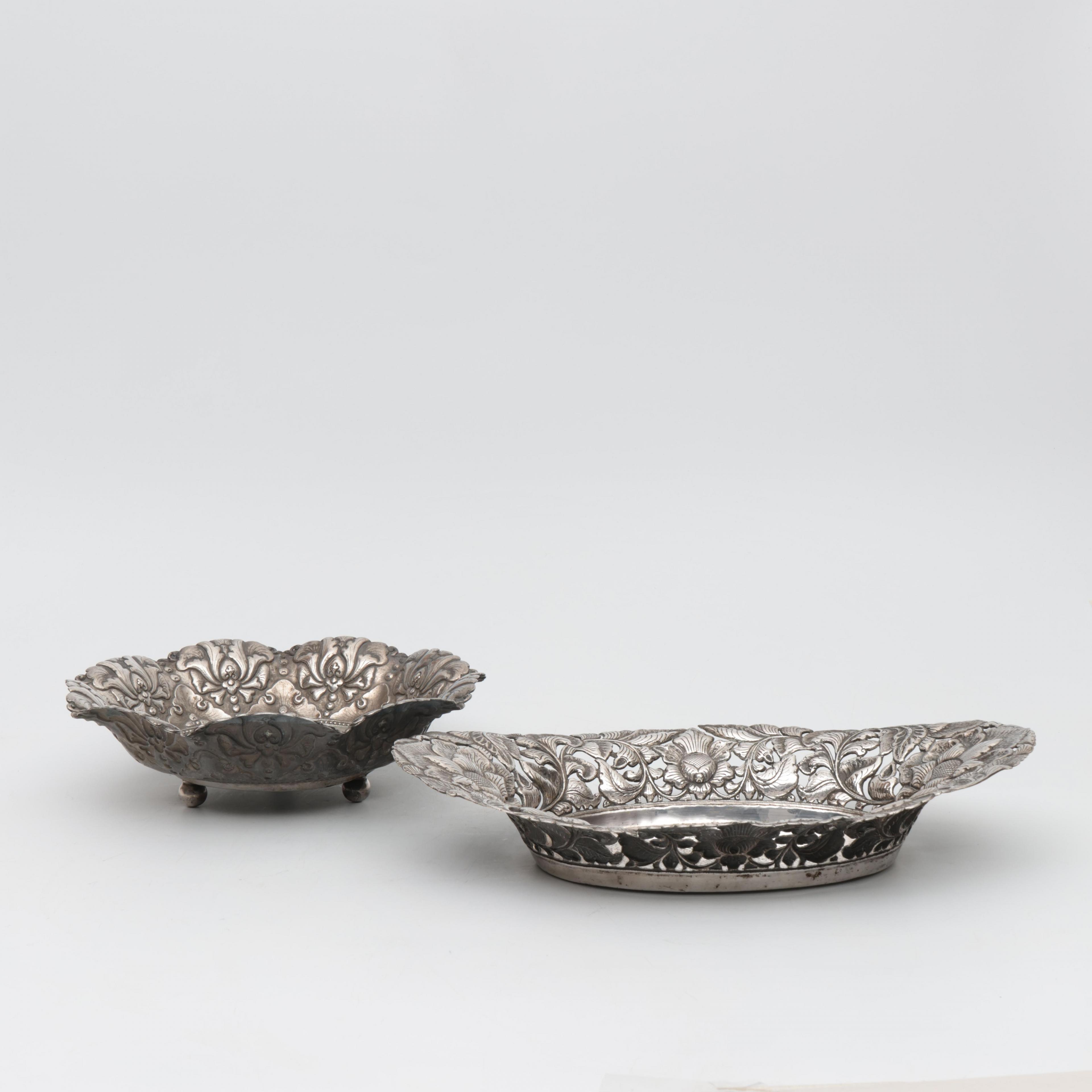 rond model, BWG op pootjes en langwerpig model, 3e gehalte, beide met opstaande randen versierd met bloem-, blad- en vruchtmotieven, getekend 800, 3e gehalte,