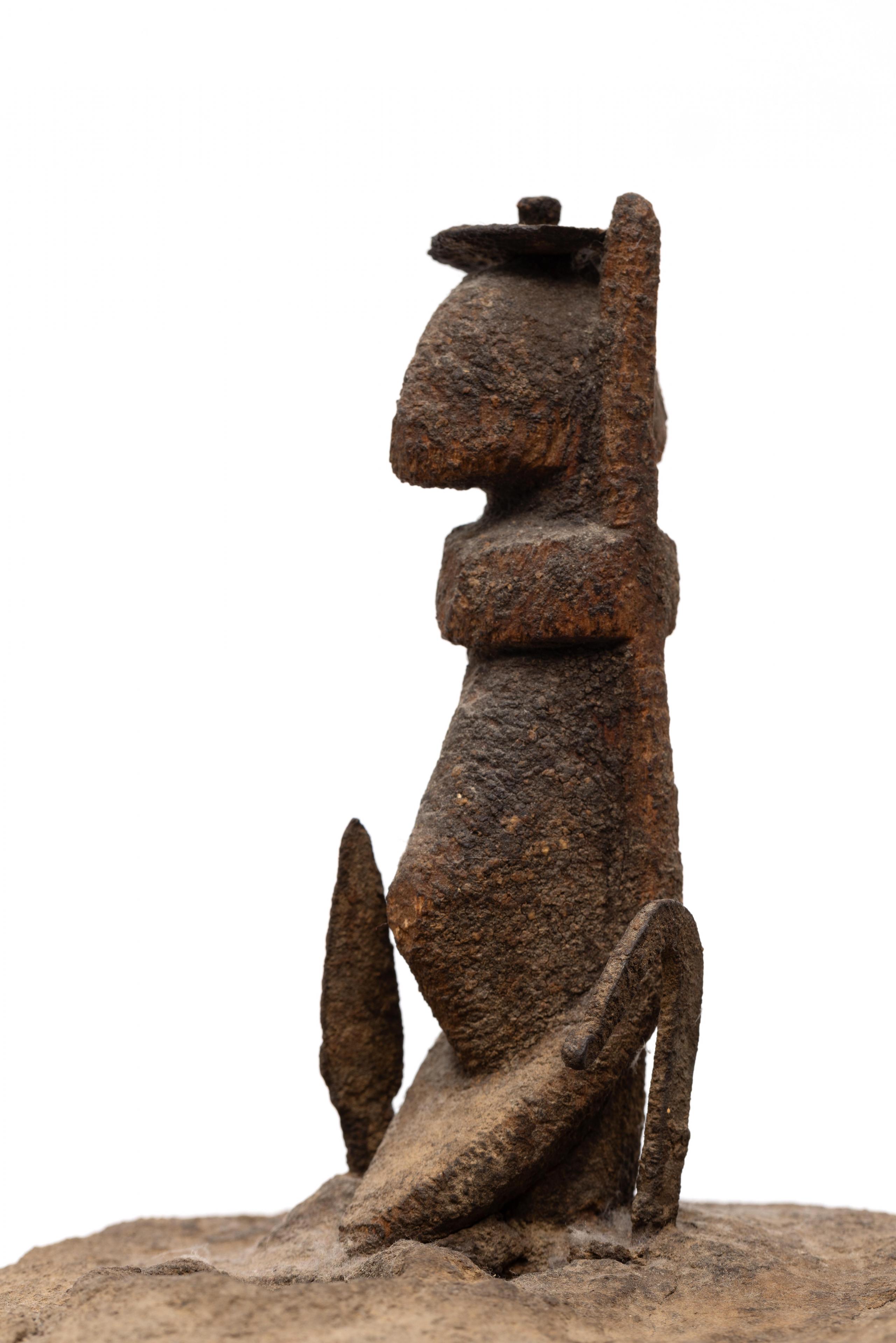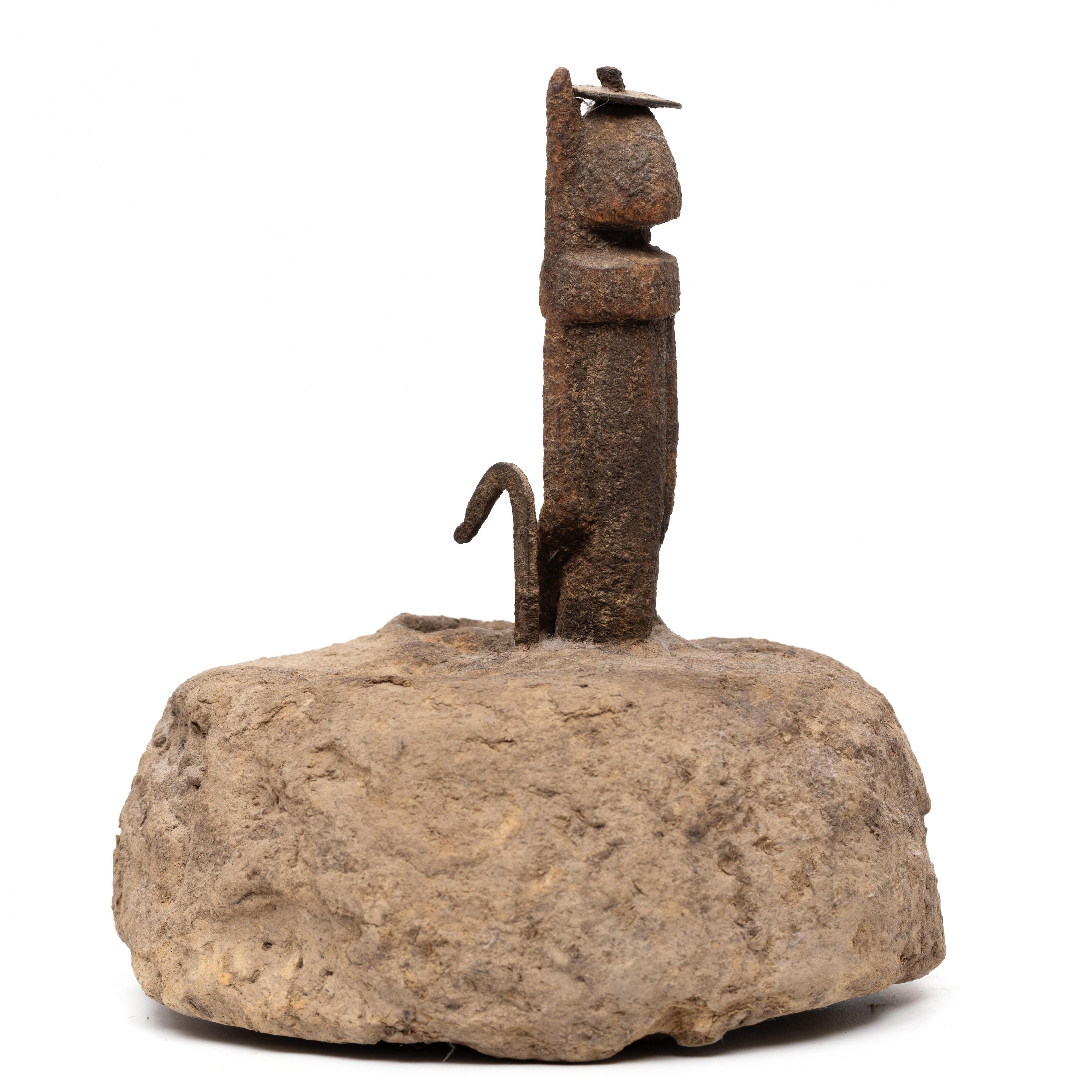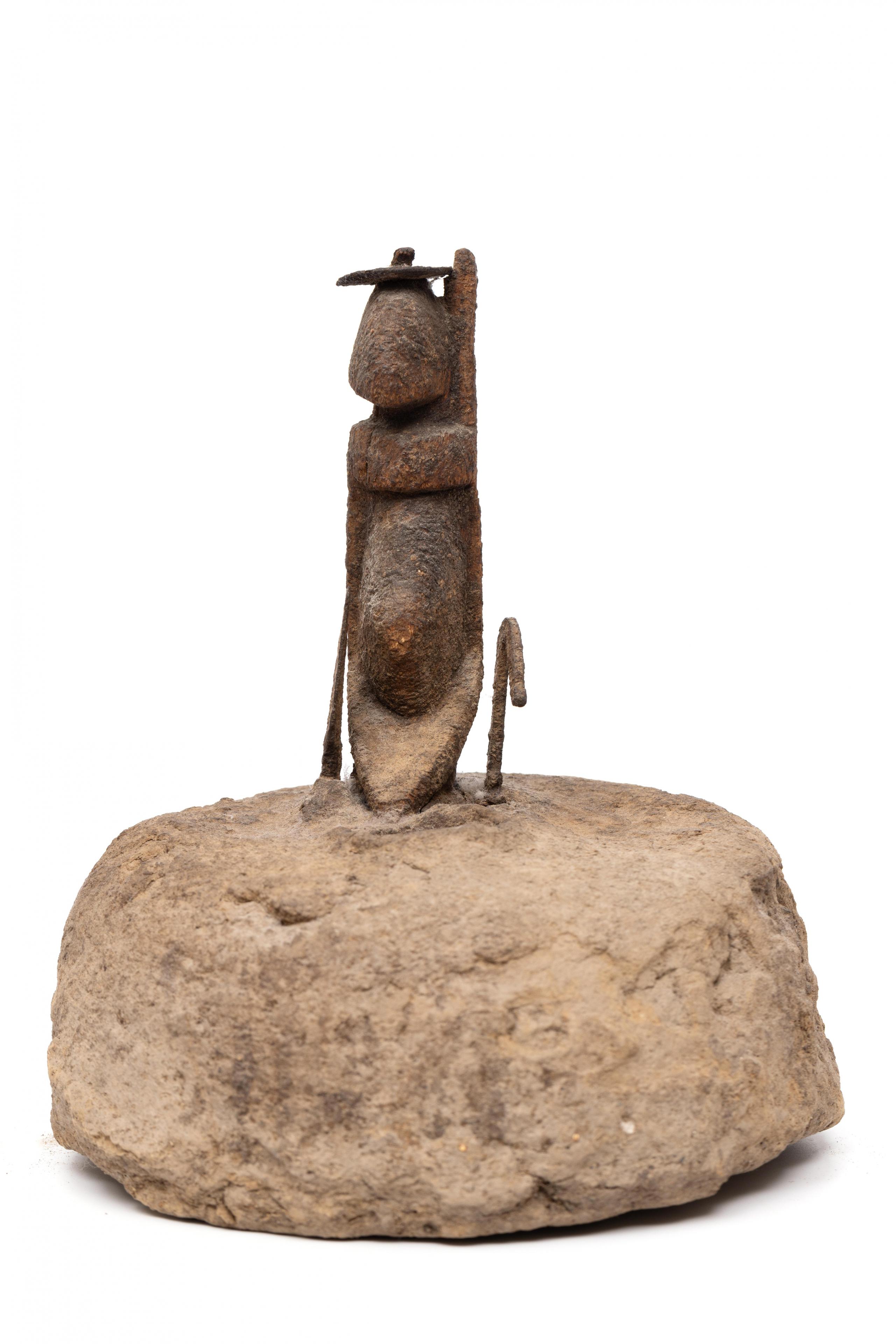 consisting of a wooden figure with wrought iron attributes mounted on a terracotta base.