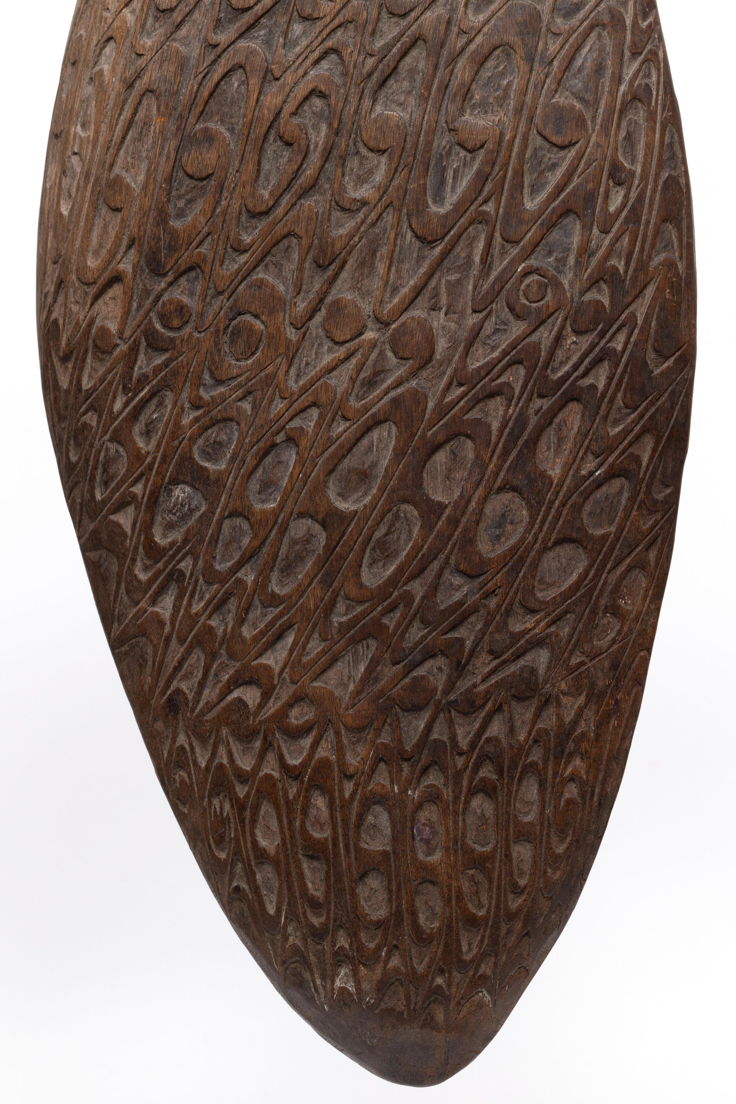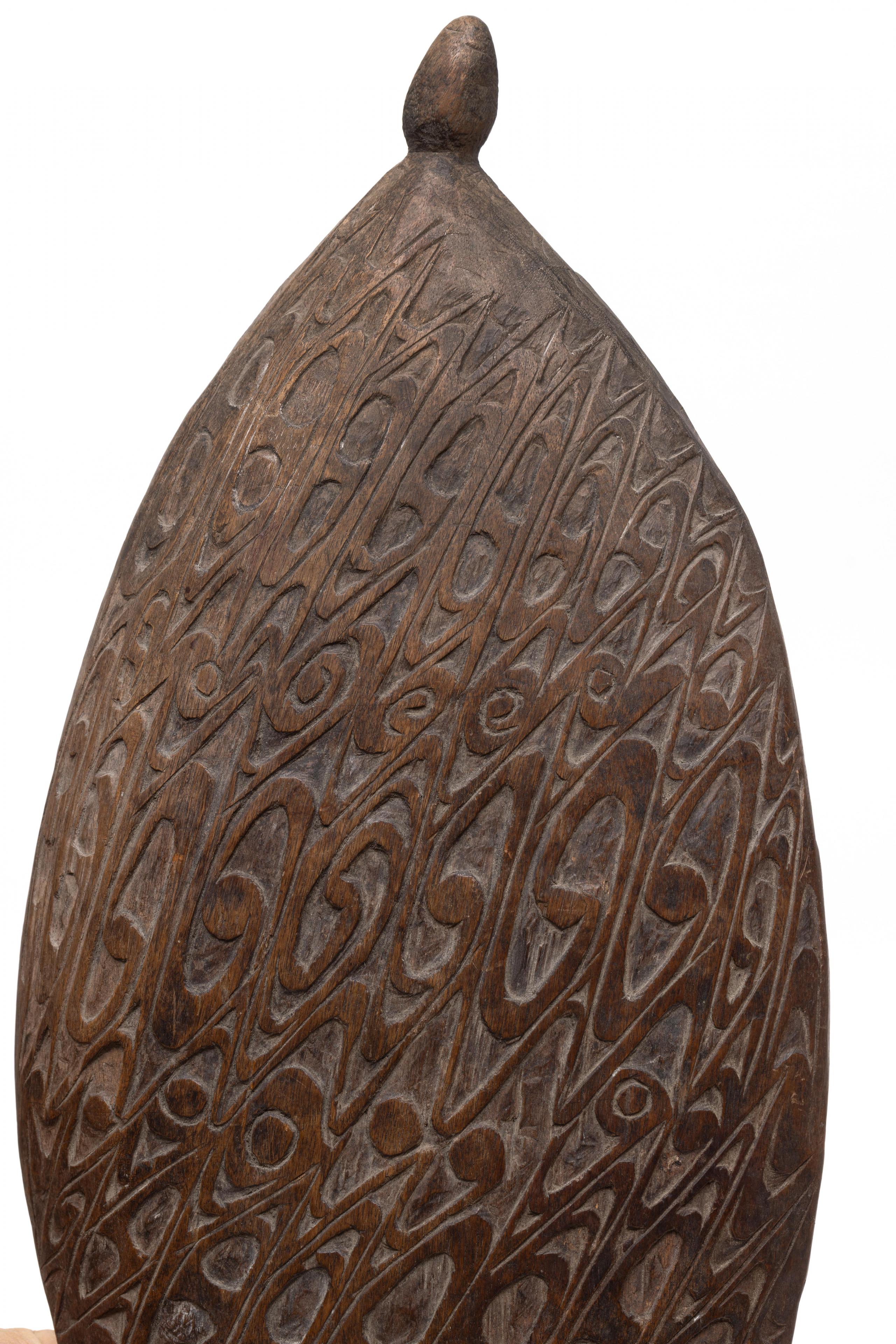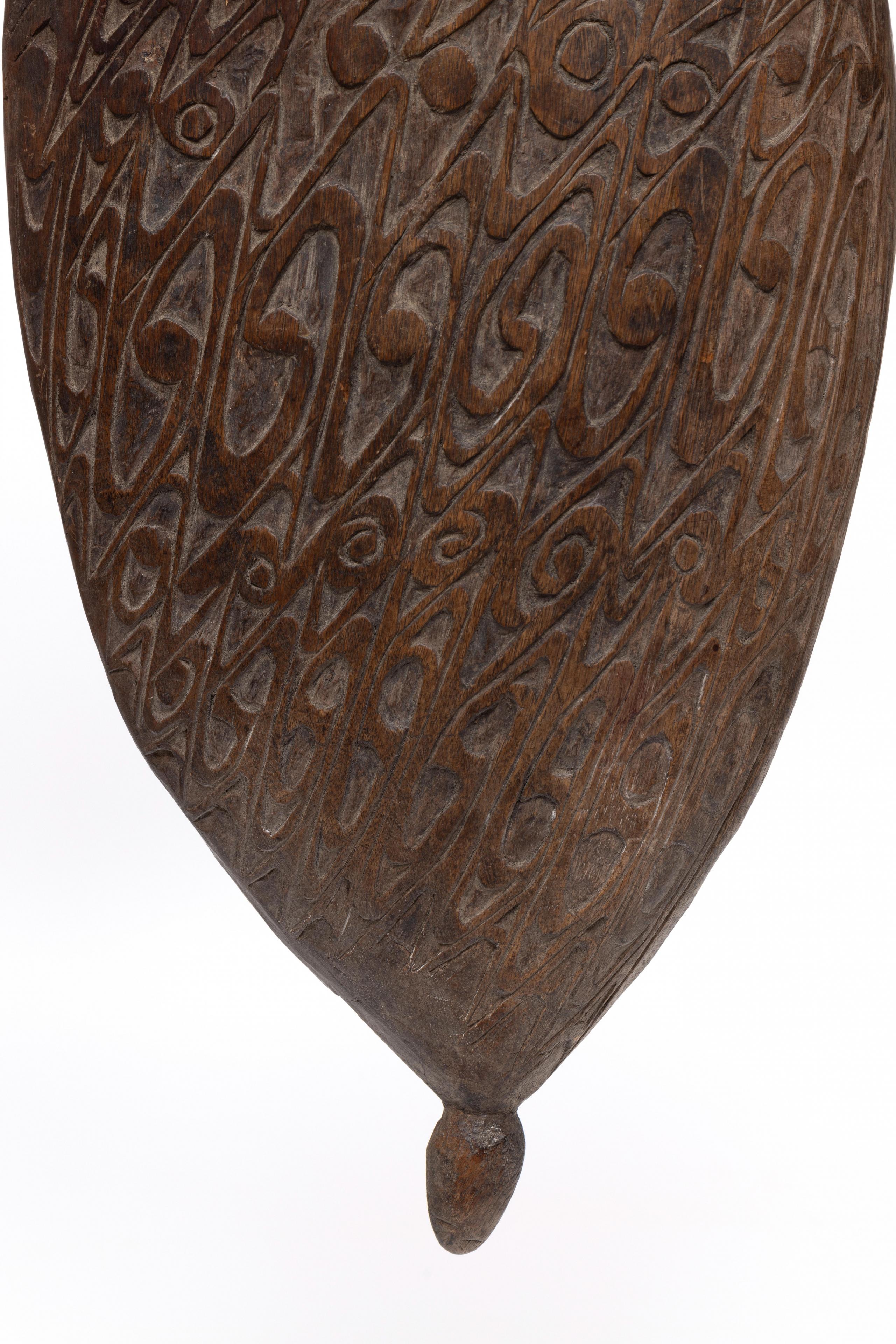 the reverse with an intricate stylized spiral pattern and a turle head at one end. According to label, Provenance: Kampung Kensio.
