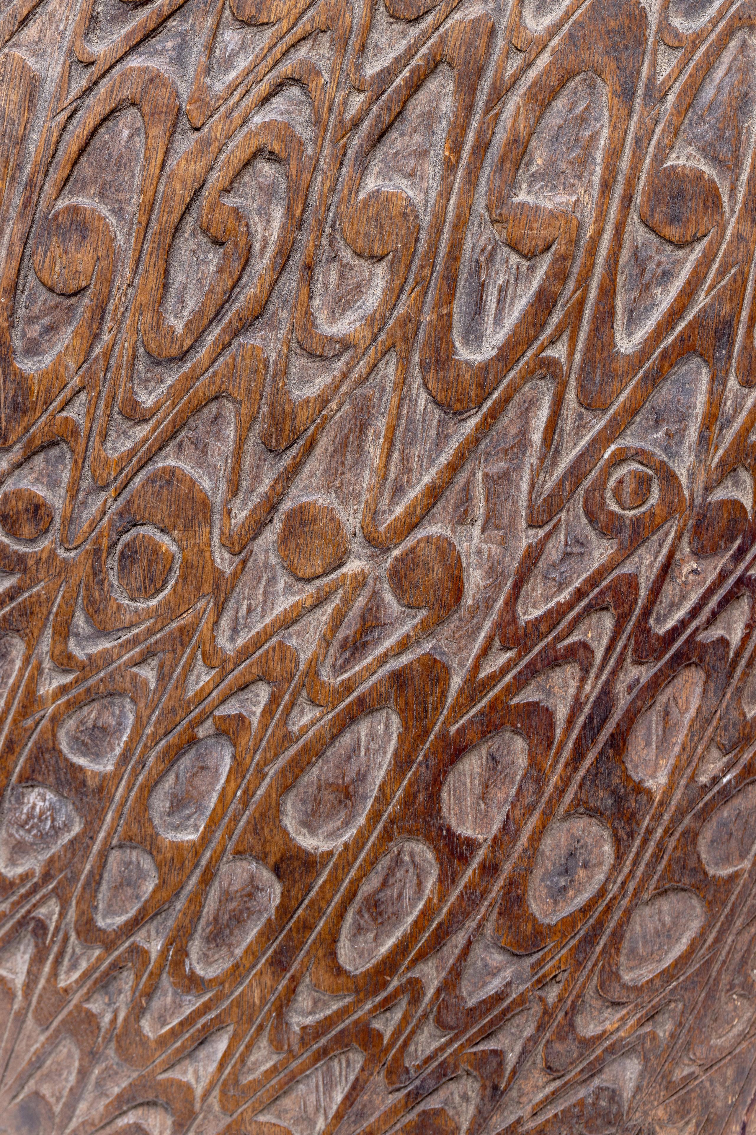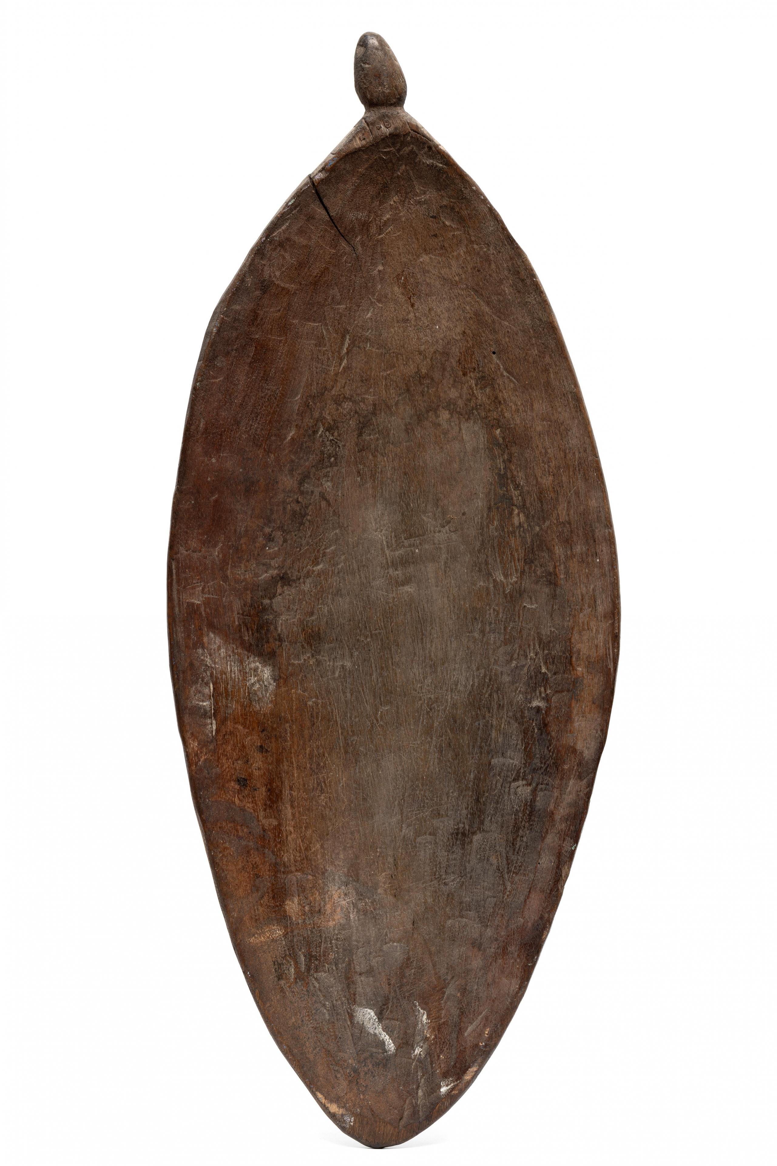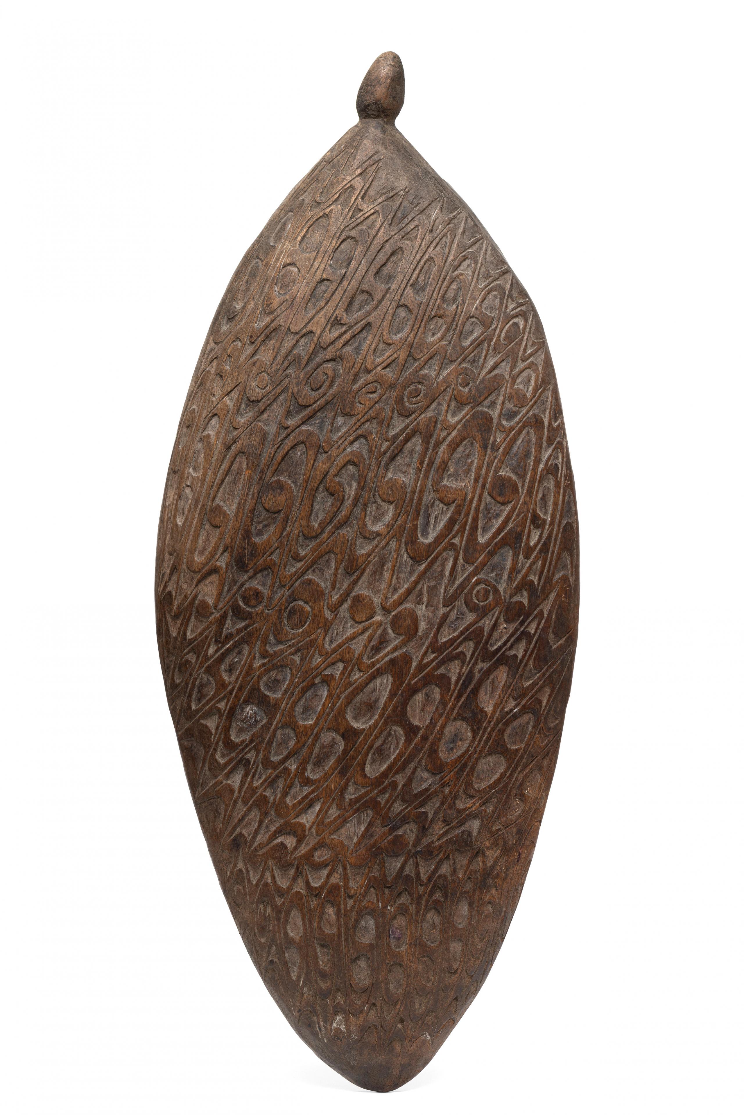 the reverse with an intricate stylized spiral pattern and a turle head at one end. According to label, Provenance: Kampung Kensio.