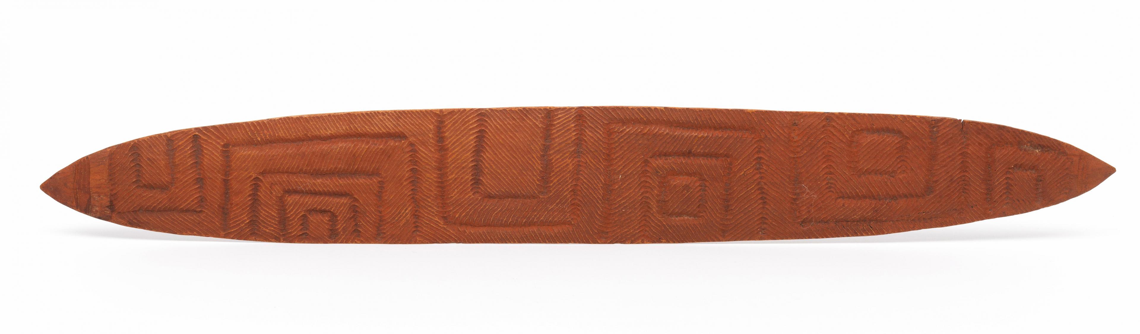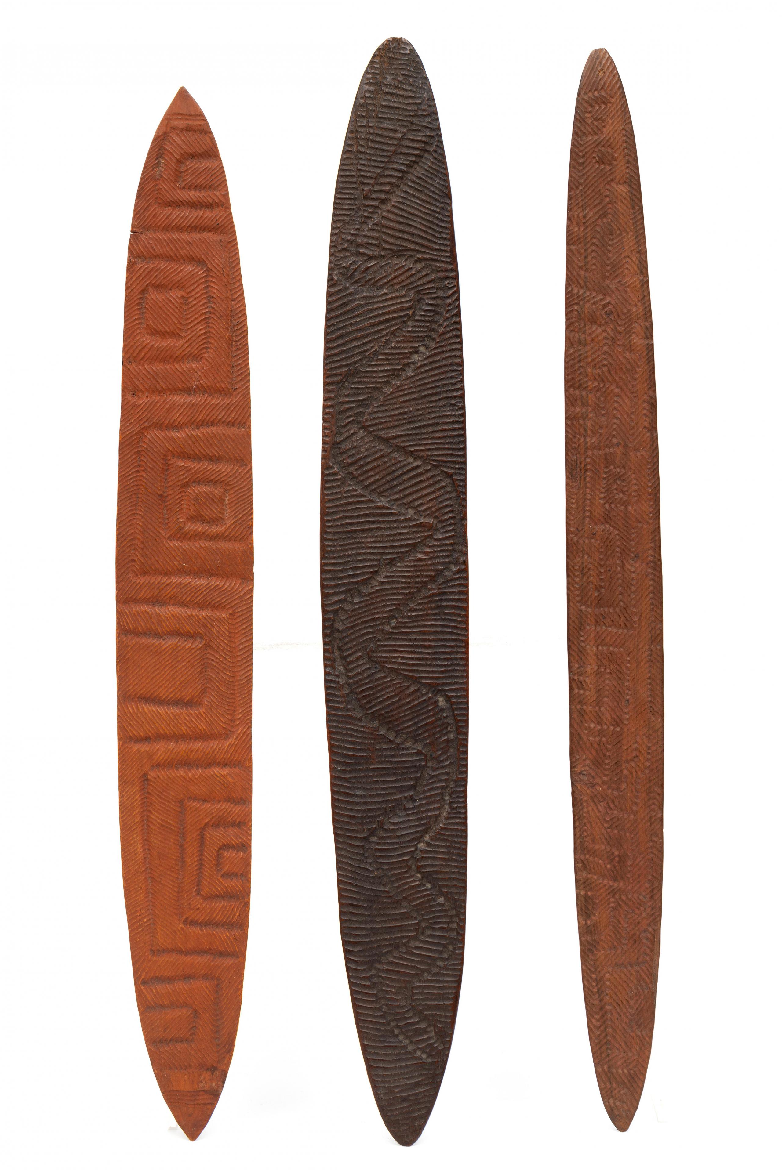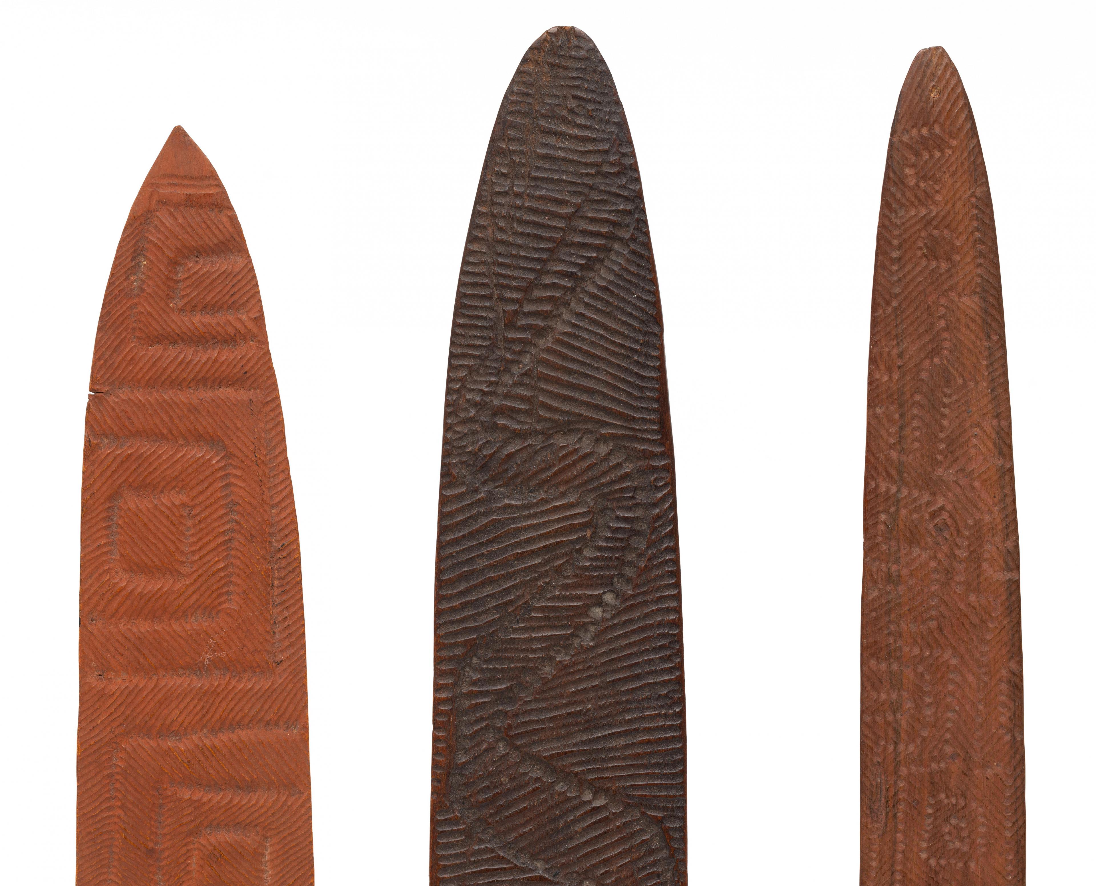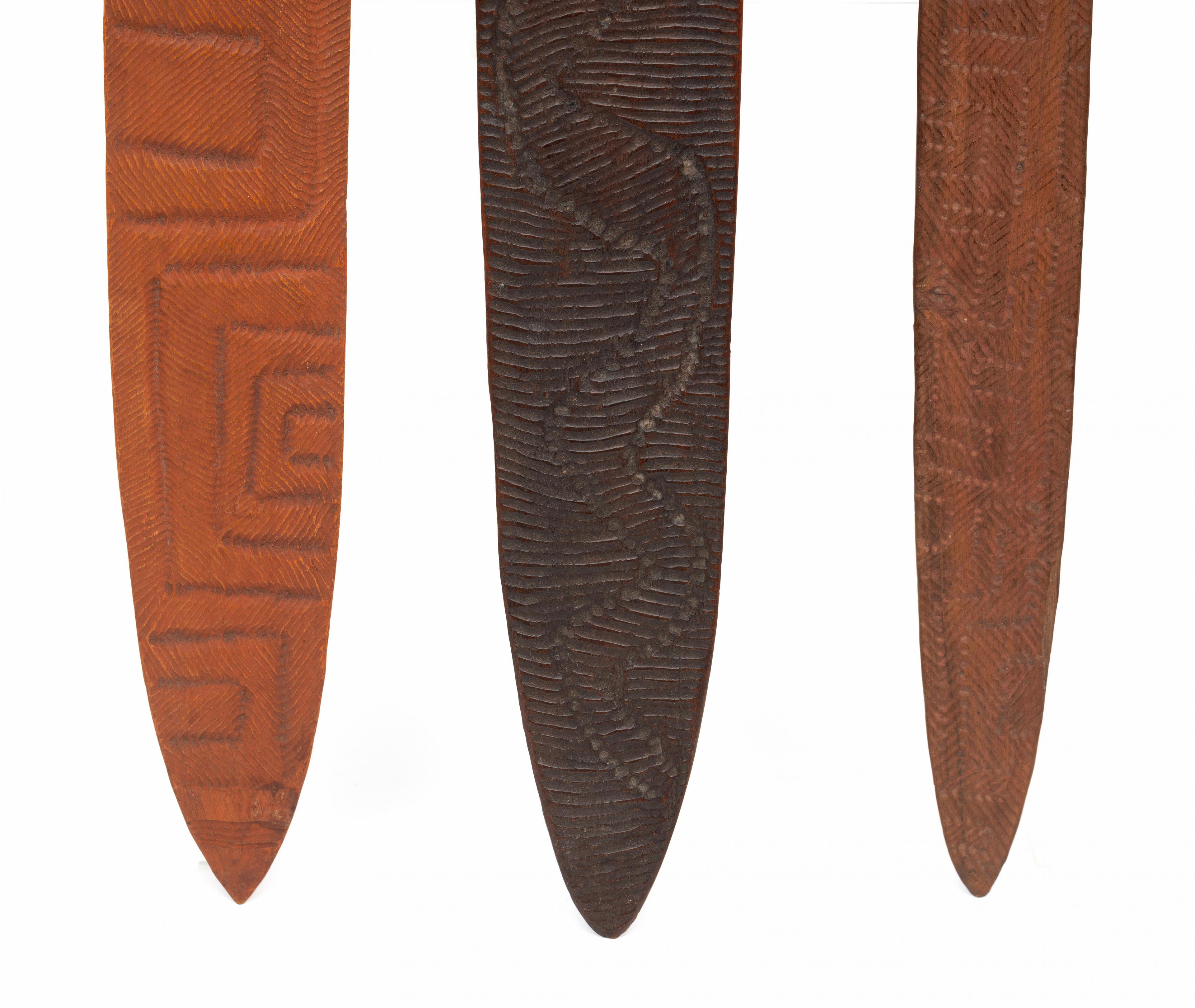 two decorated showing a grooved pattern, two with a rectangular and one with a meander pattern.