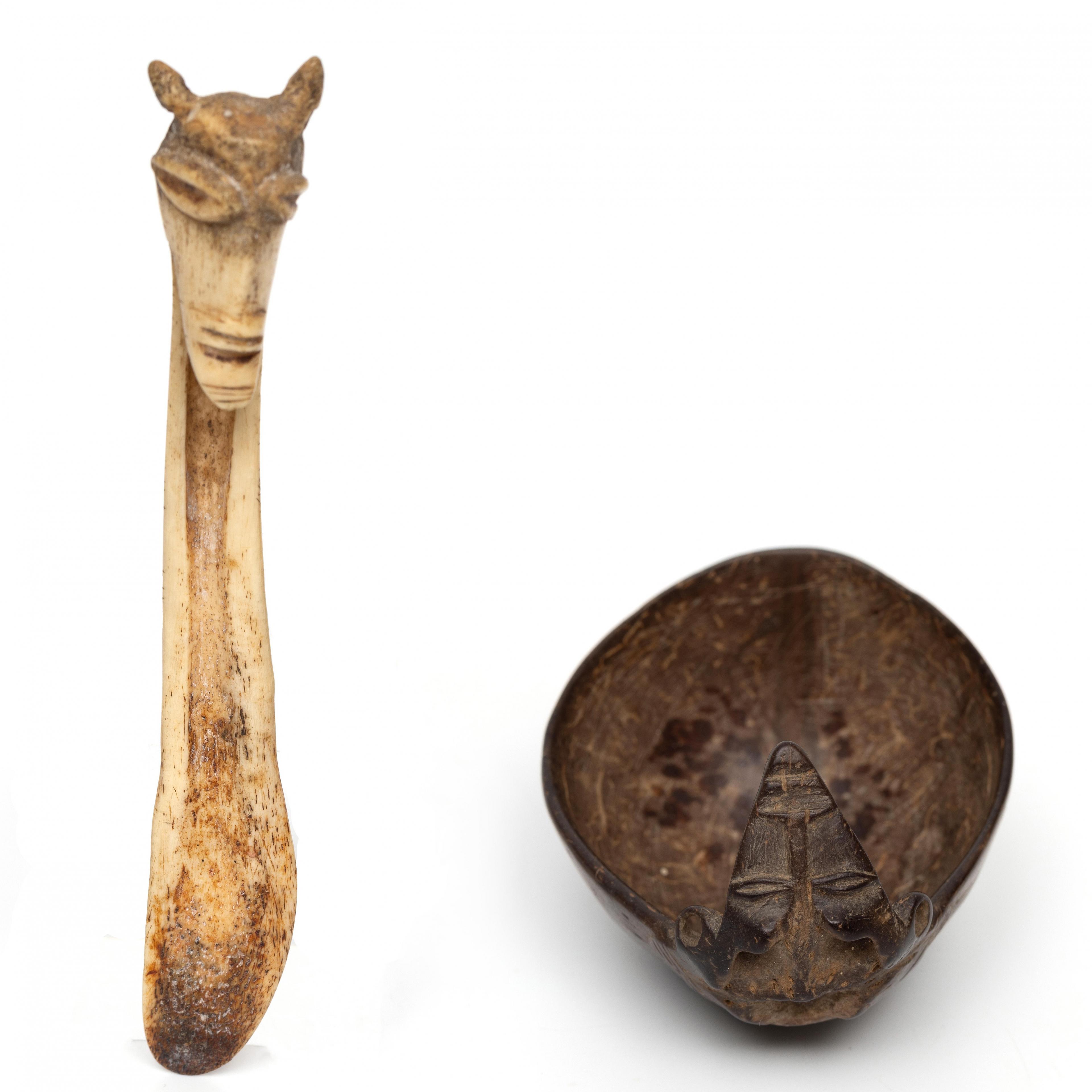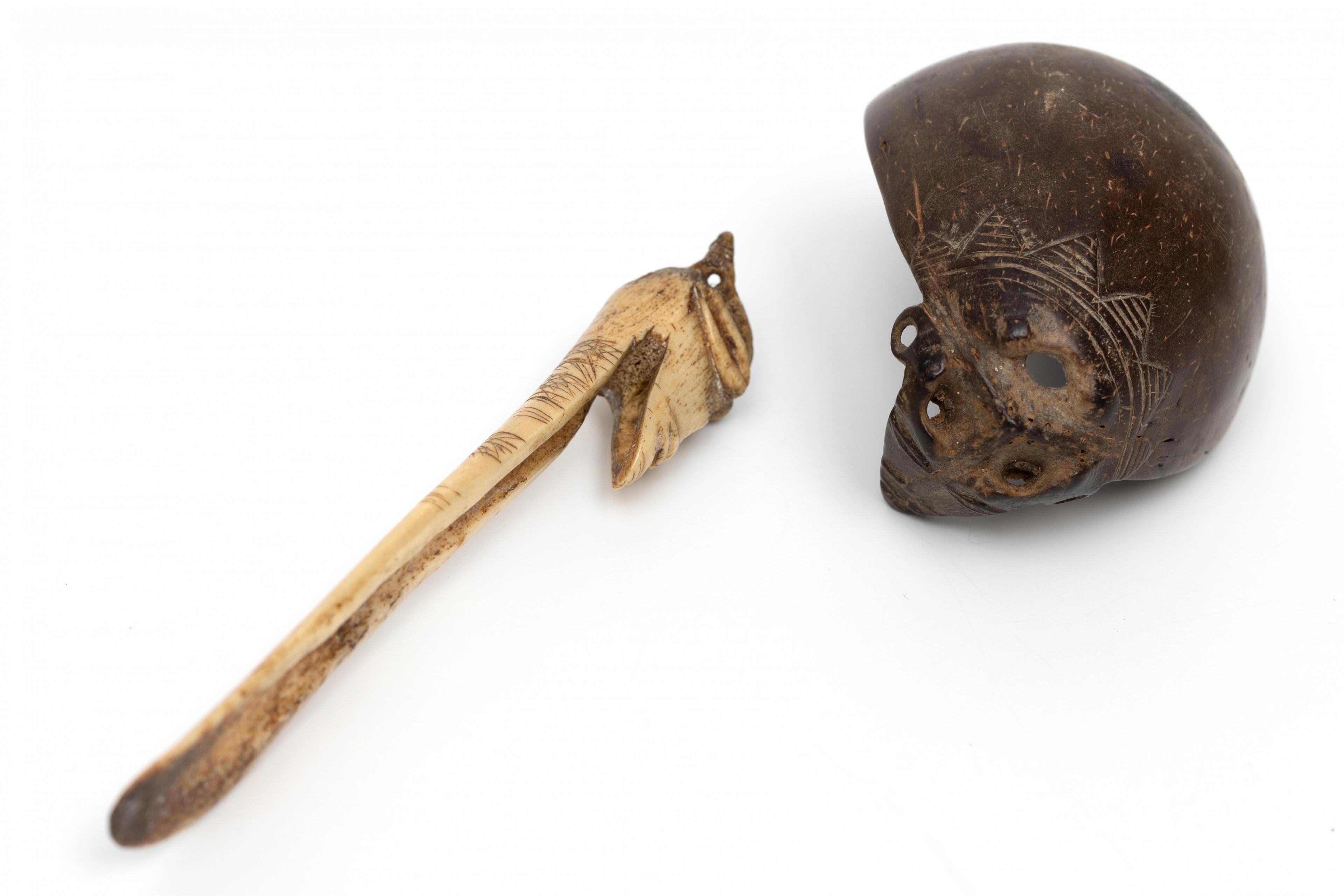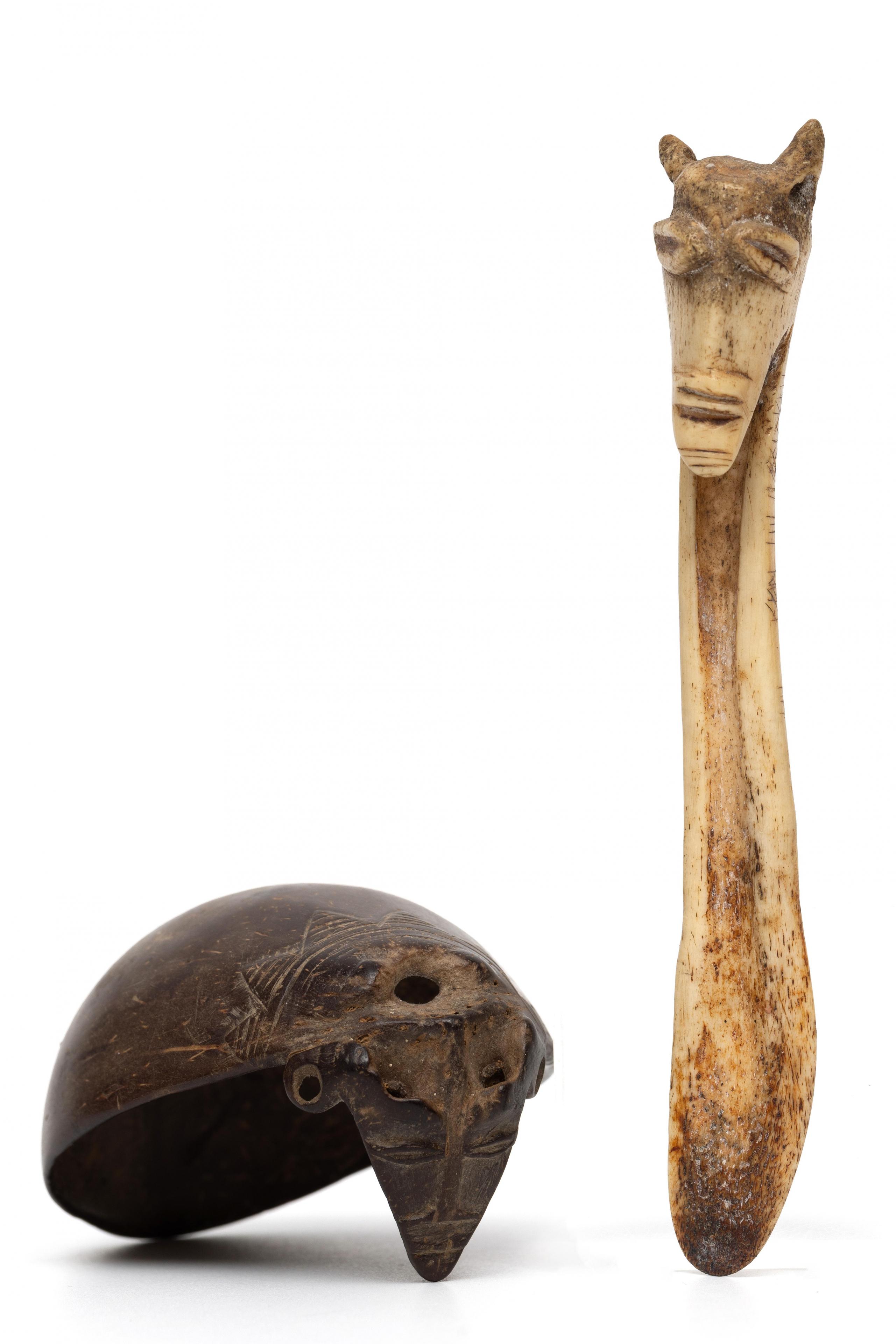 the bone handle shaped as a horned anthropomorphic face, the coconut shell with a finely carved human face.