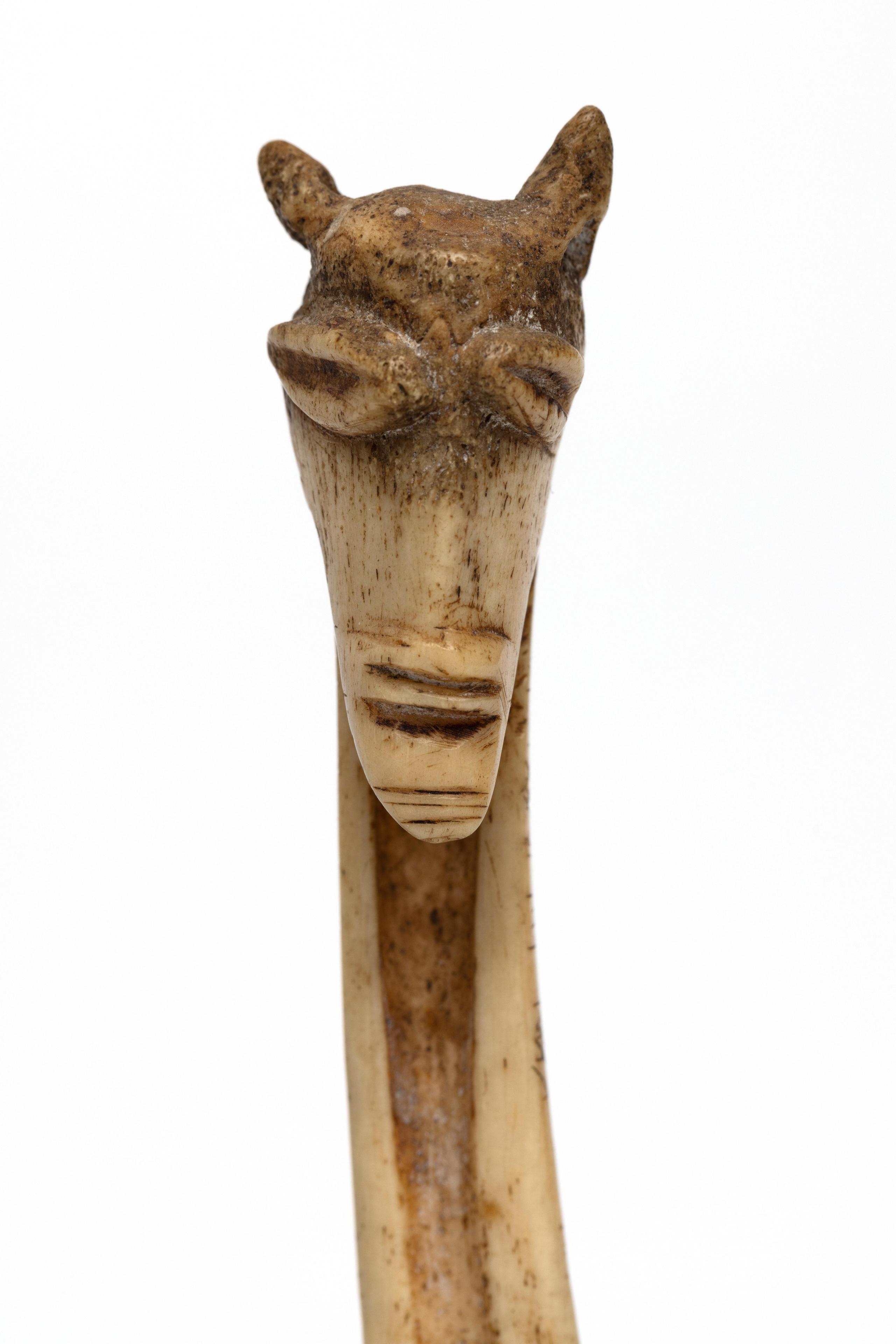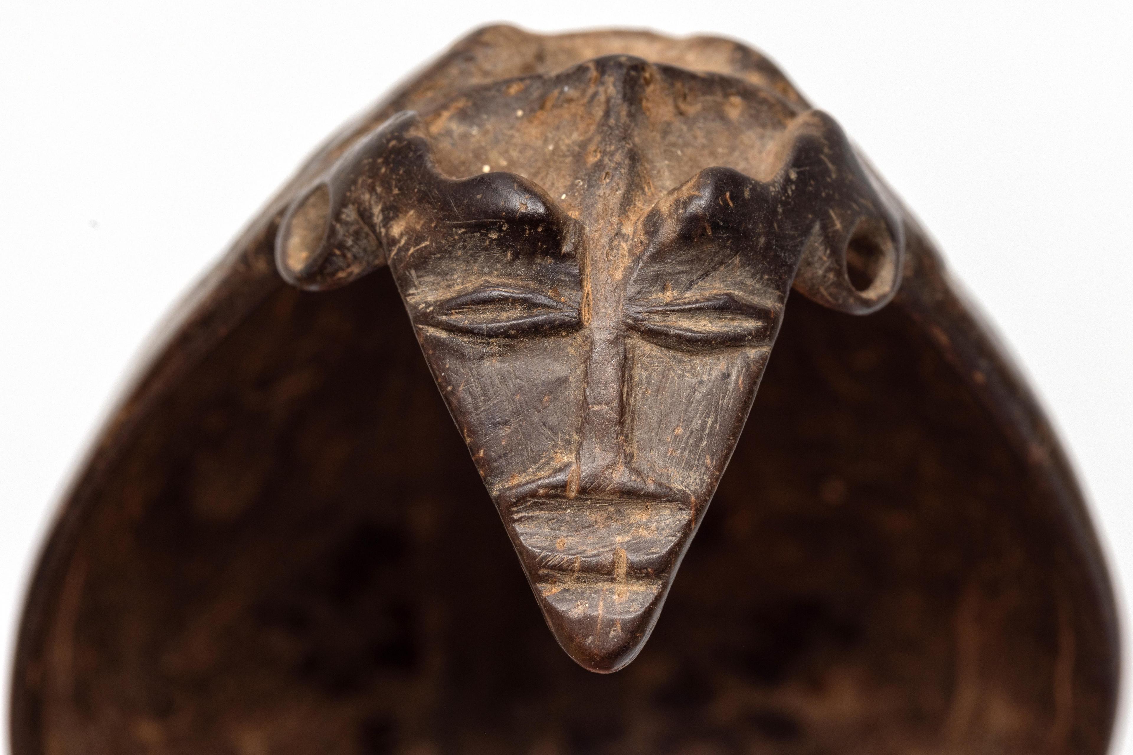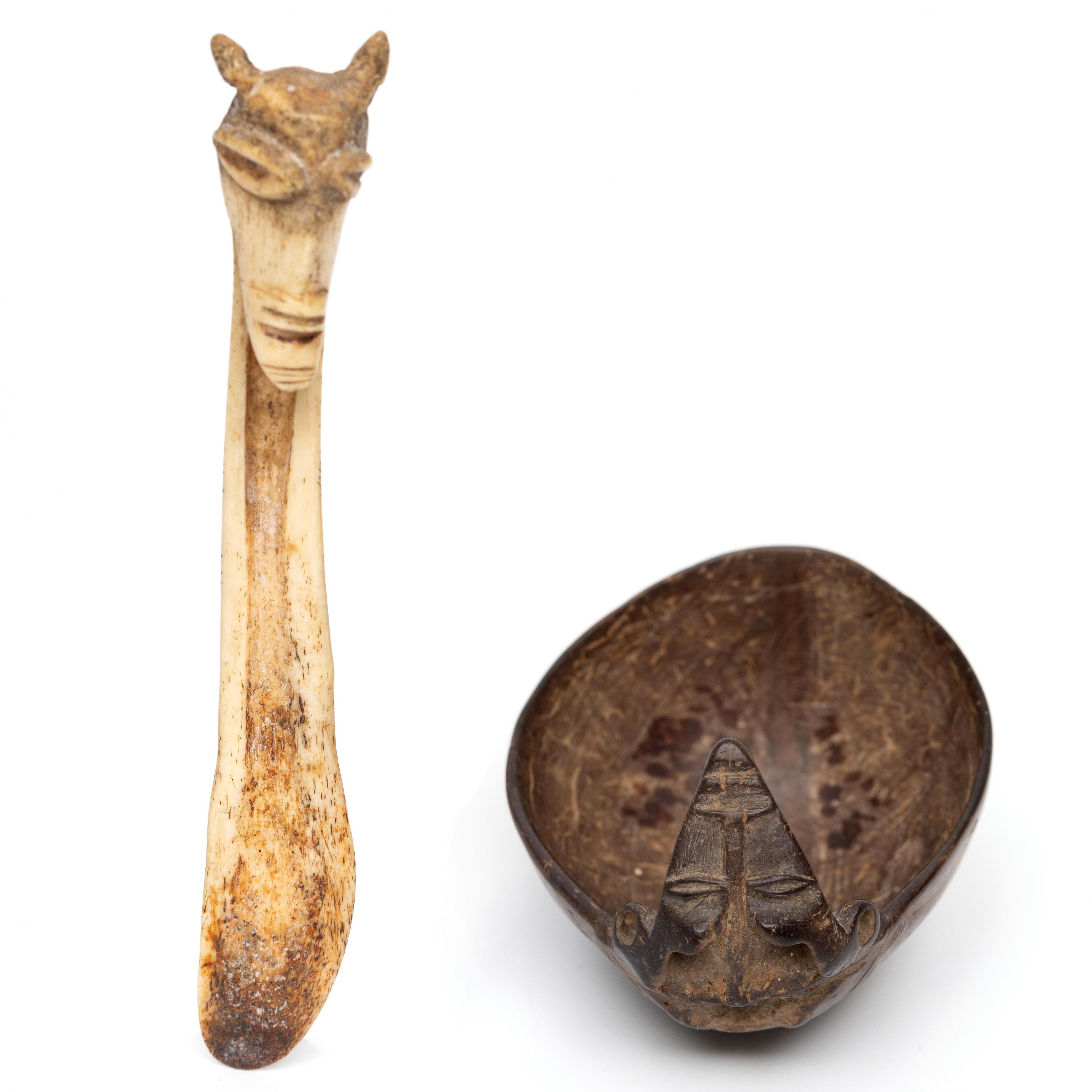 the bone handle shaped as a horned anthropomorphic face, the coconut shell with a finely carved human face.