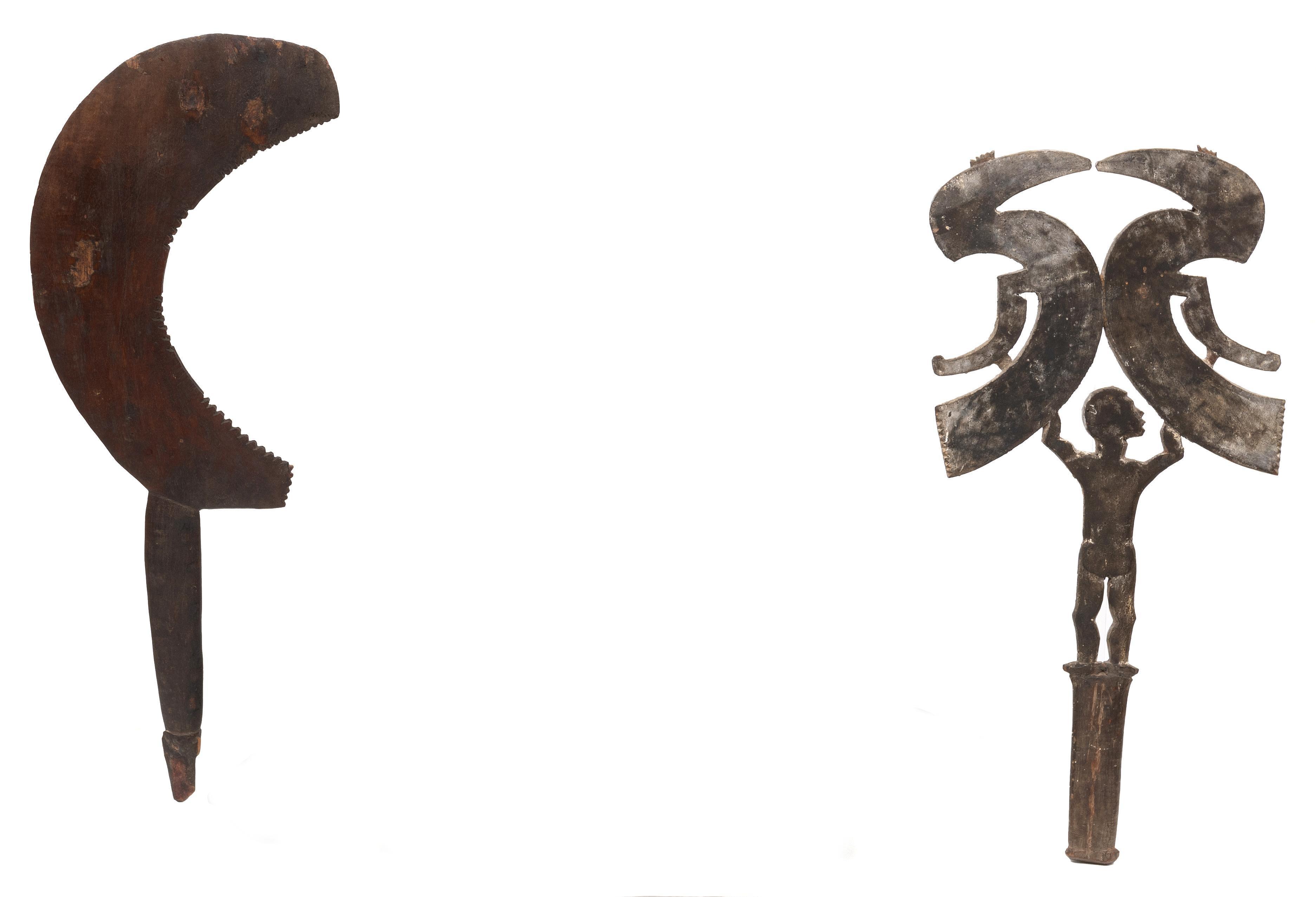 one Malaita dance wand showing a standing anthropomorph with two birds, the other in the form of a half moon, the inner curve ridged.