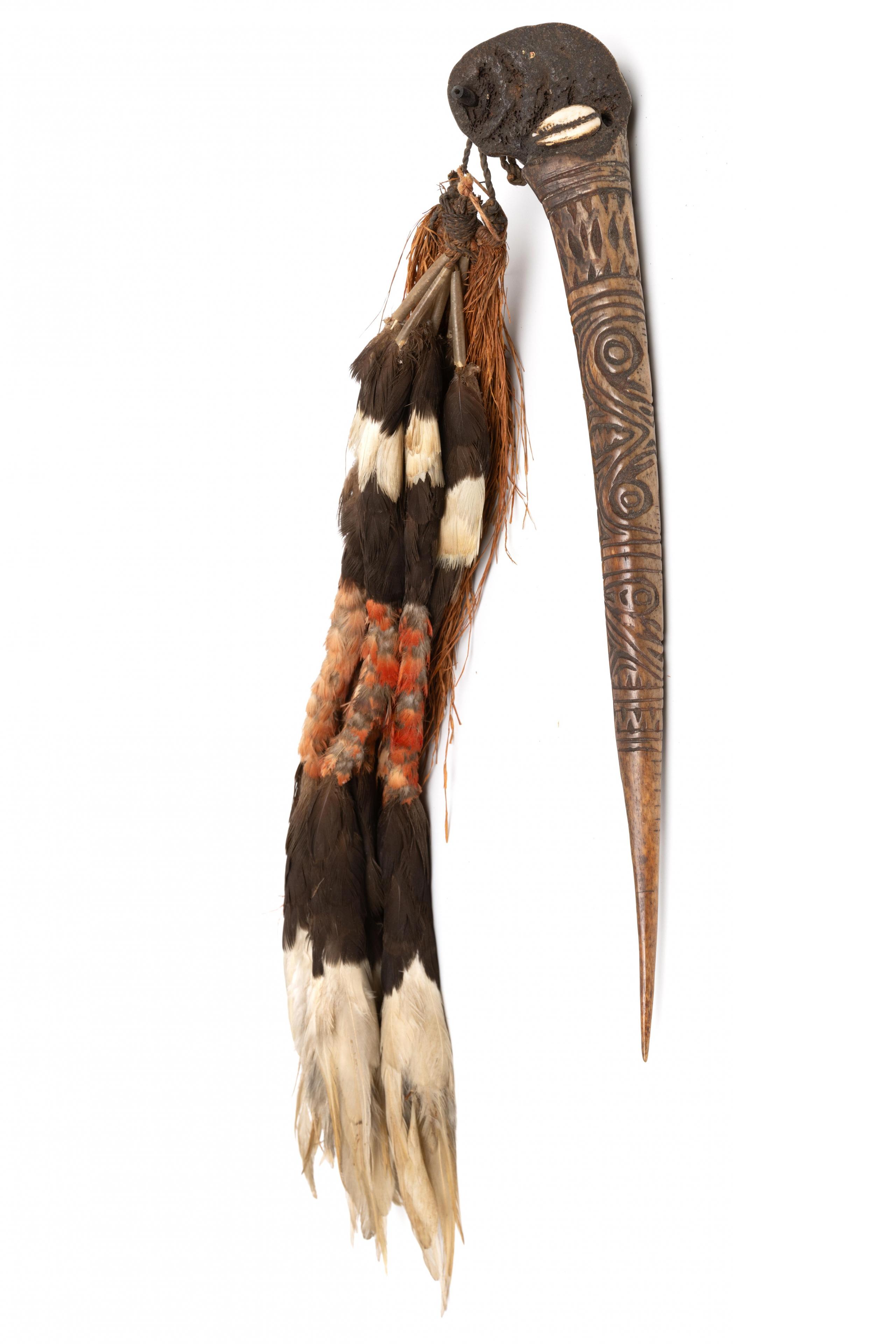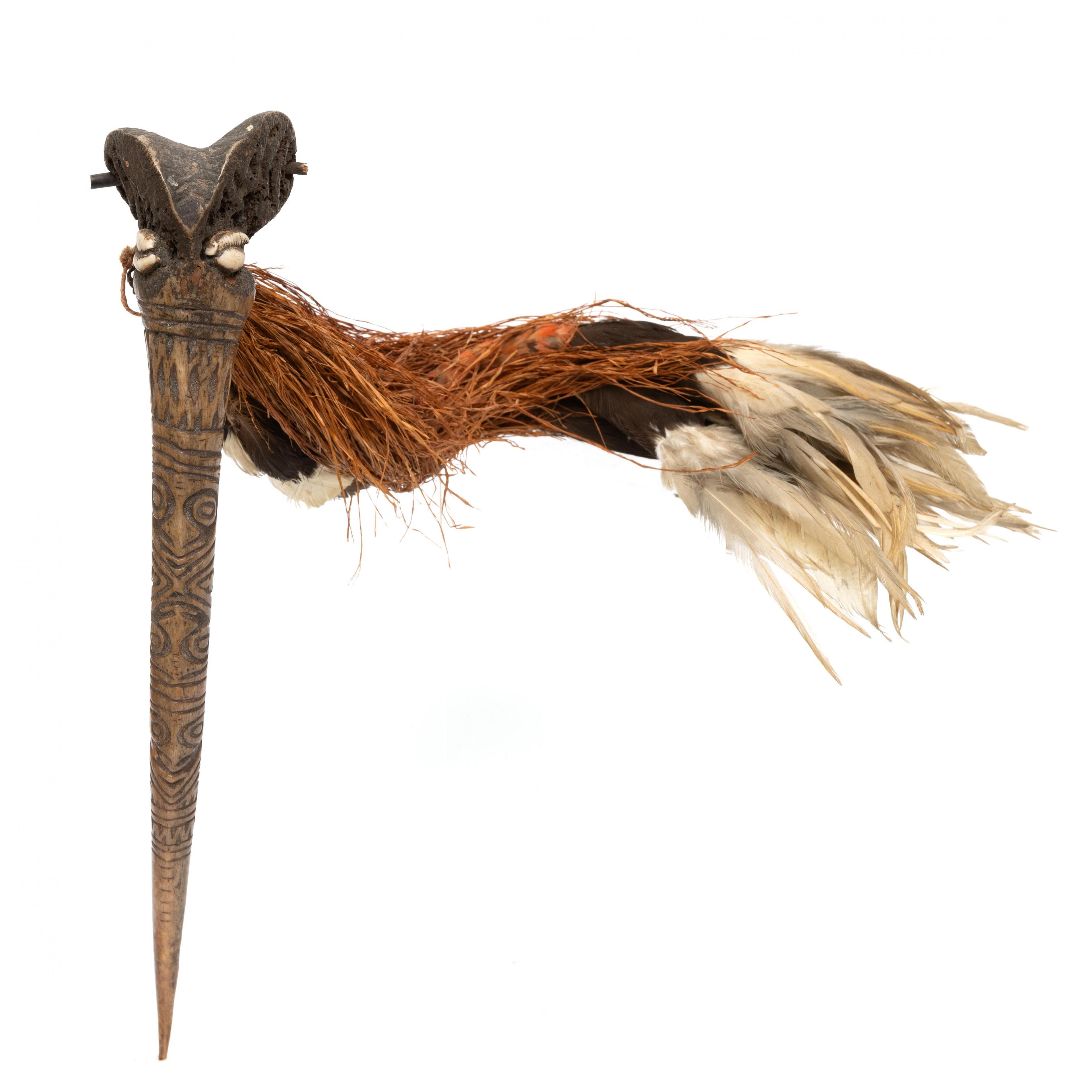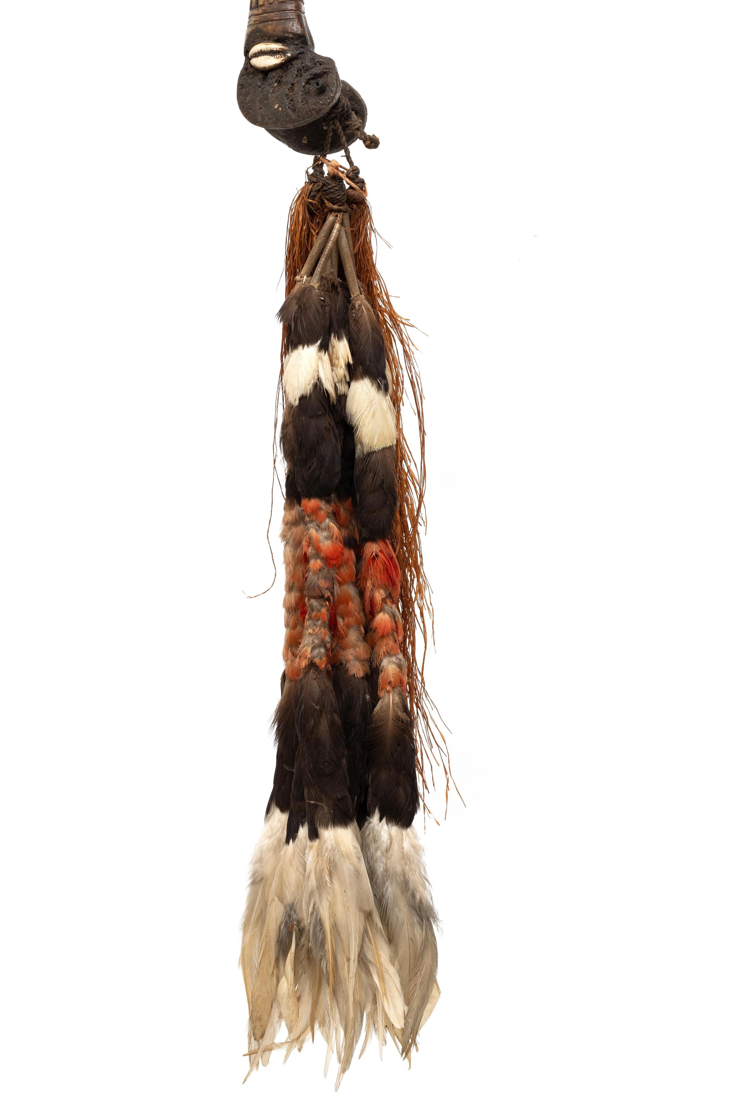 deeply cut pattern showing anthropomorphic heads, the upper part with two cowrie shells, feathered and sago strings attached to a bone plug.