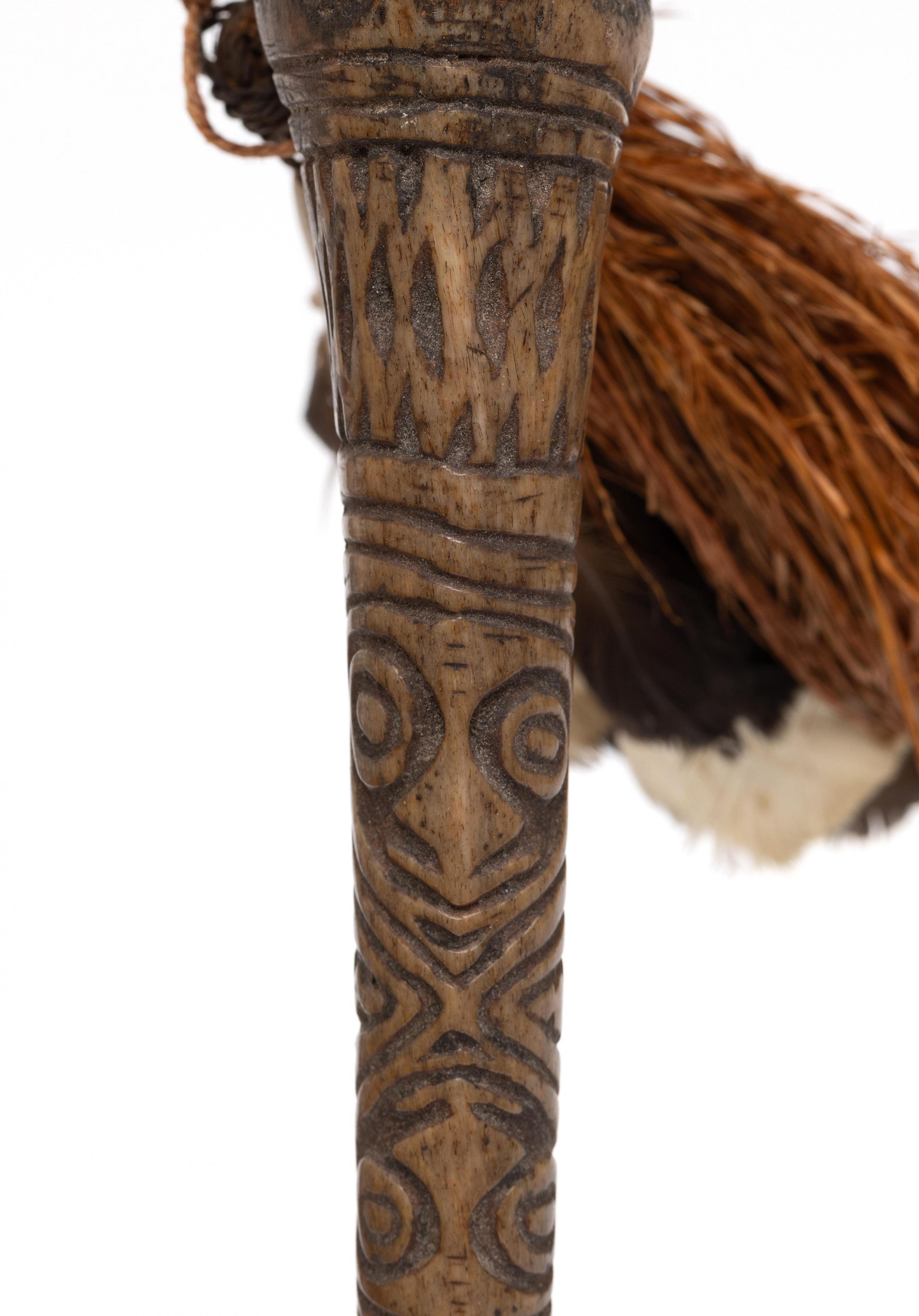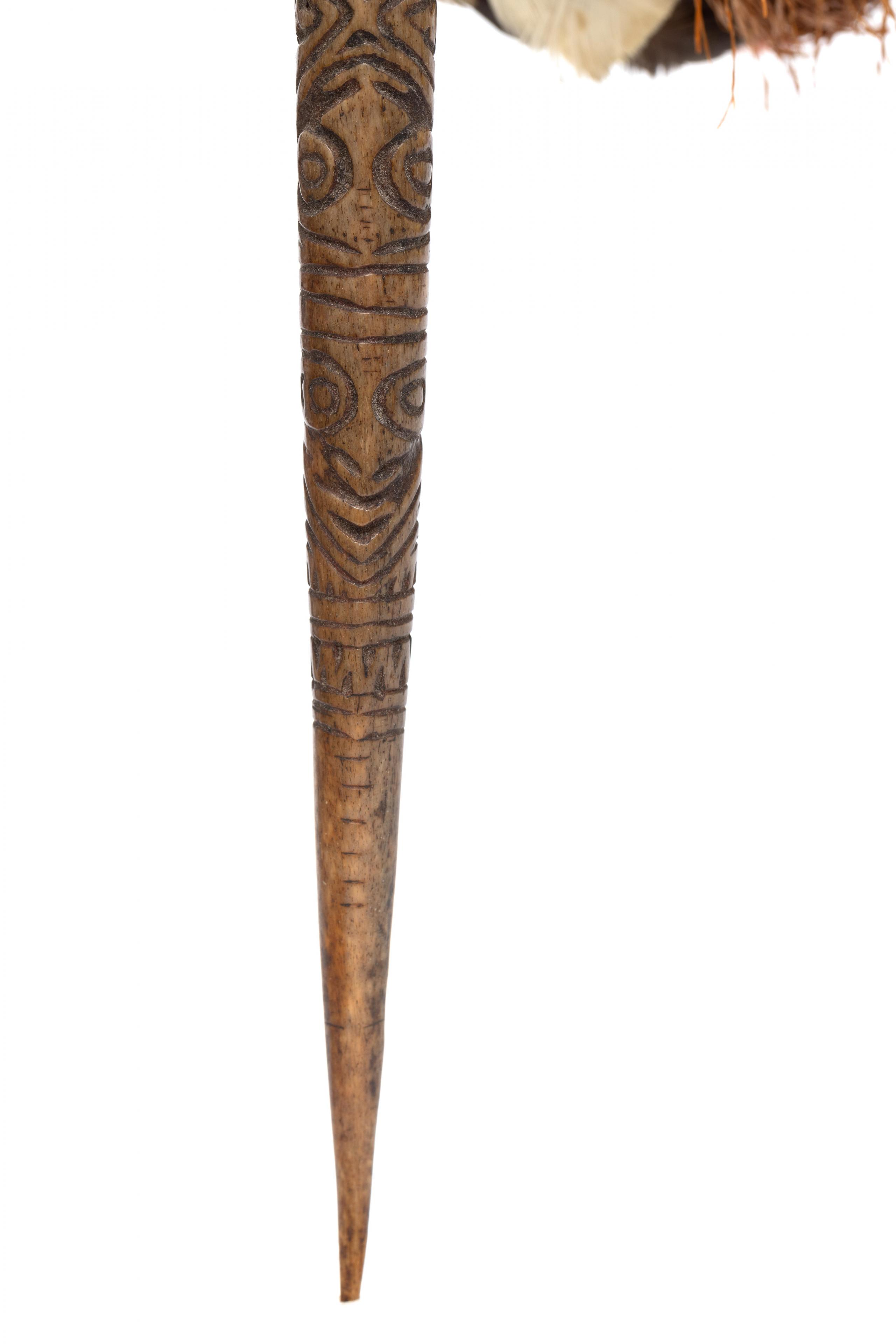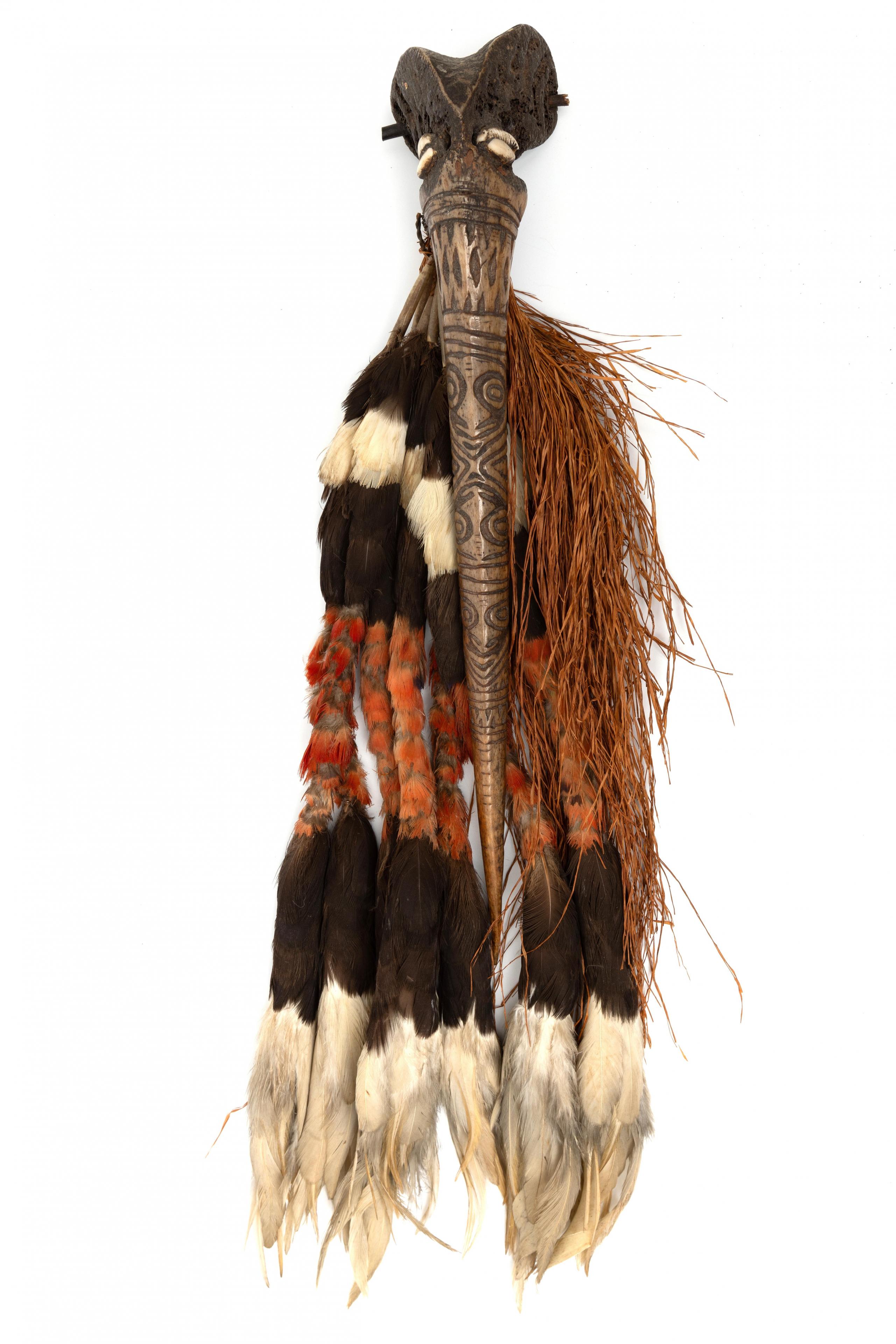 deeply cut pattern showing anthropomorphic heads, the upper part with two cowrie shells, feathered and sago strings attached to a bone plug.