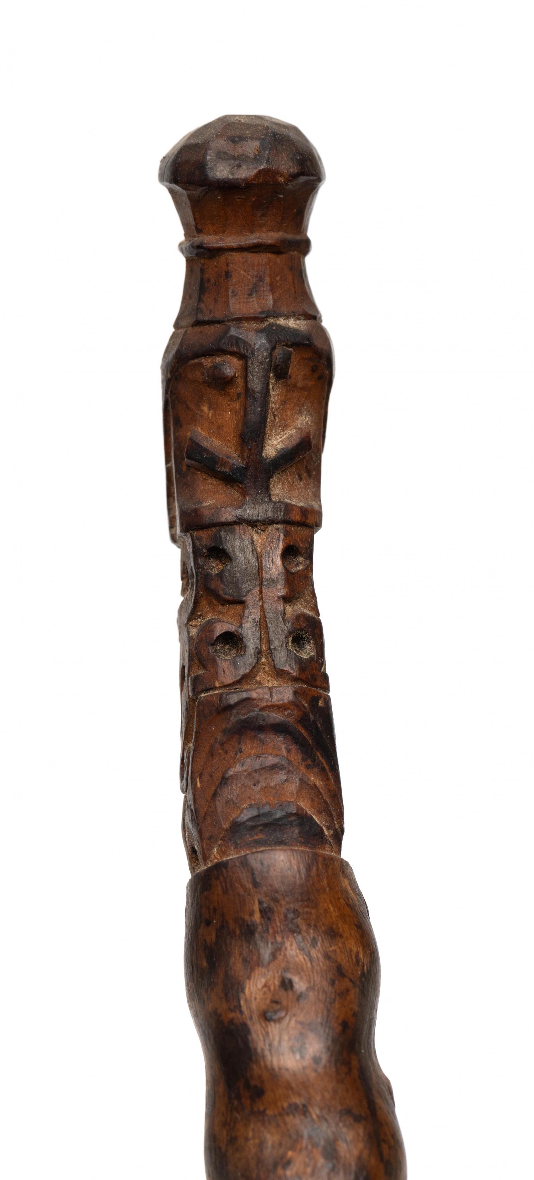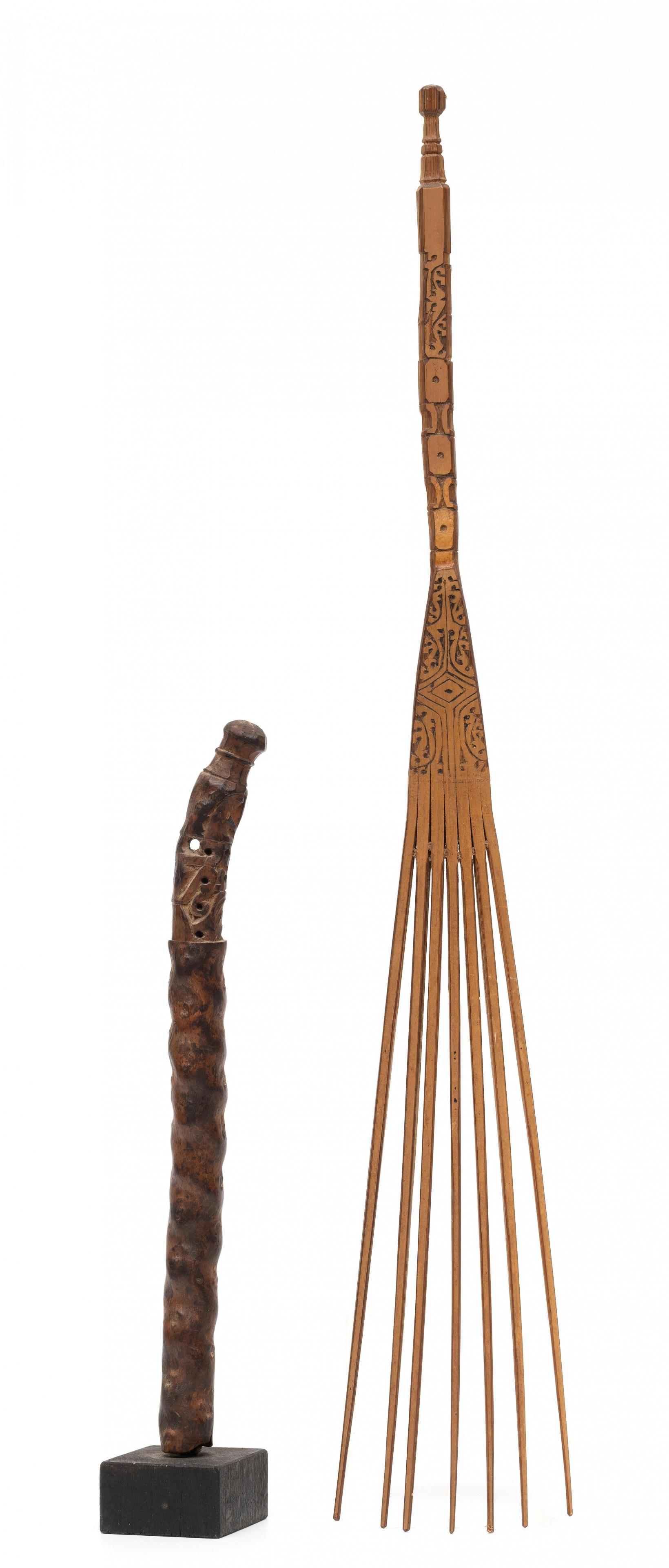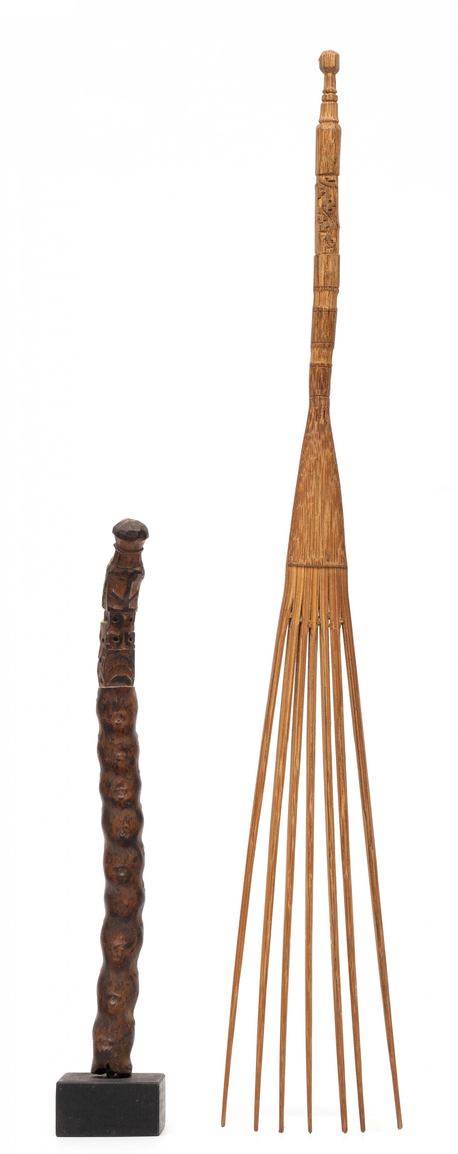 the nodular piece of wood topped by a korwar figure, partly pierced; herewith a bamboo comb.