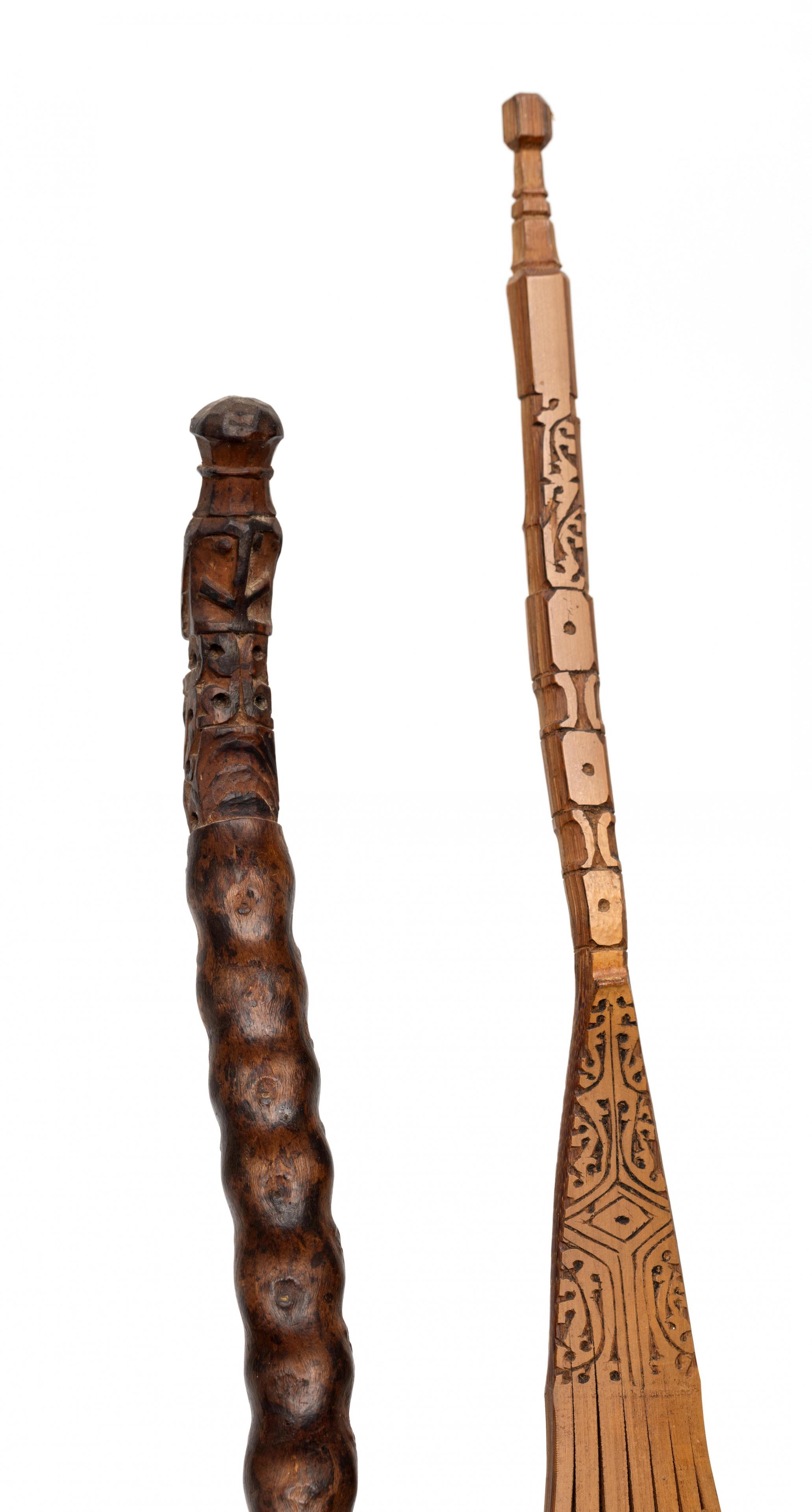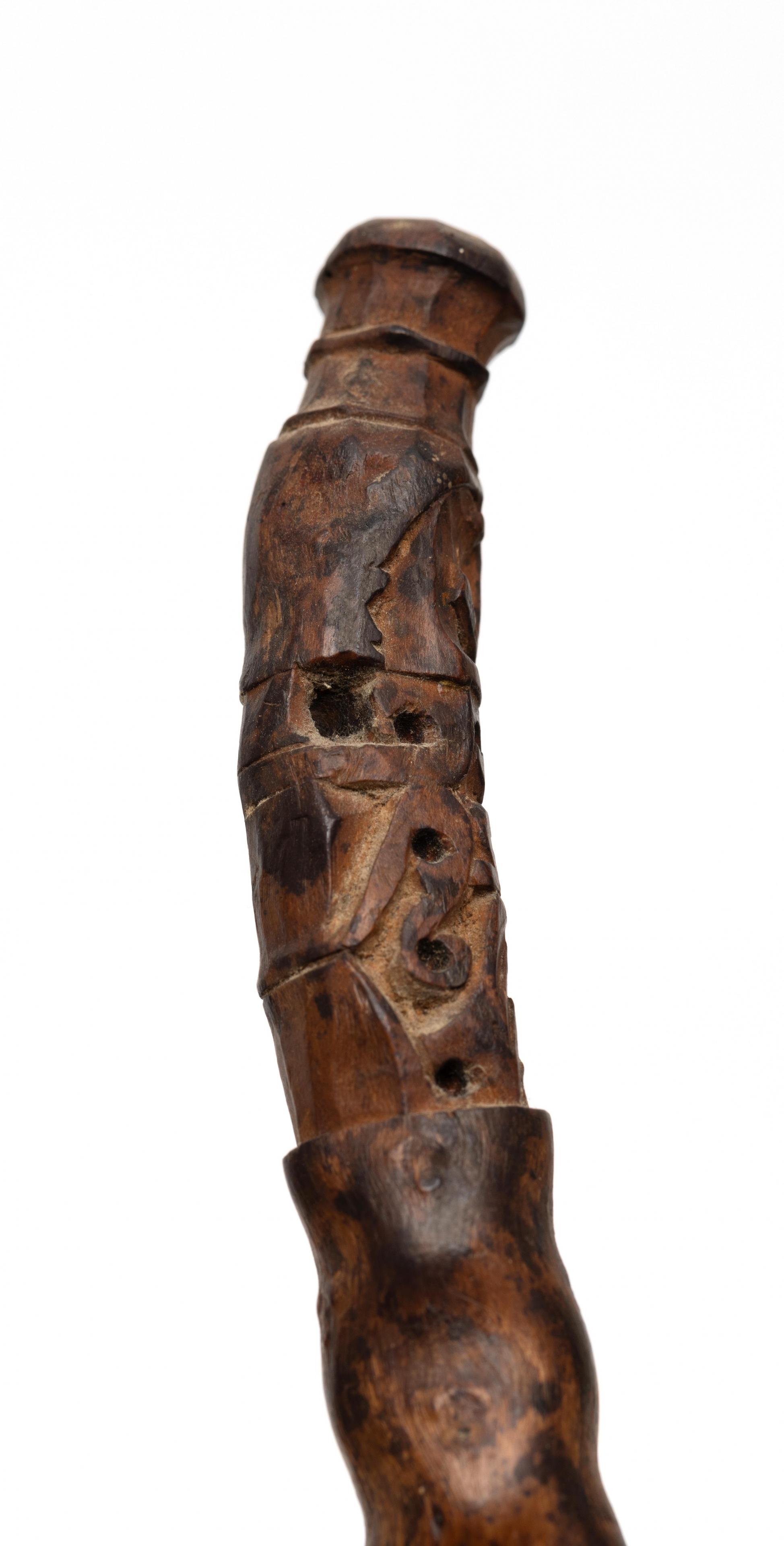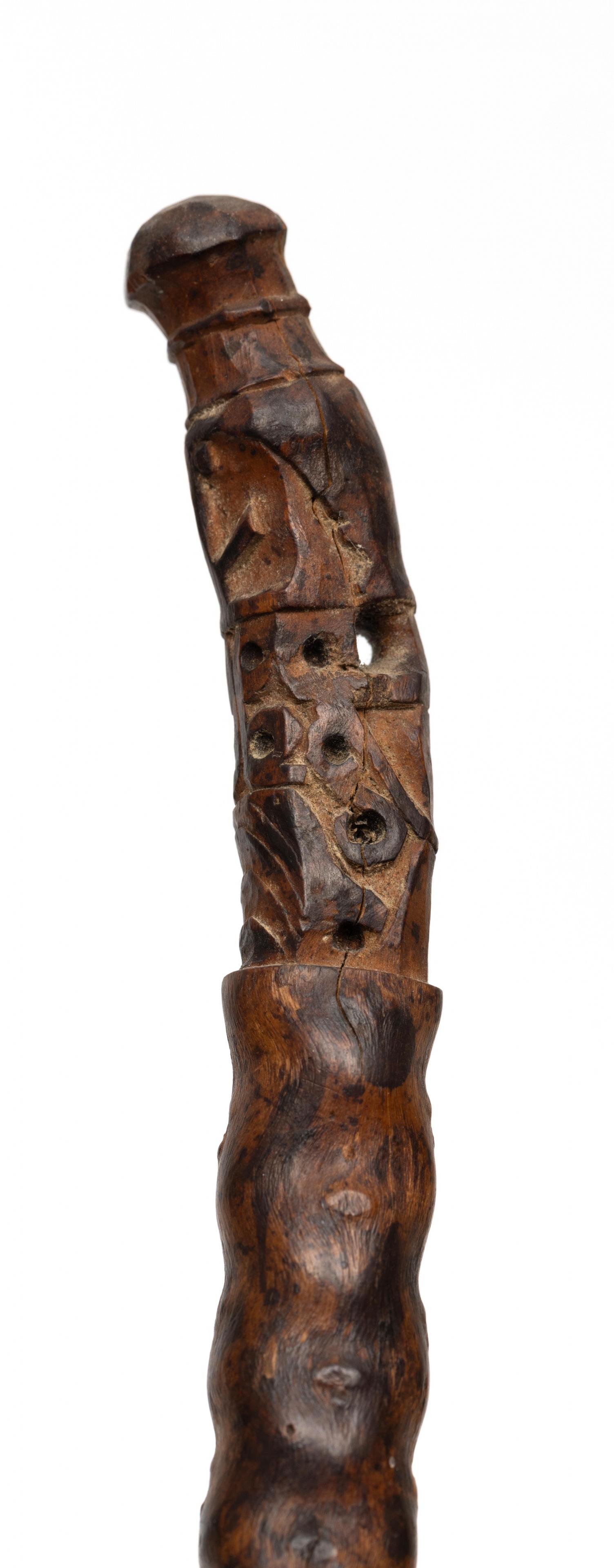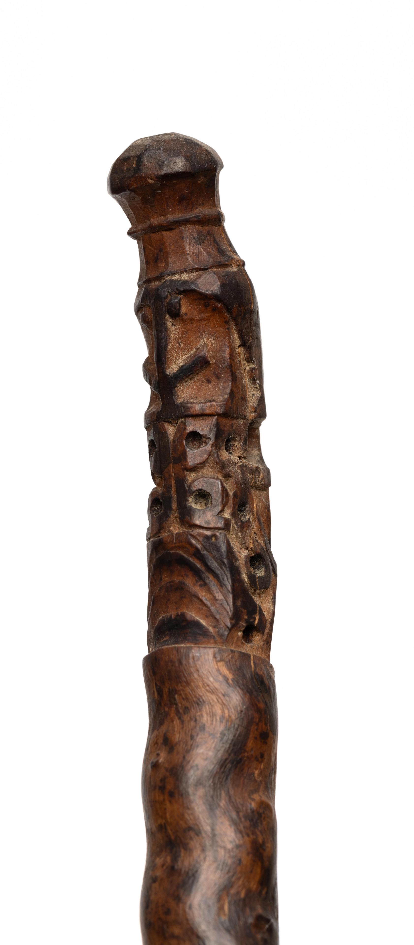 the nodular piece of wood topped by a korwar figure, partly pierced; herewith a bamboo comb.