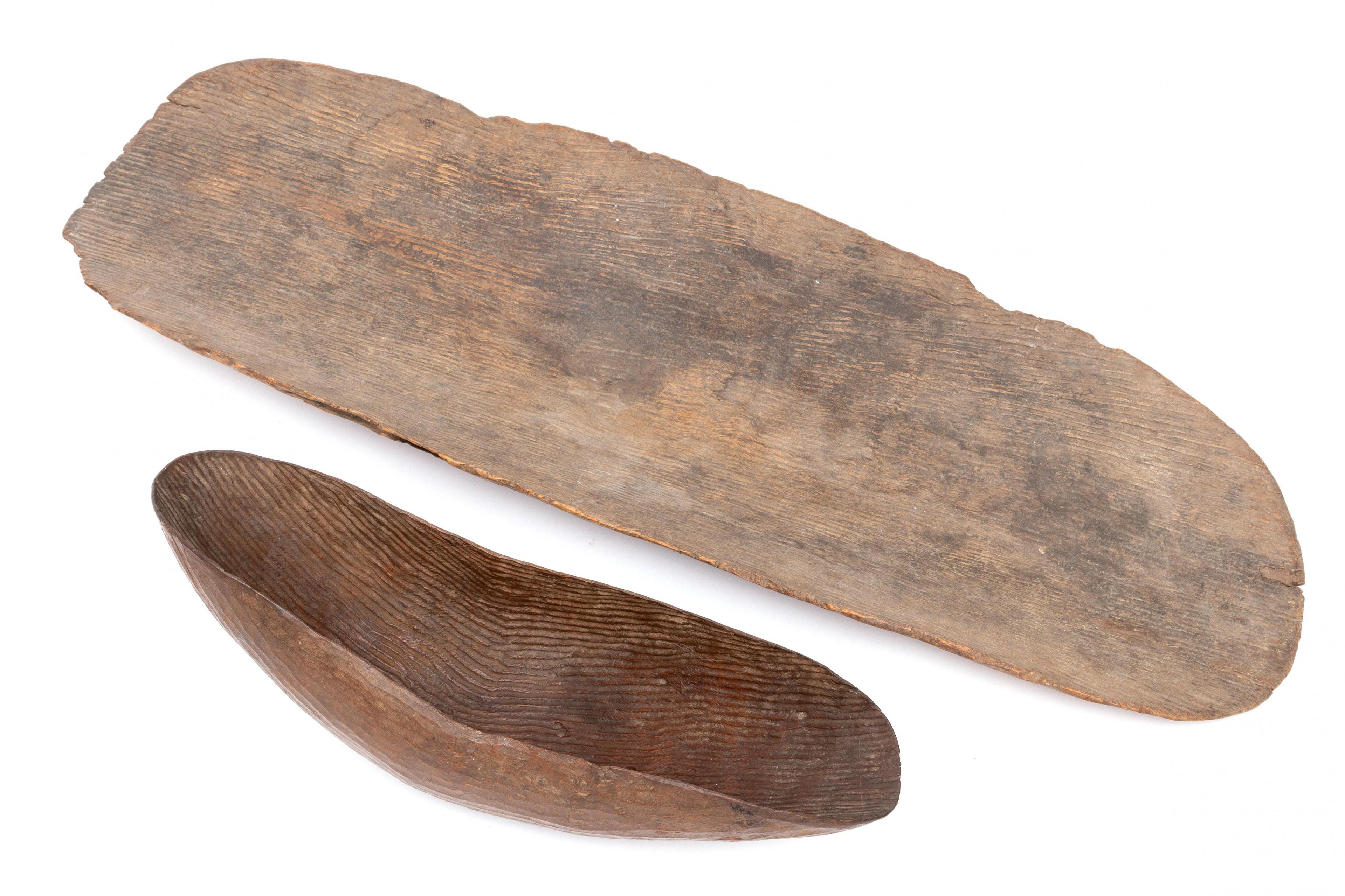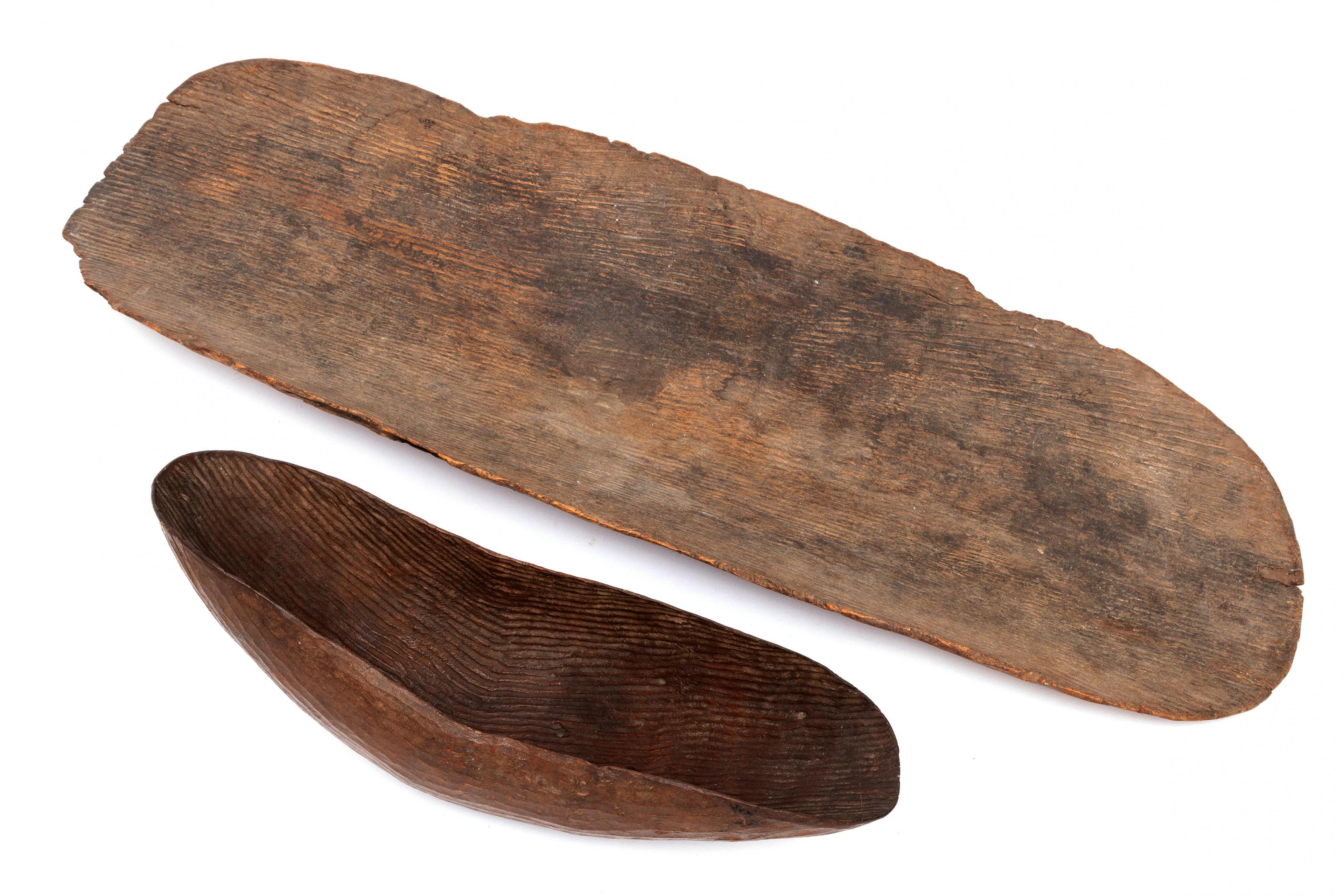 consisting of two containers with a grooved pattern and two spear throwers.