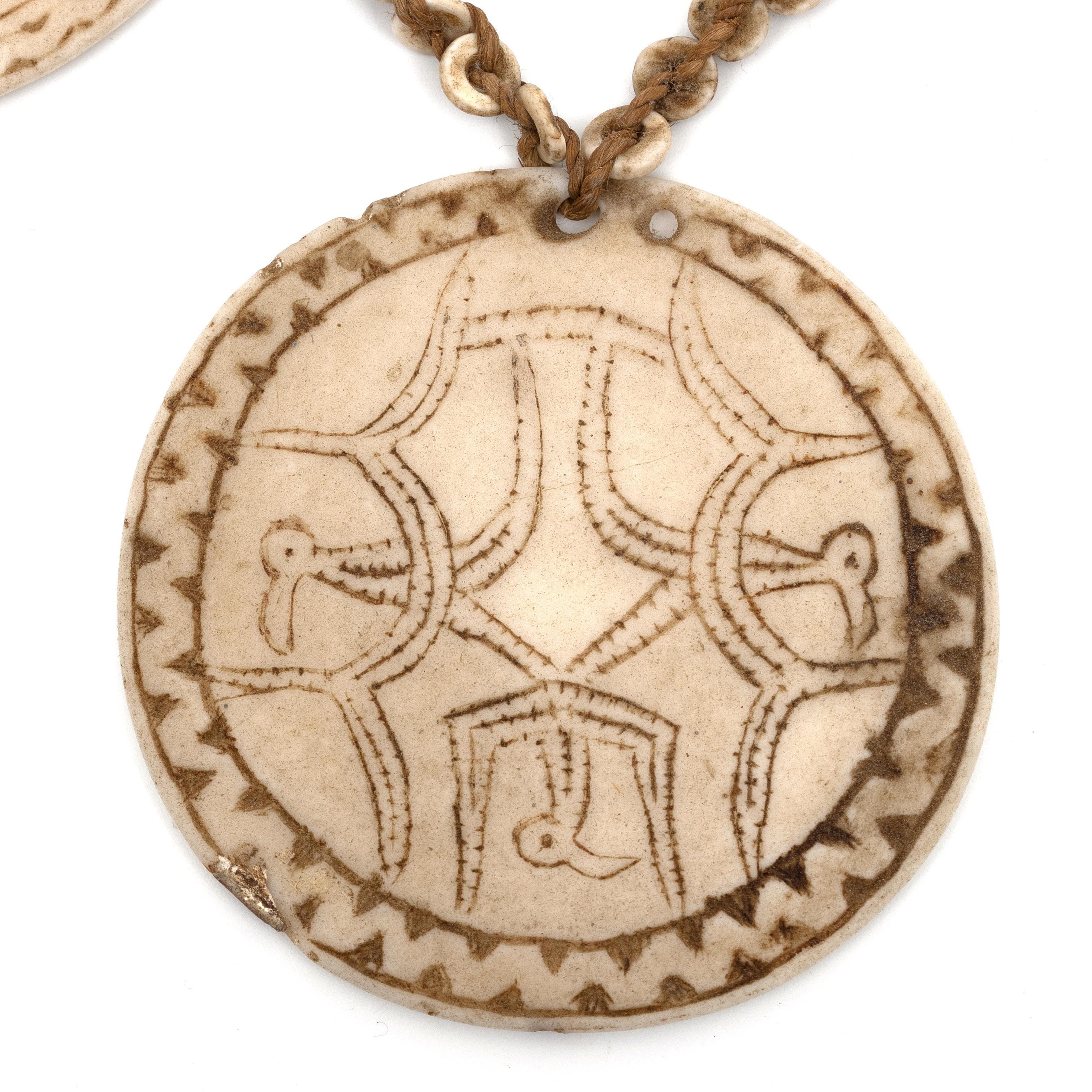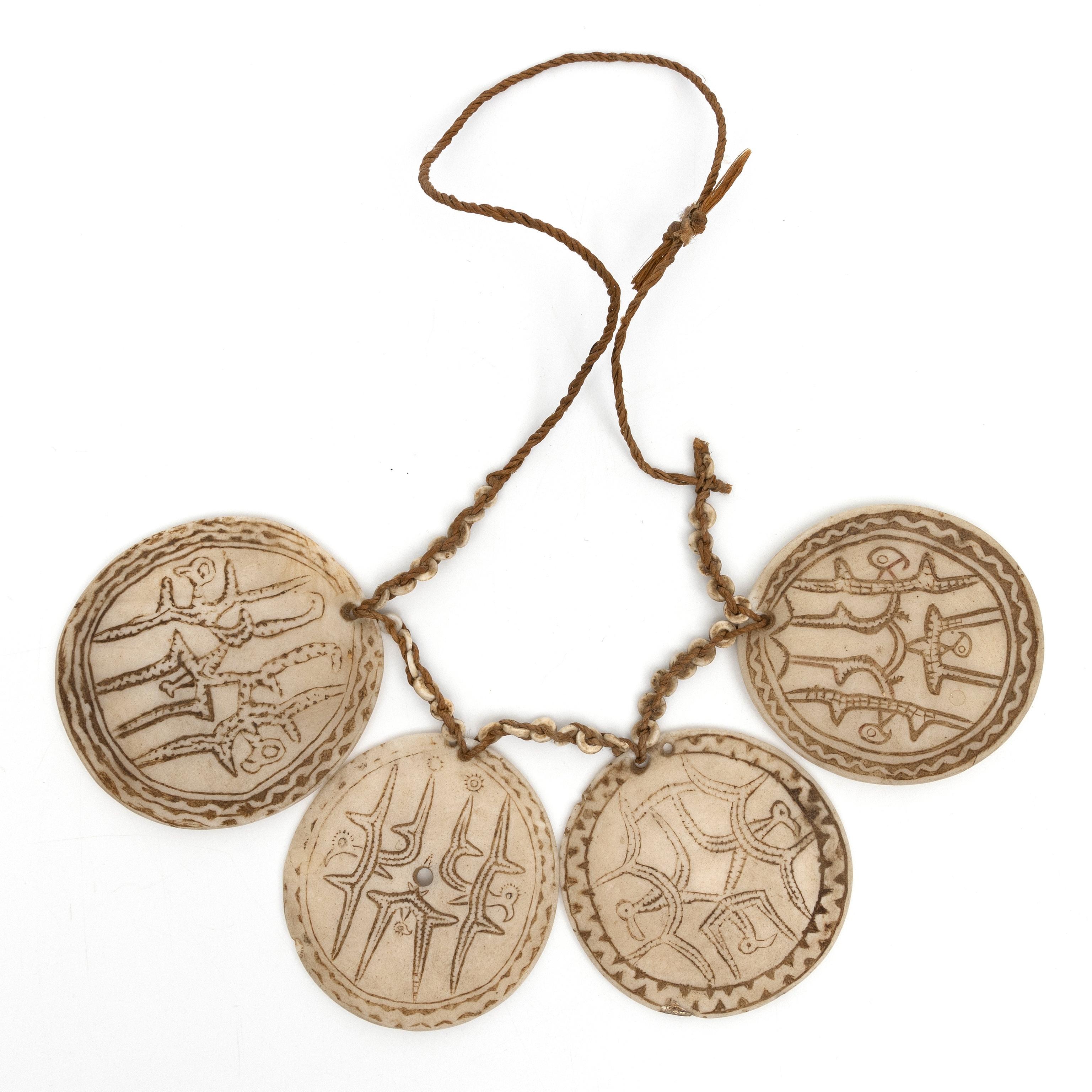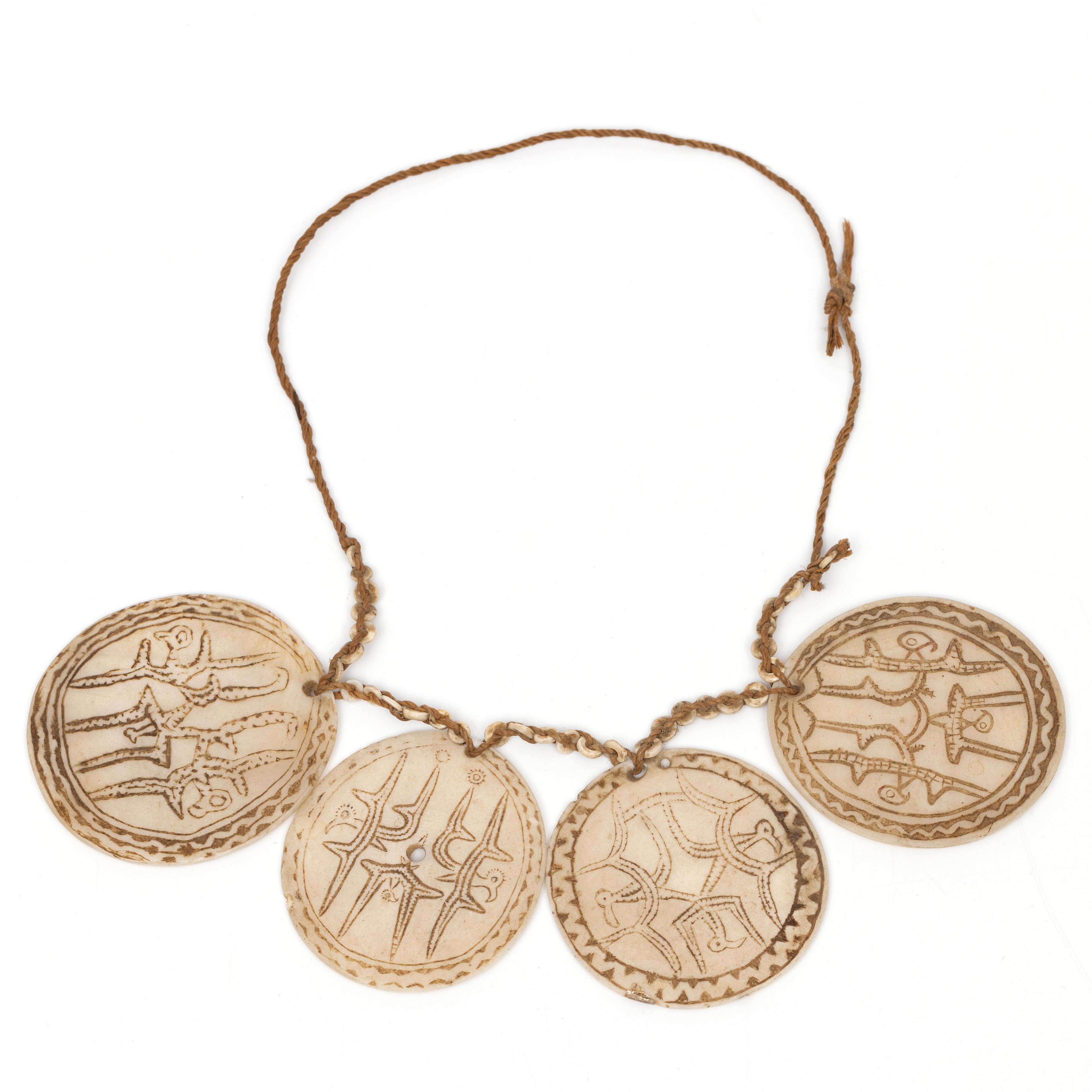 consisting of four circular pendants decorated with avian motifs, twisted plant fibre string with strung shell beads.