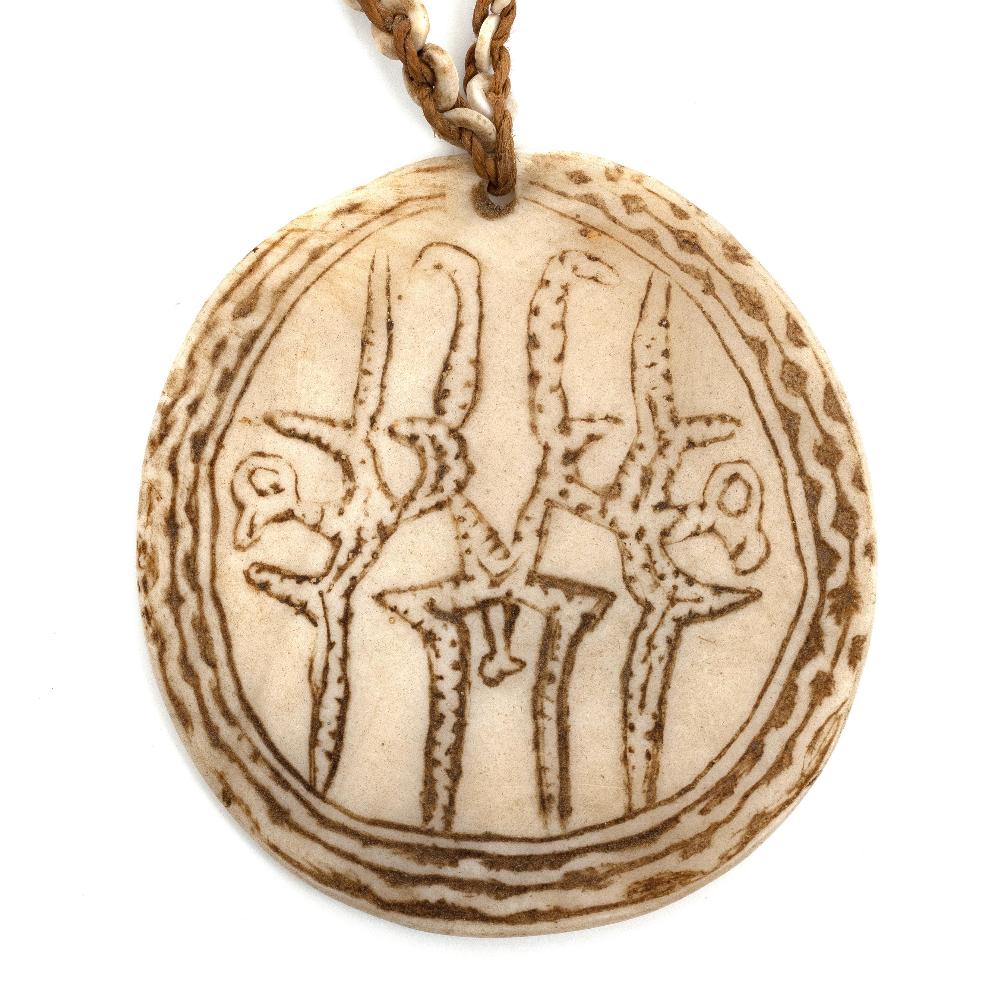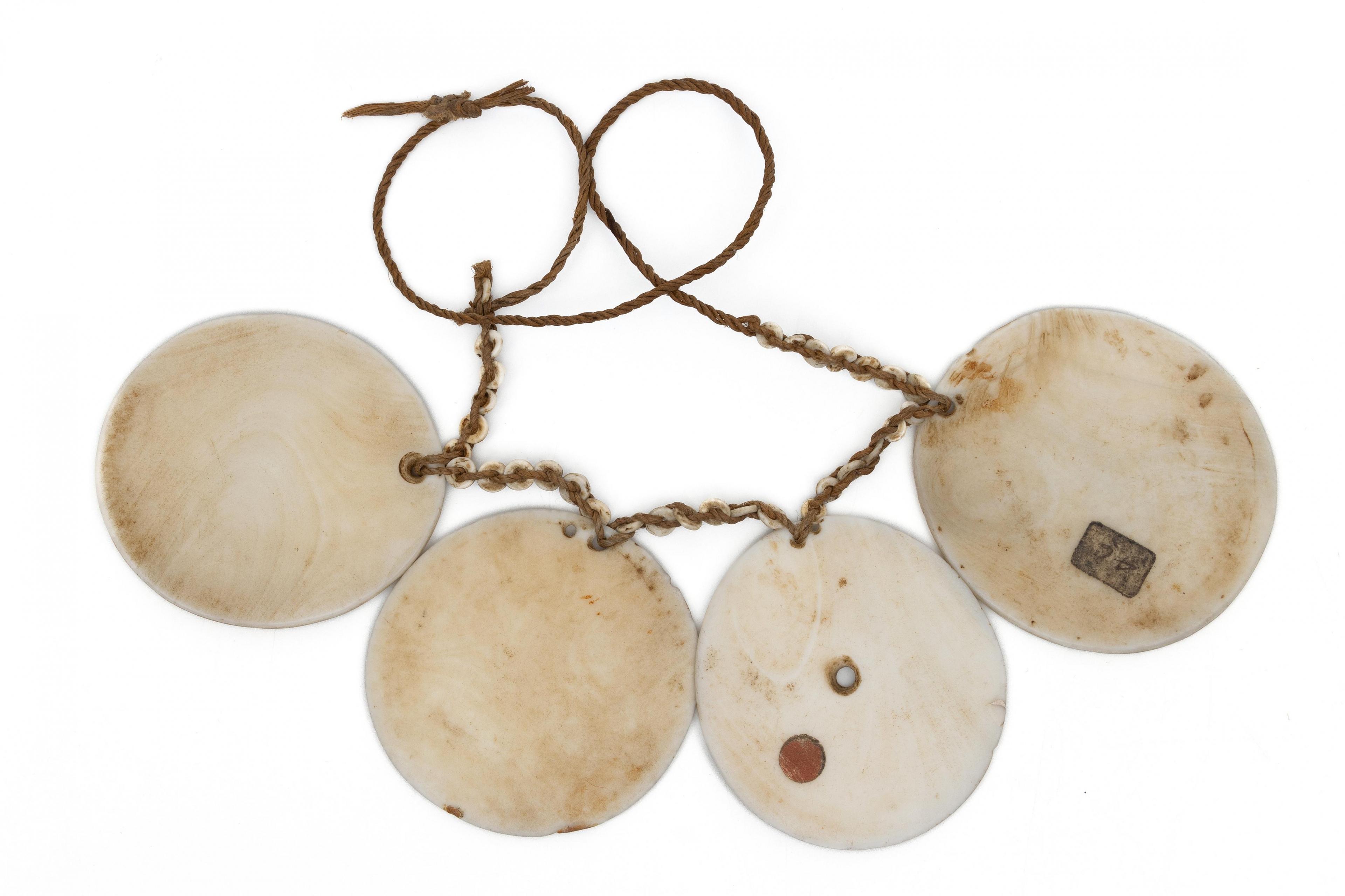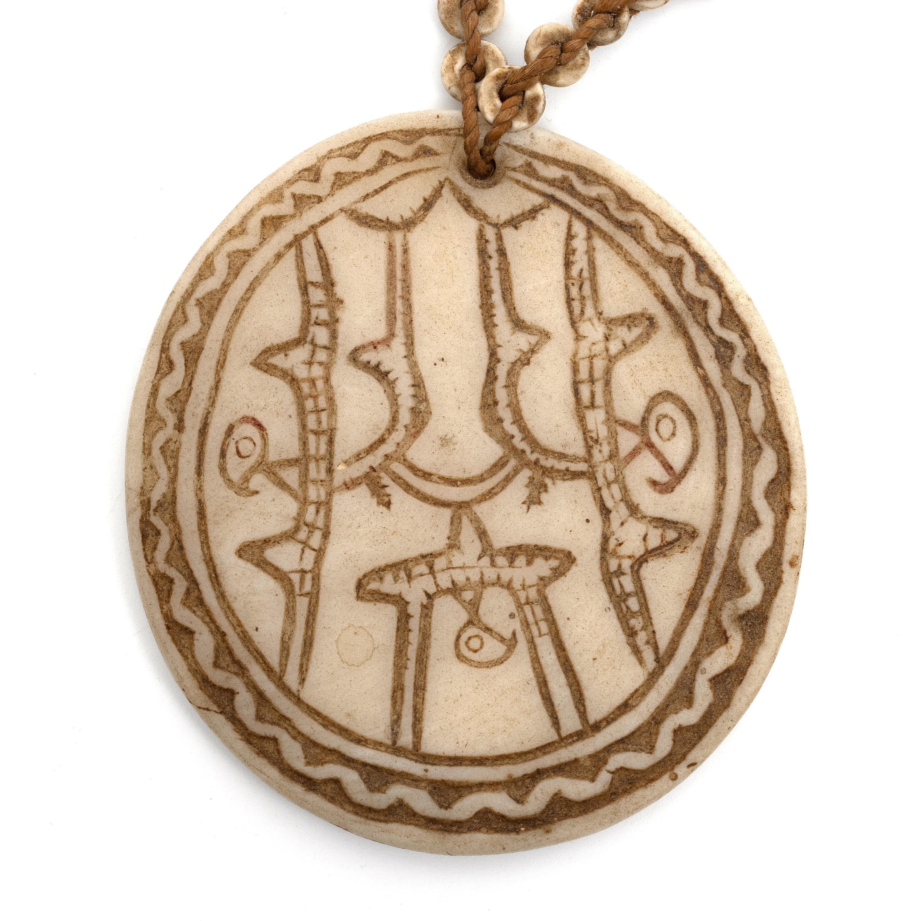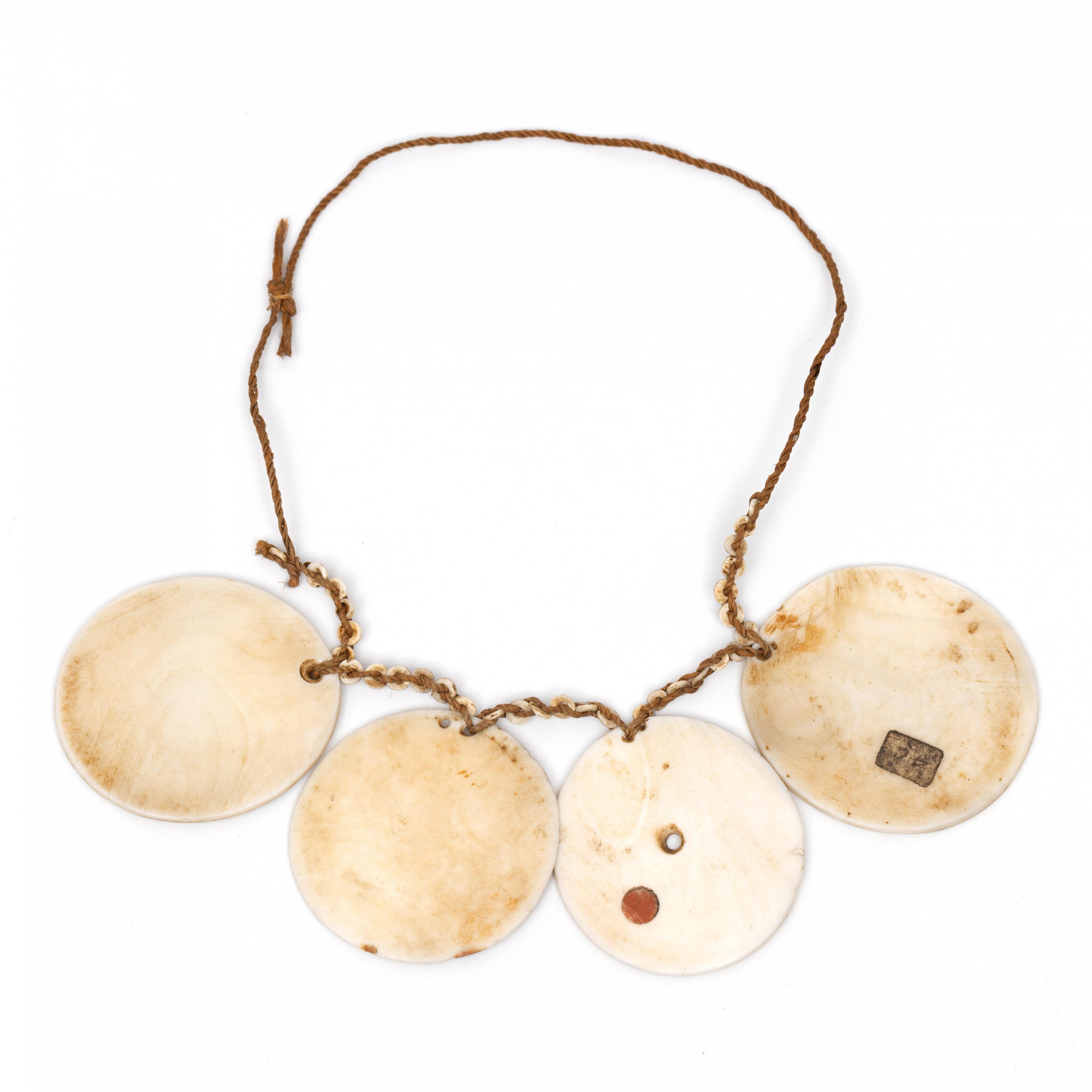 consisting of four circular pendants decorated with avian motifs, twisted plant fibre string with strung shell beads.