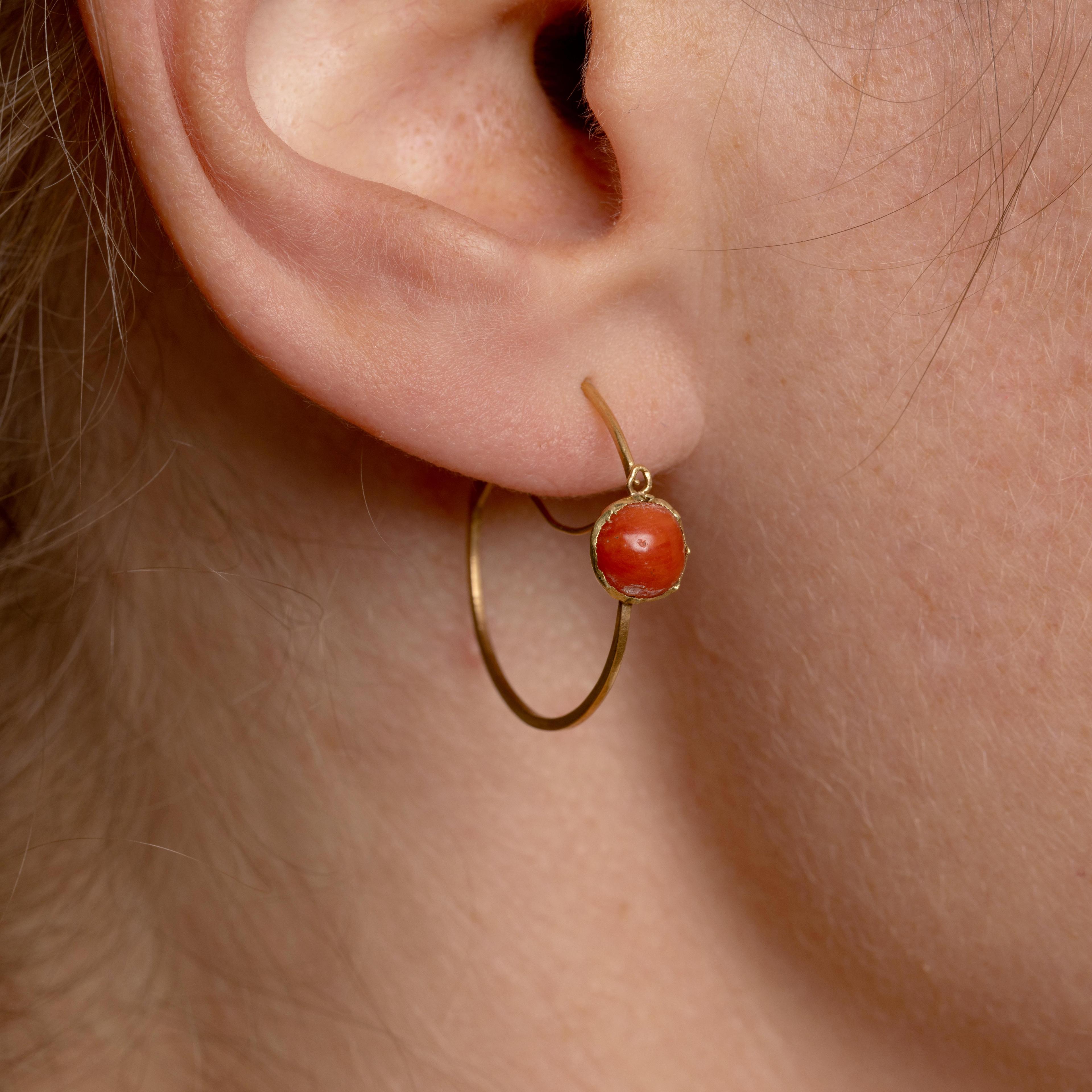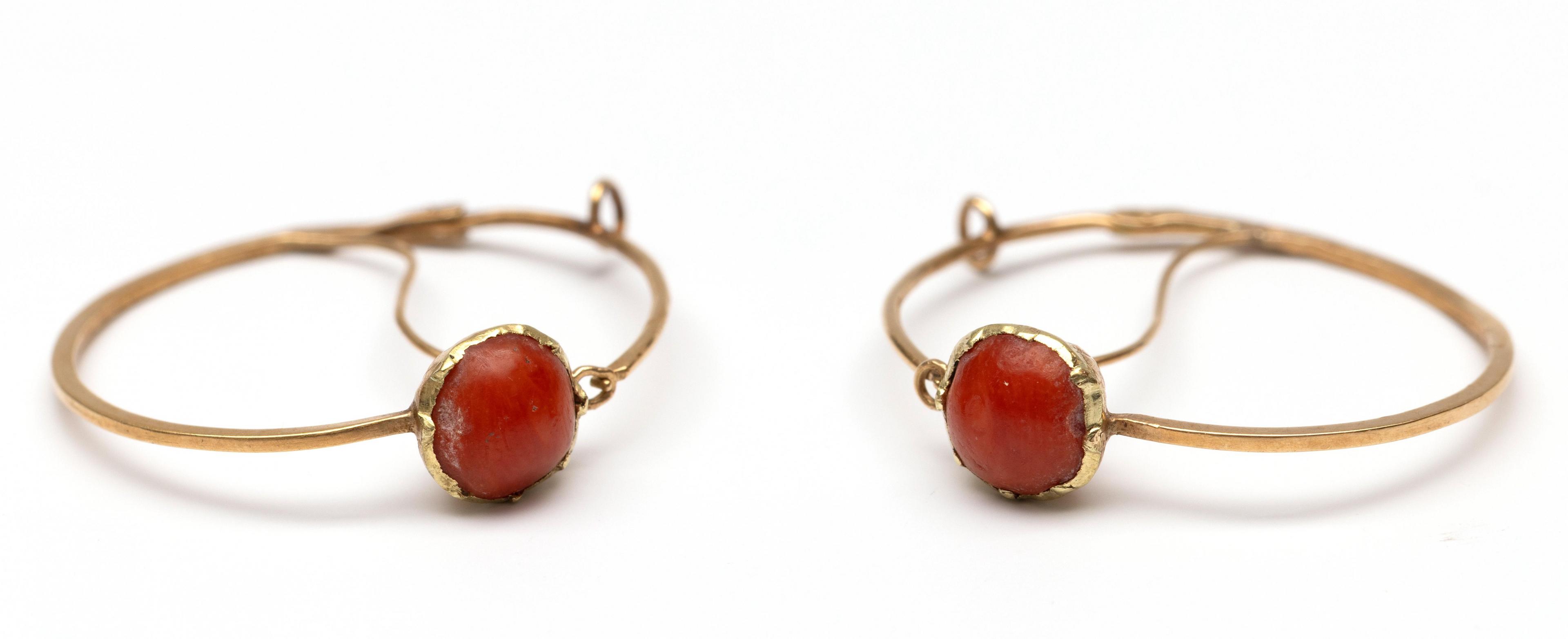 France, 14 k. gold poissardes earrings, ca. 1800. Each set with a cabochon cut coral. With presumably 18th century city hallmark and master mark P and L, in one.