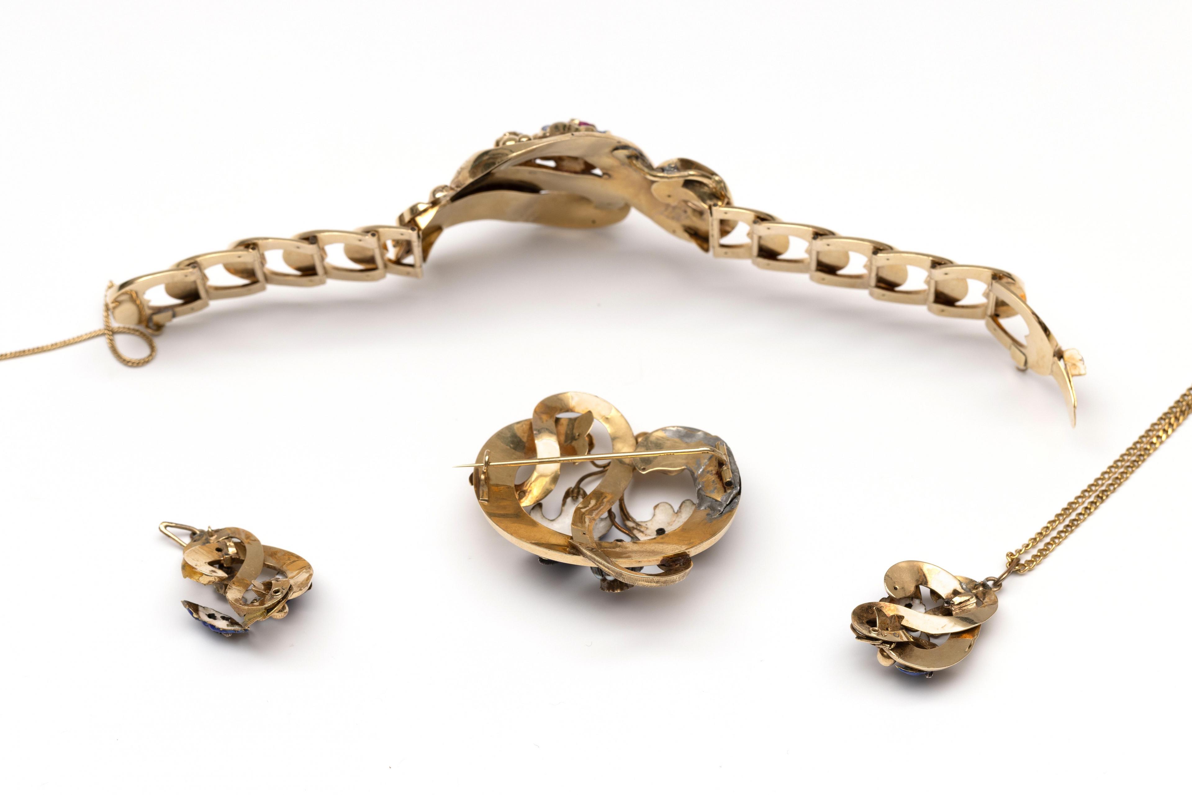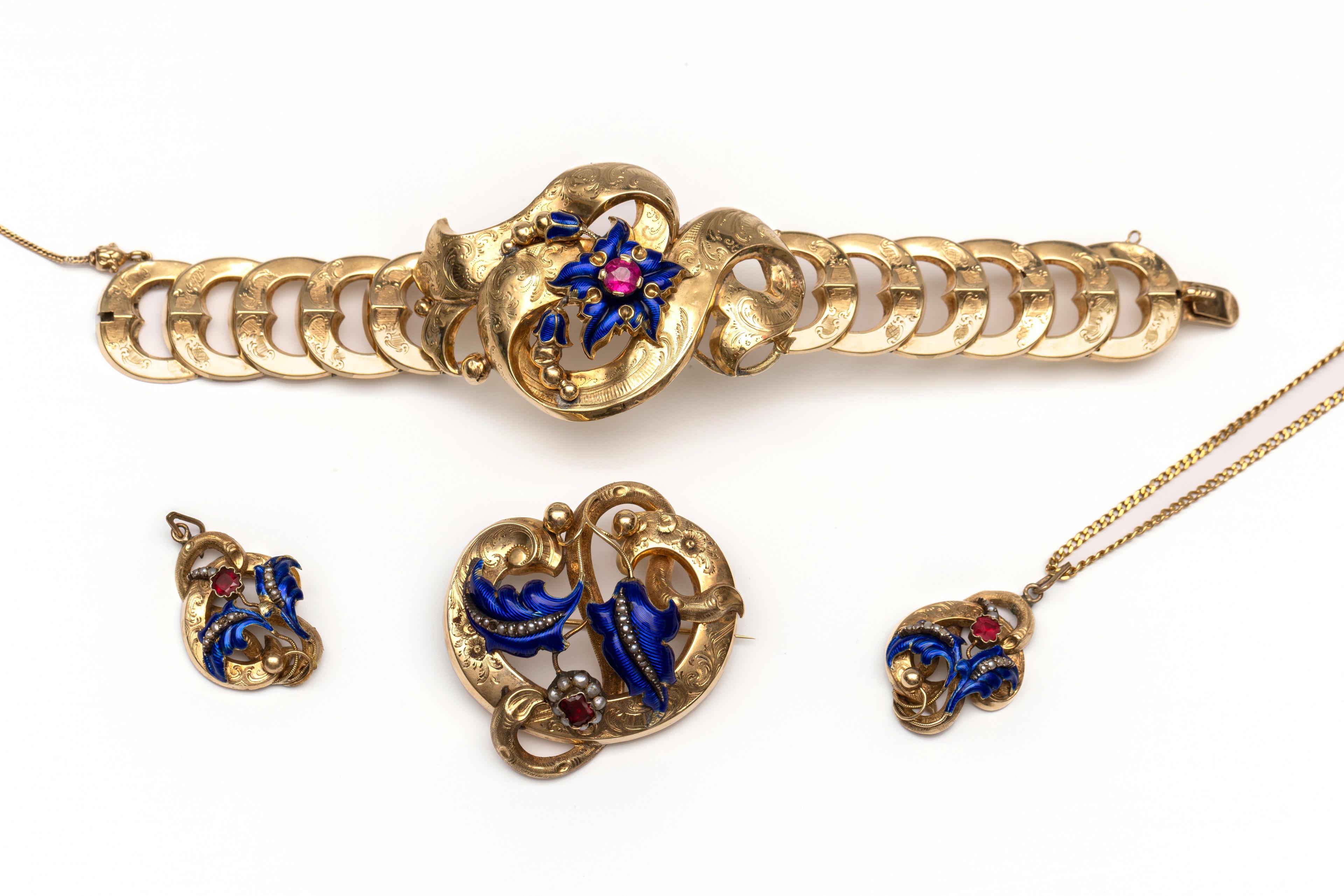 Bestaande uit een armband, broche een een paar hanger (oorspronkelijk oorbellen). Waarop blauw geëmailleerde bloem- en bladmotieven en bezet met imitatie robijn en kleine halve parels. Het geheel rijkelijk gedecoreerd met gravé. Hierbij een fijn gouden gourmet schakel collier. Gekeurd met stempel 14P.