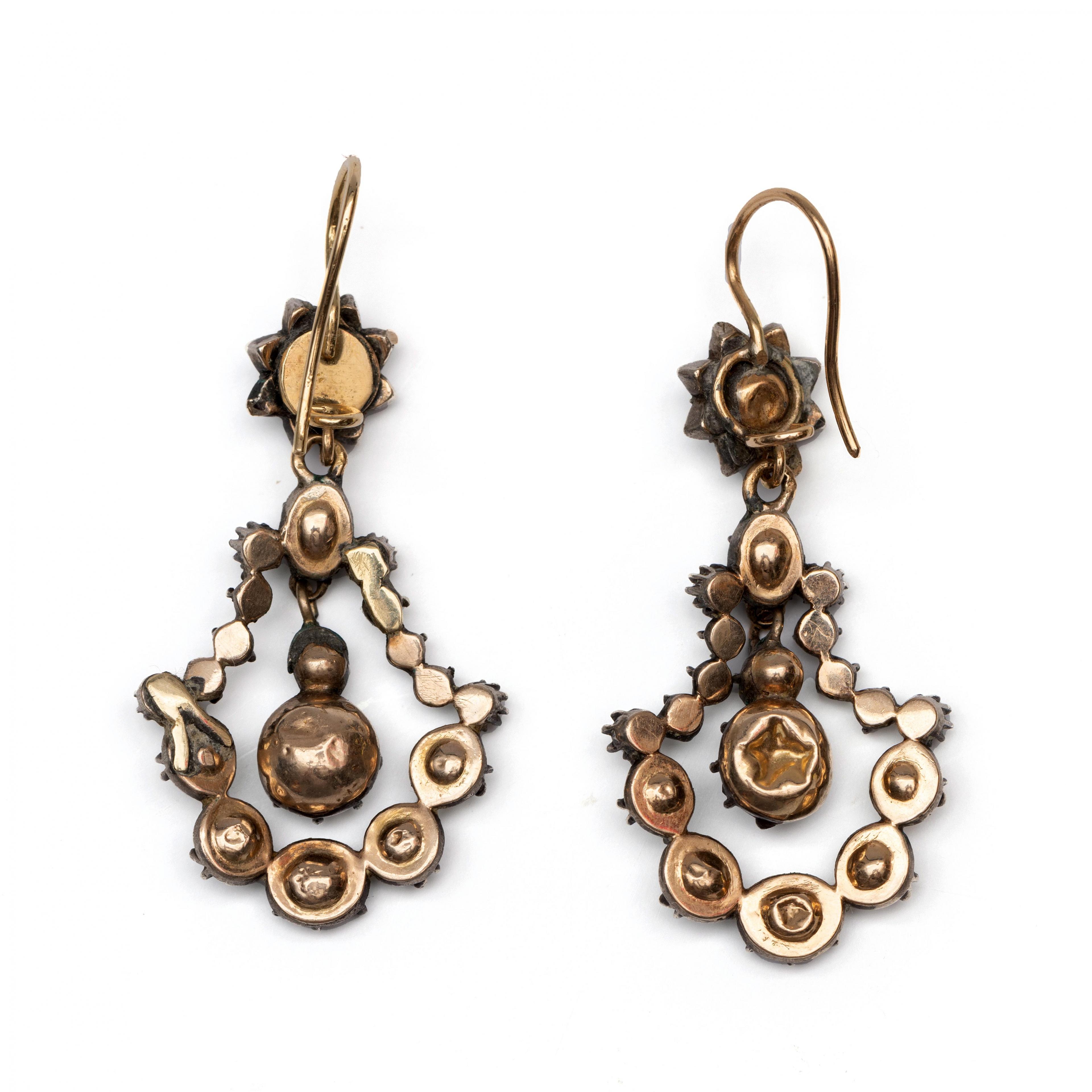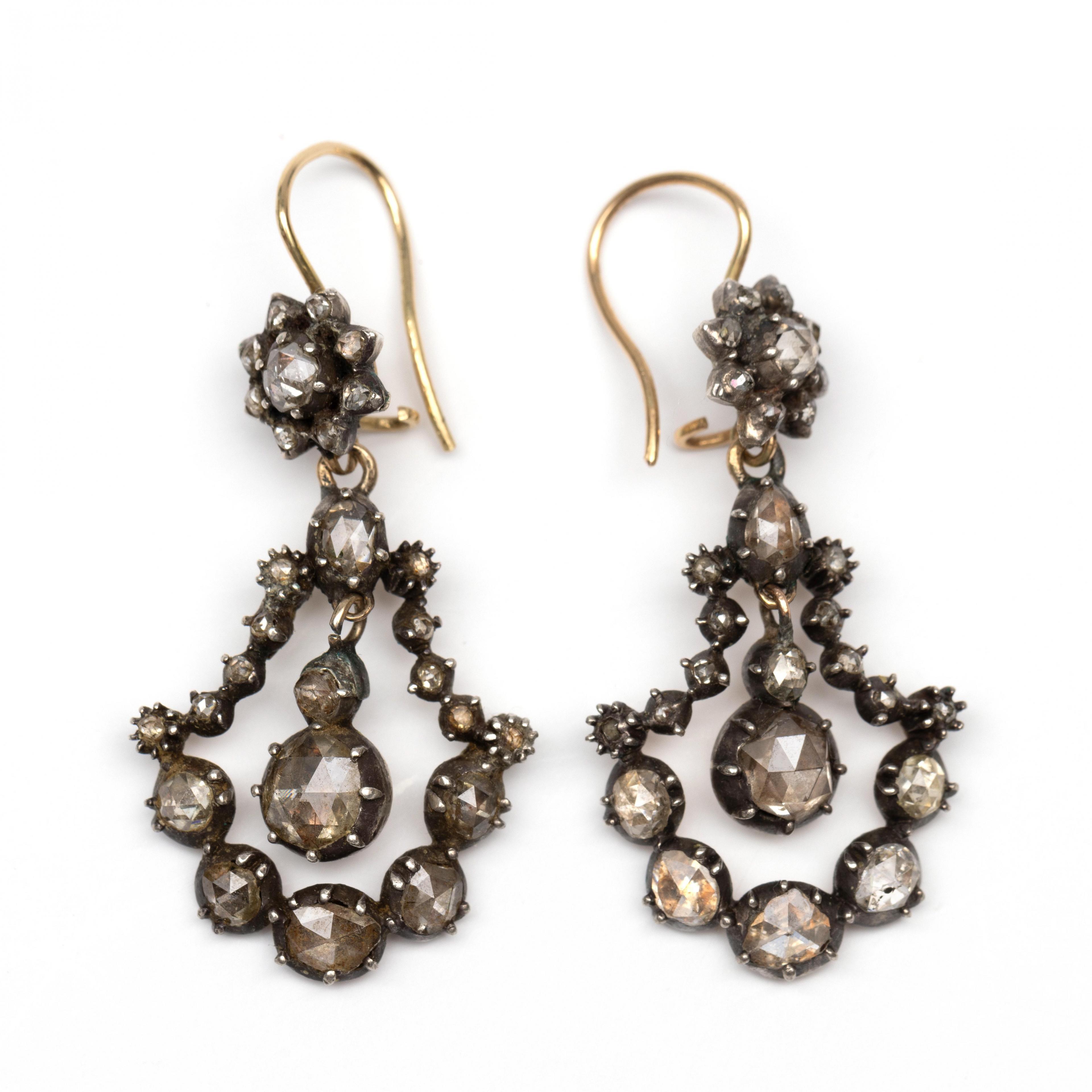 14 k. Gold and silver earrings, 19th century. Consisting of a rosette under which a harp-shaped ornament in which, dangling loosely, a drop. The whole is set with rose-cut diamonds. The gold hooks are of a later date