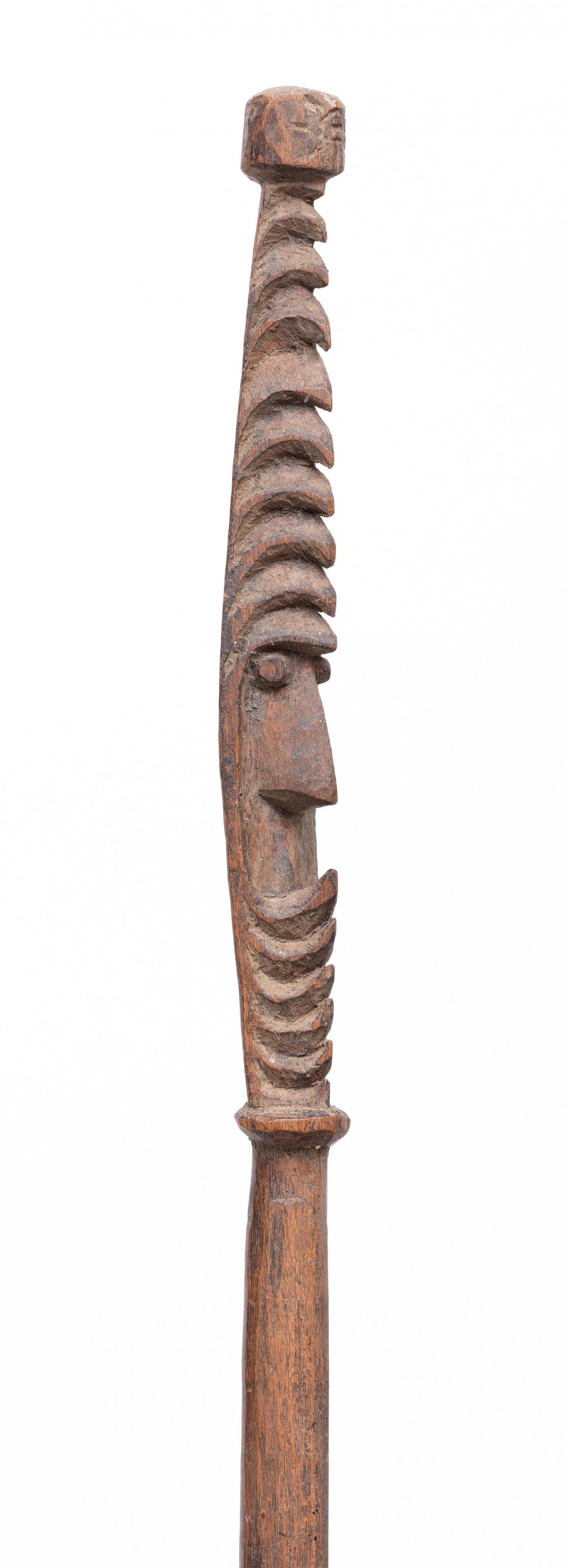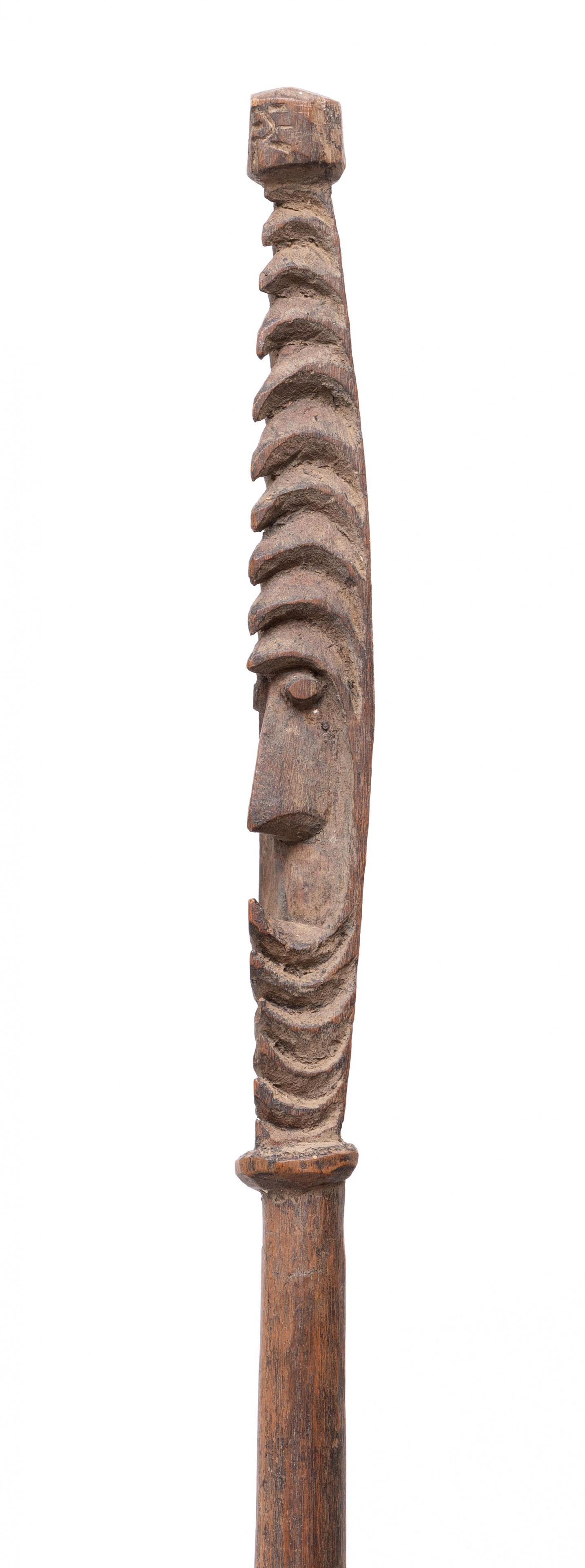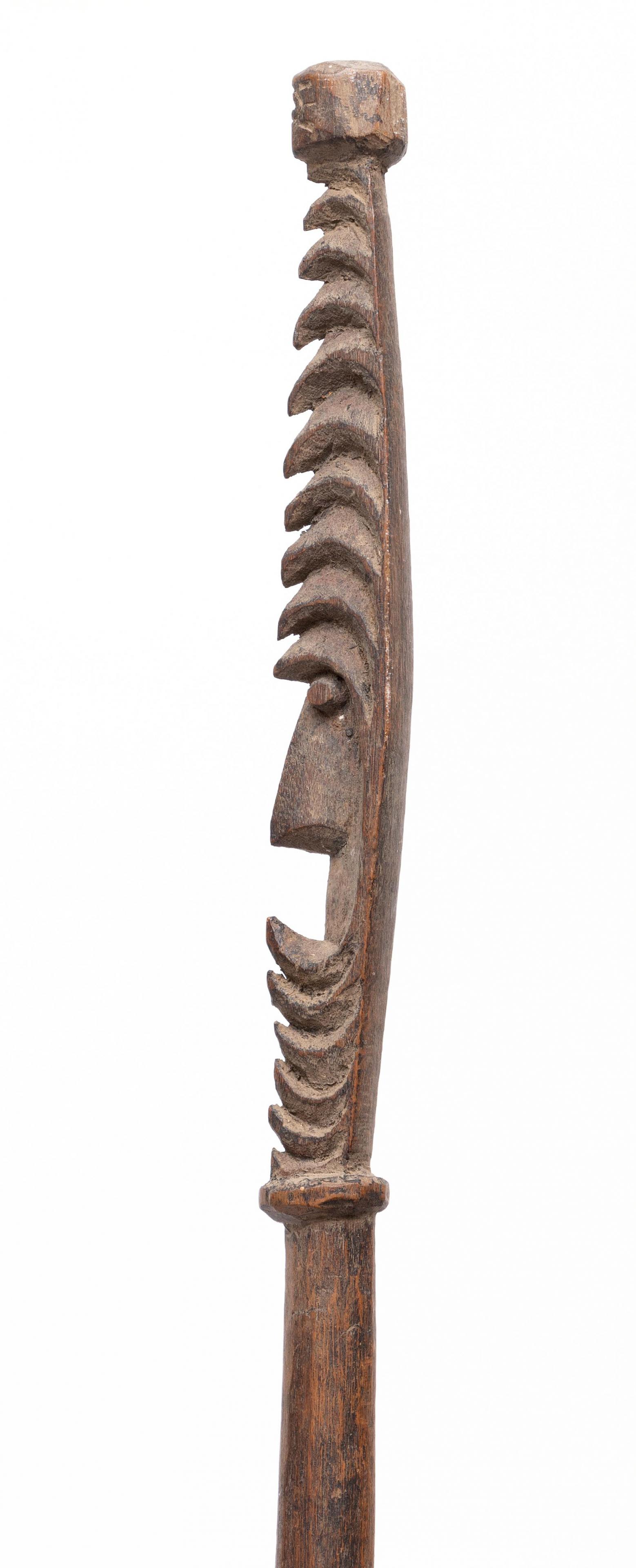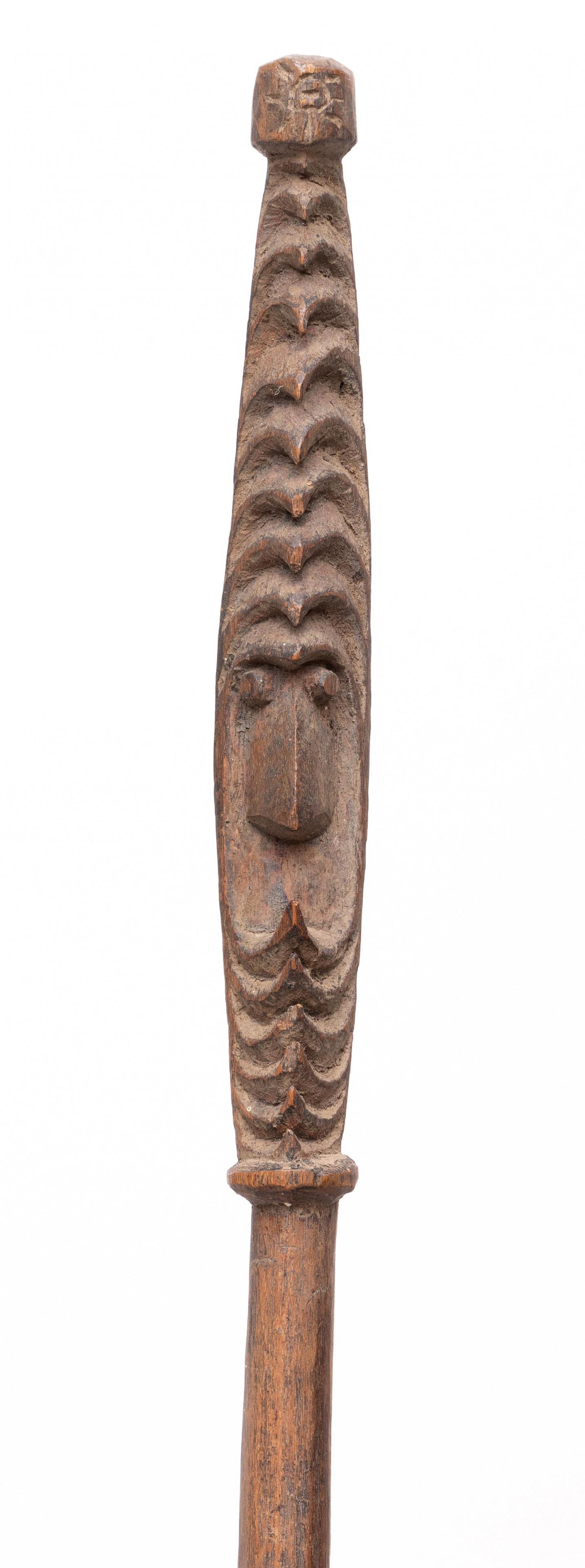 the top with a carved spirit mask, the blade showing a geometric pattern.