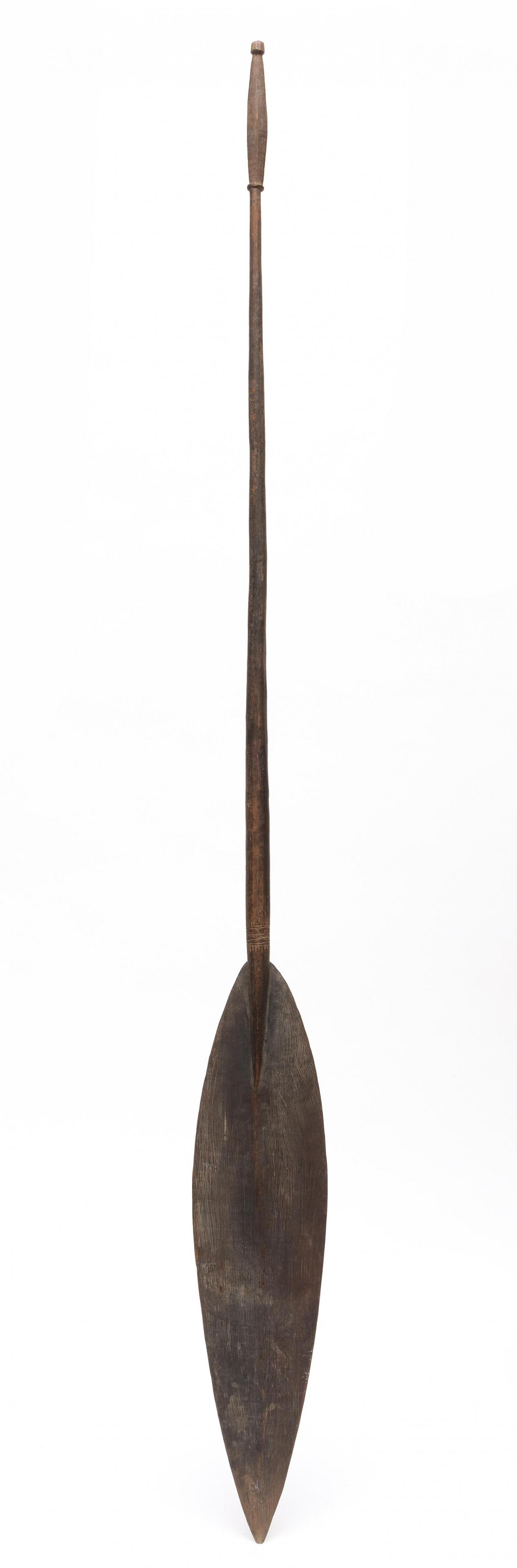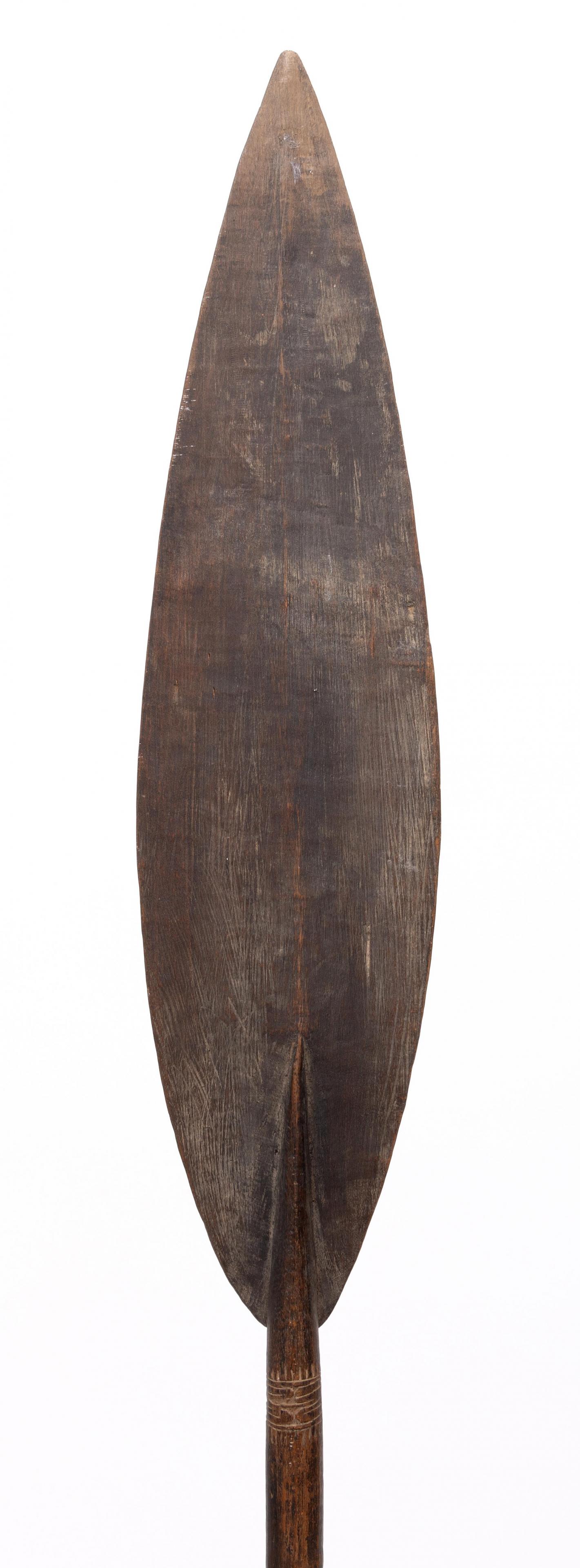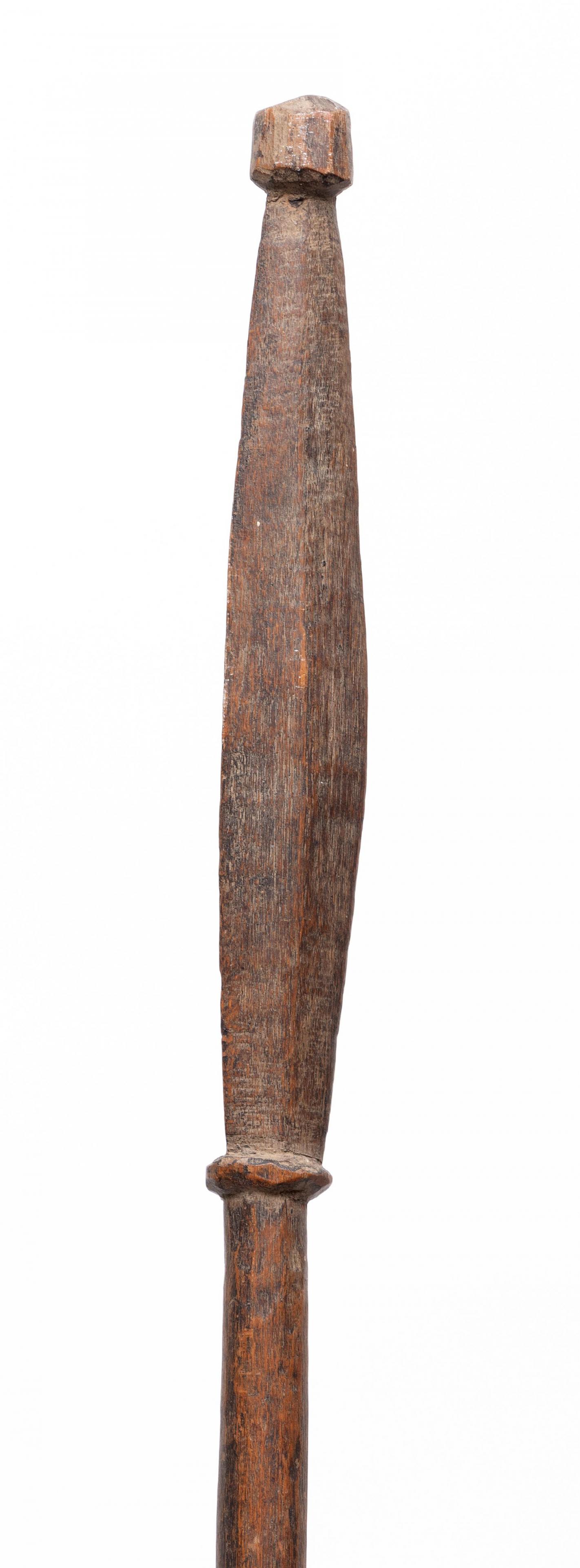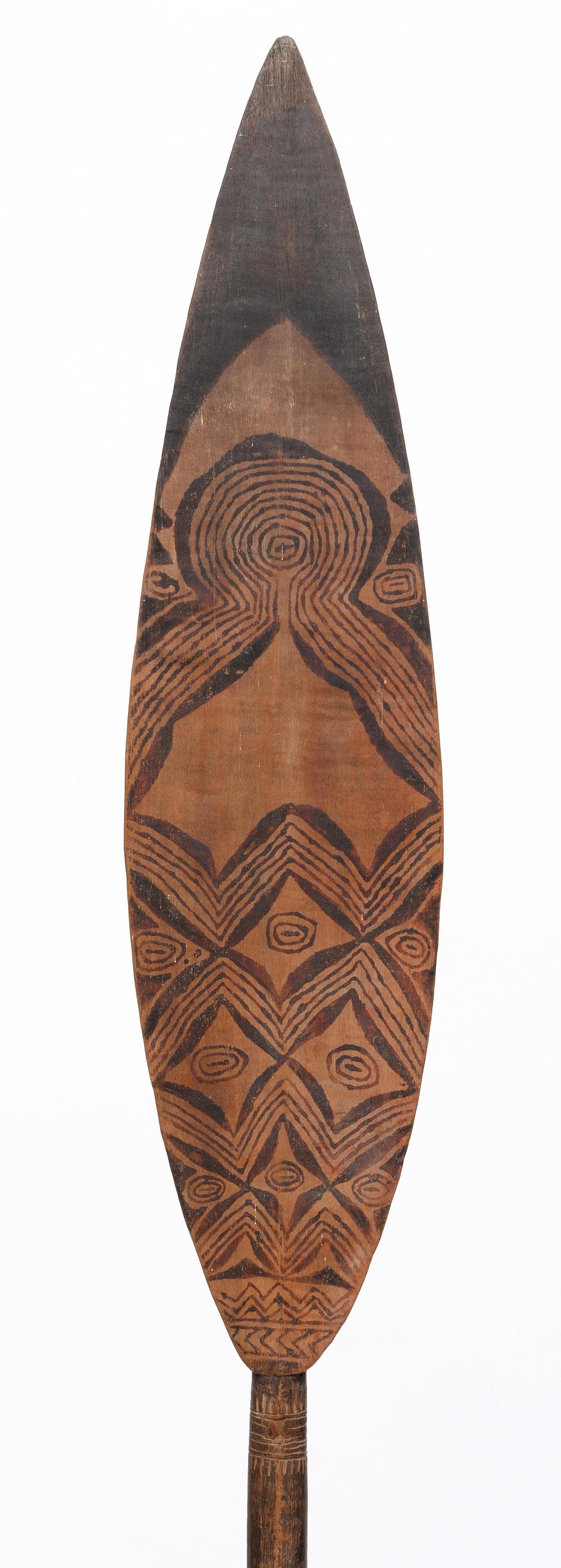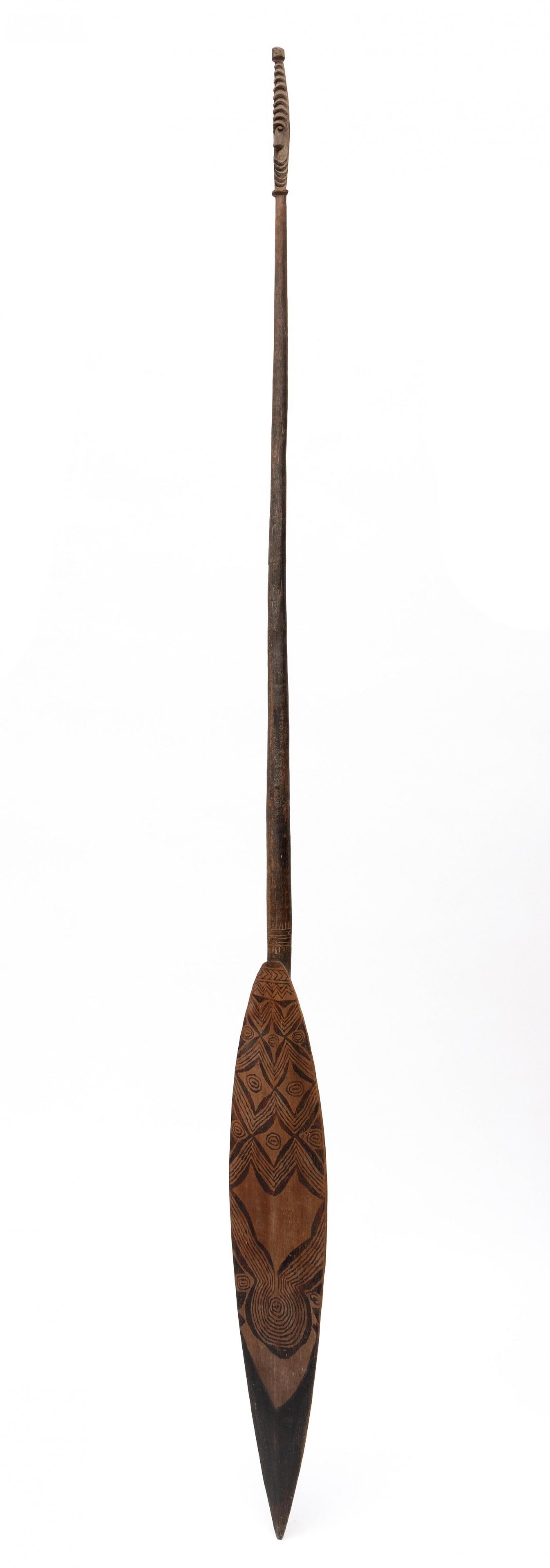 the top with a carved spirit mask, the blade showing a geometric pattern.