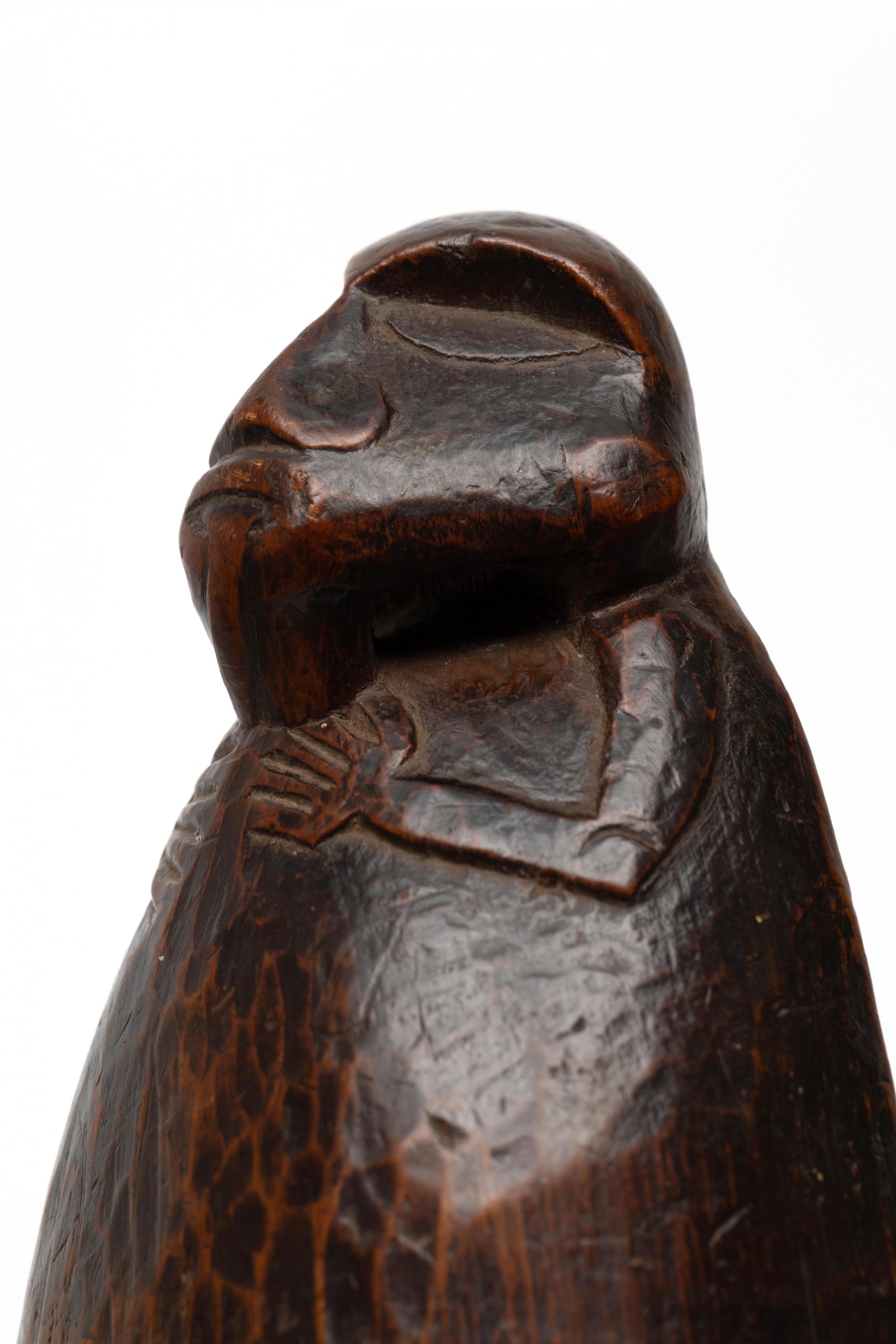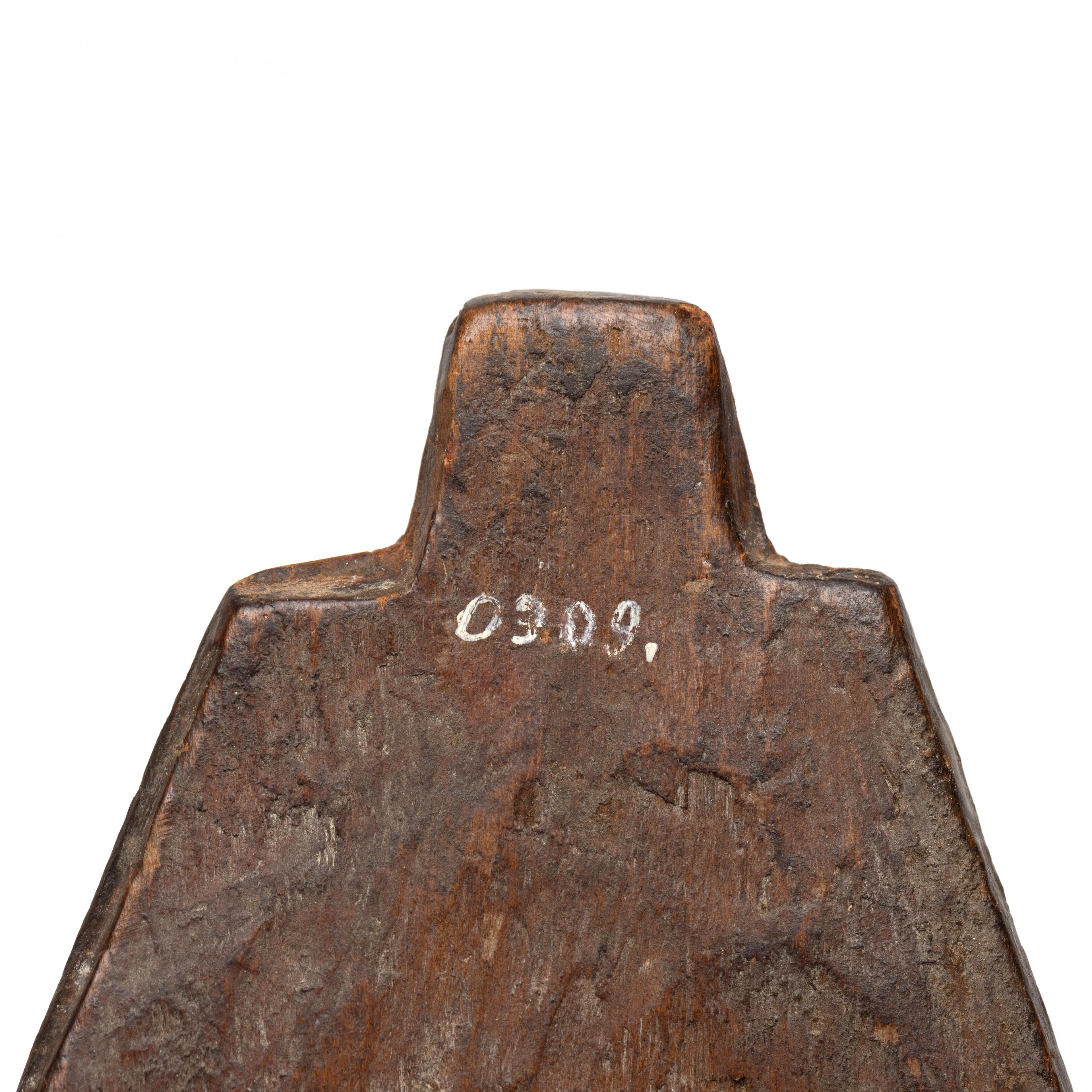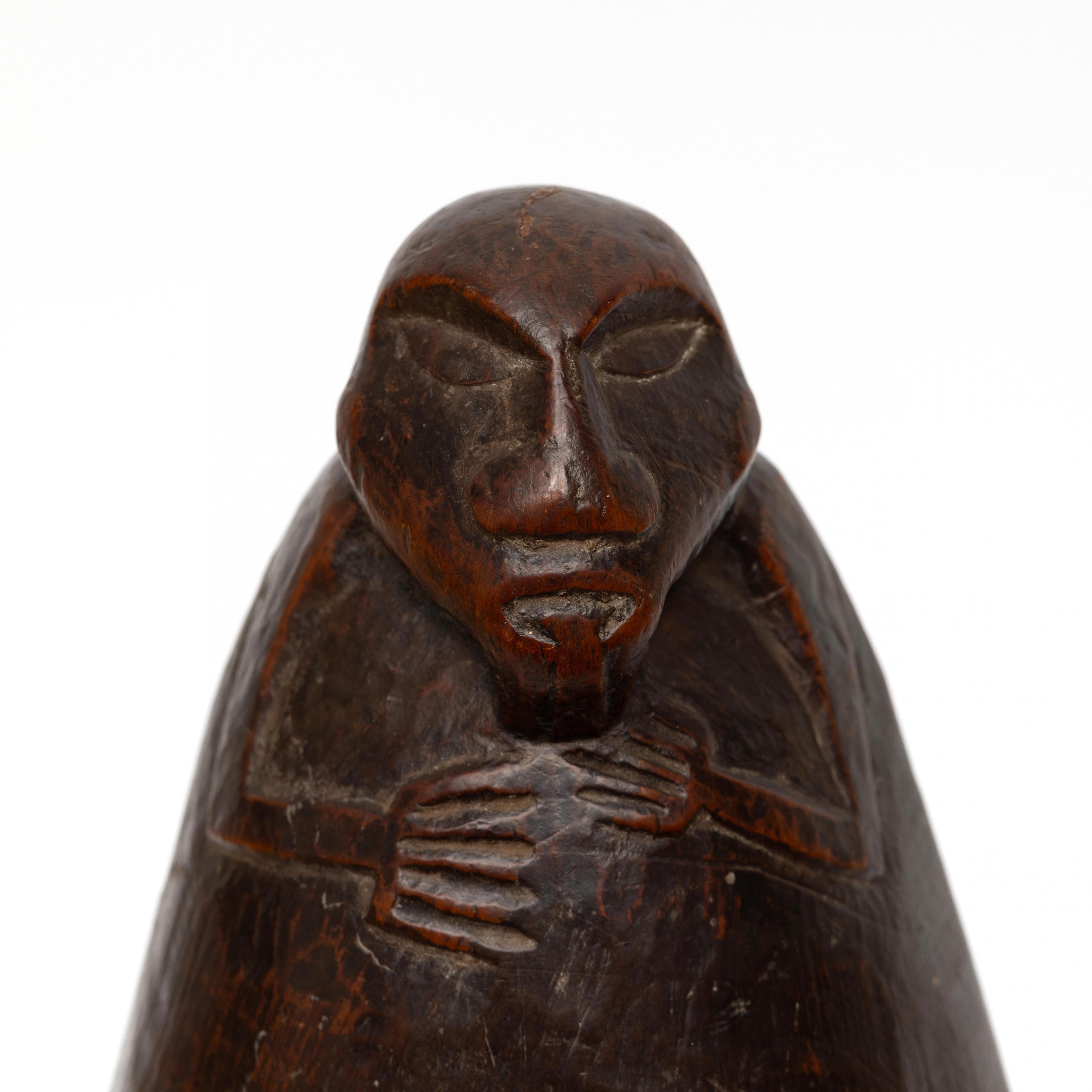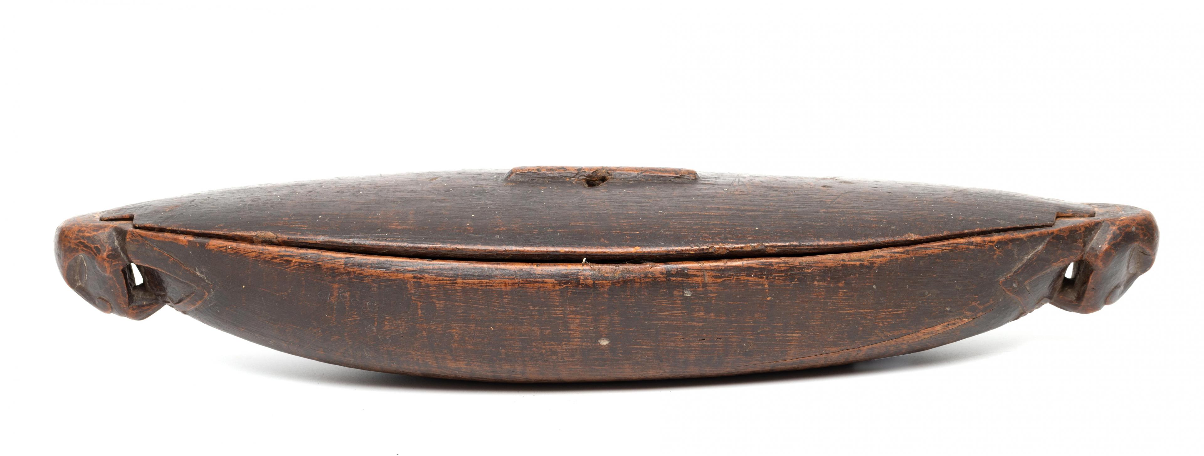 of elongated oval shape with an anthropomorphic head with jutting tongue at both ends, old patina; the reverse of the lid has an old inventory number in white ink 0909