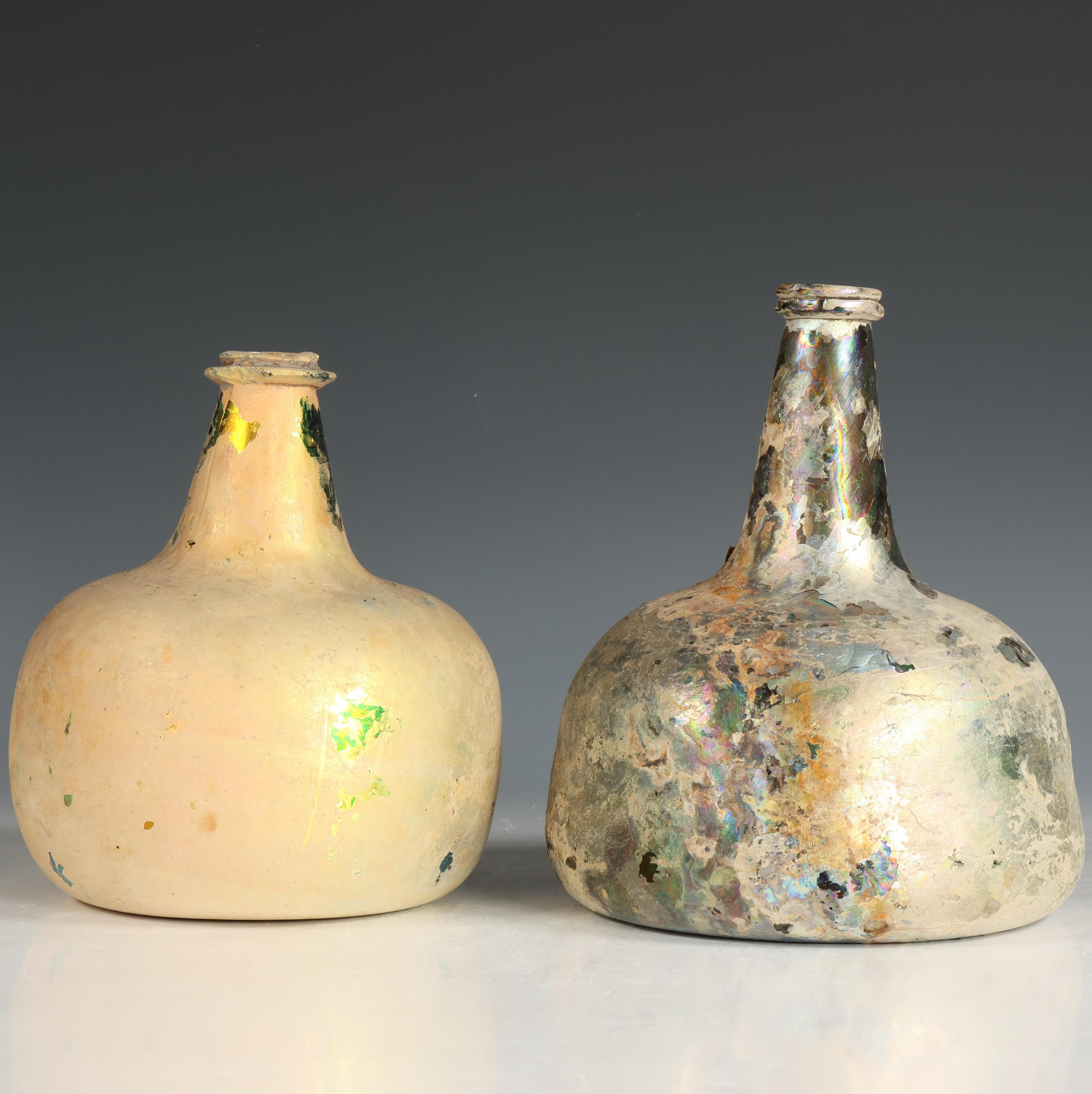 Twee glazen wijnflessen, 'kattenkoppen', 18e eeuw;