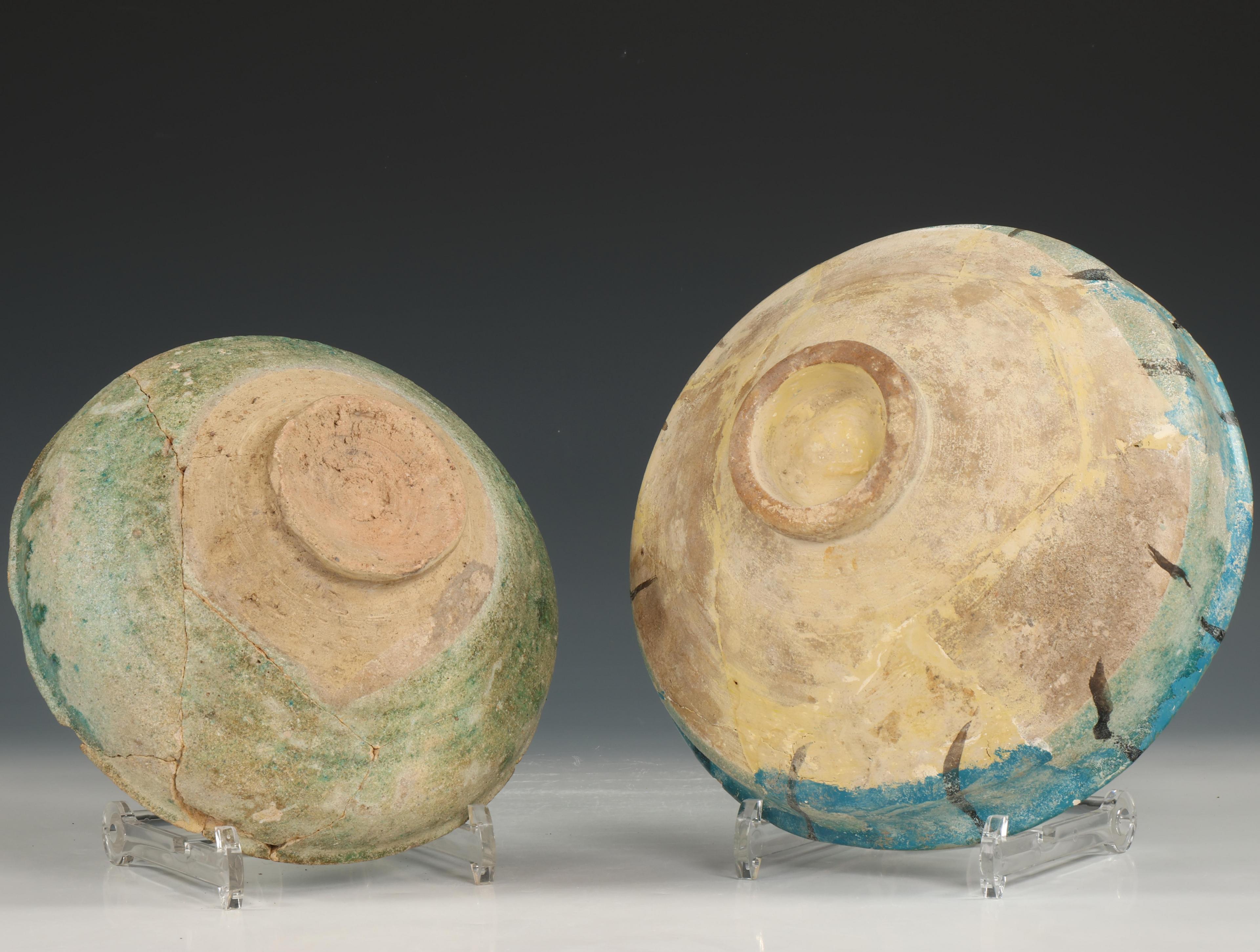 one bowl with overglazed black decoration. (both restored)