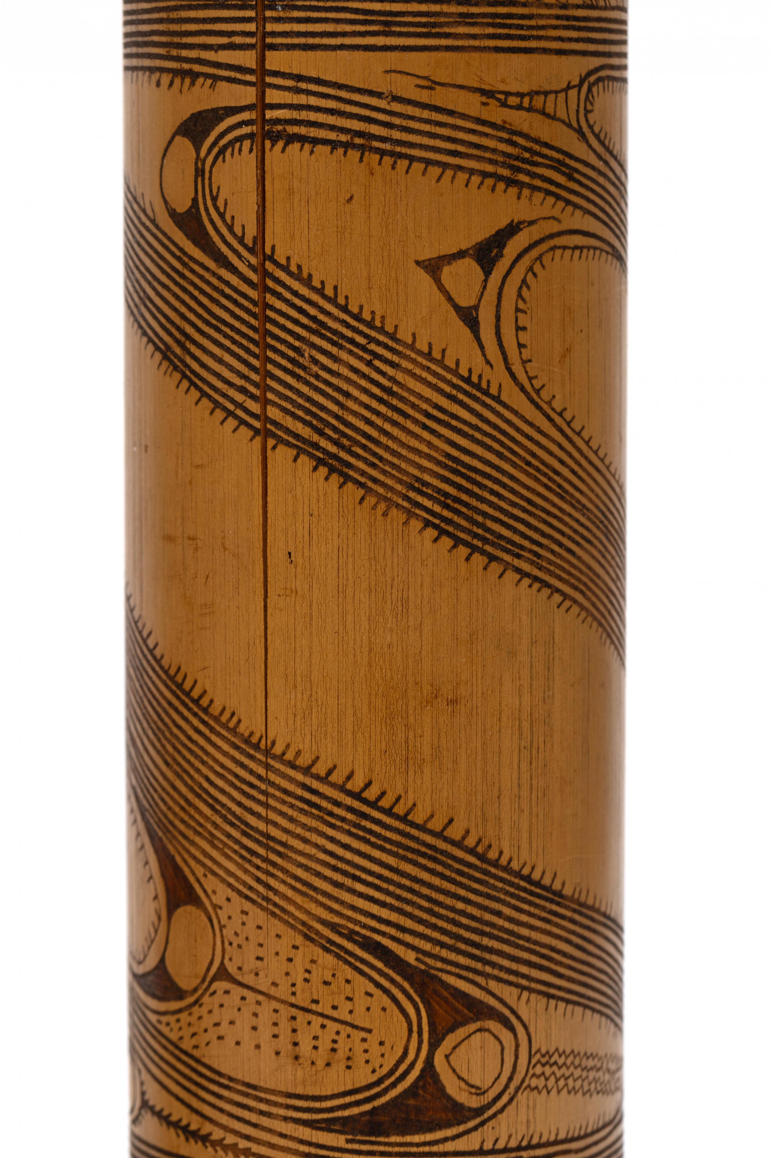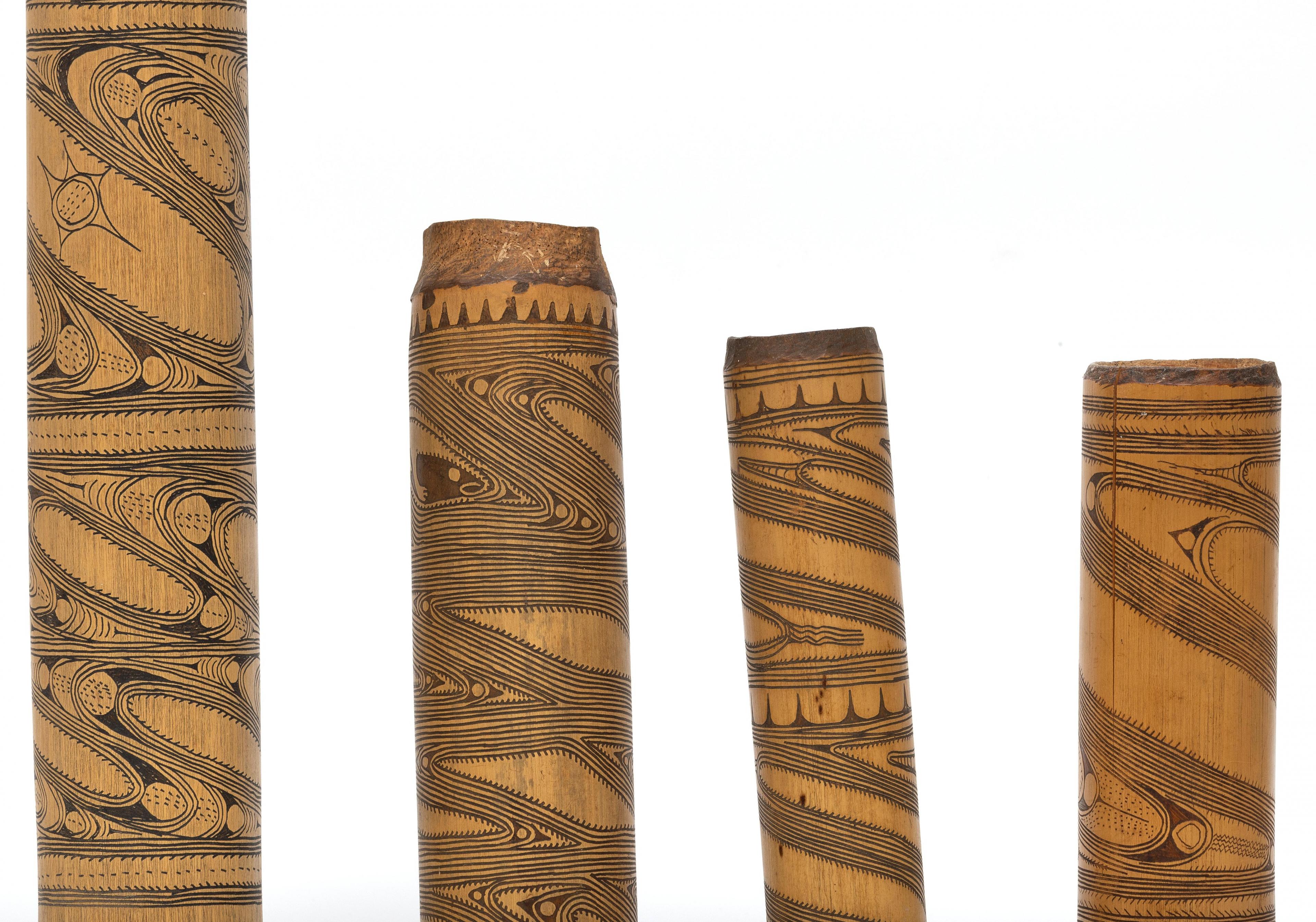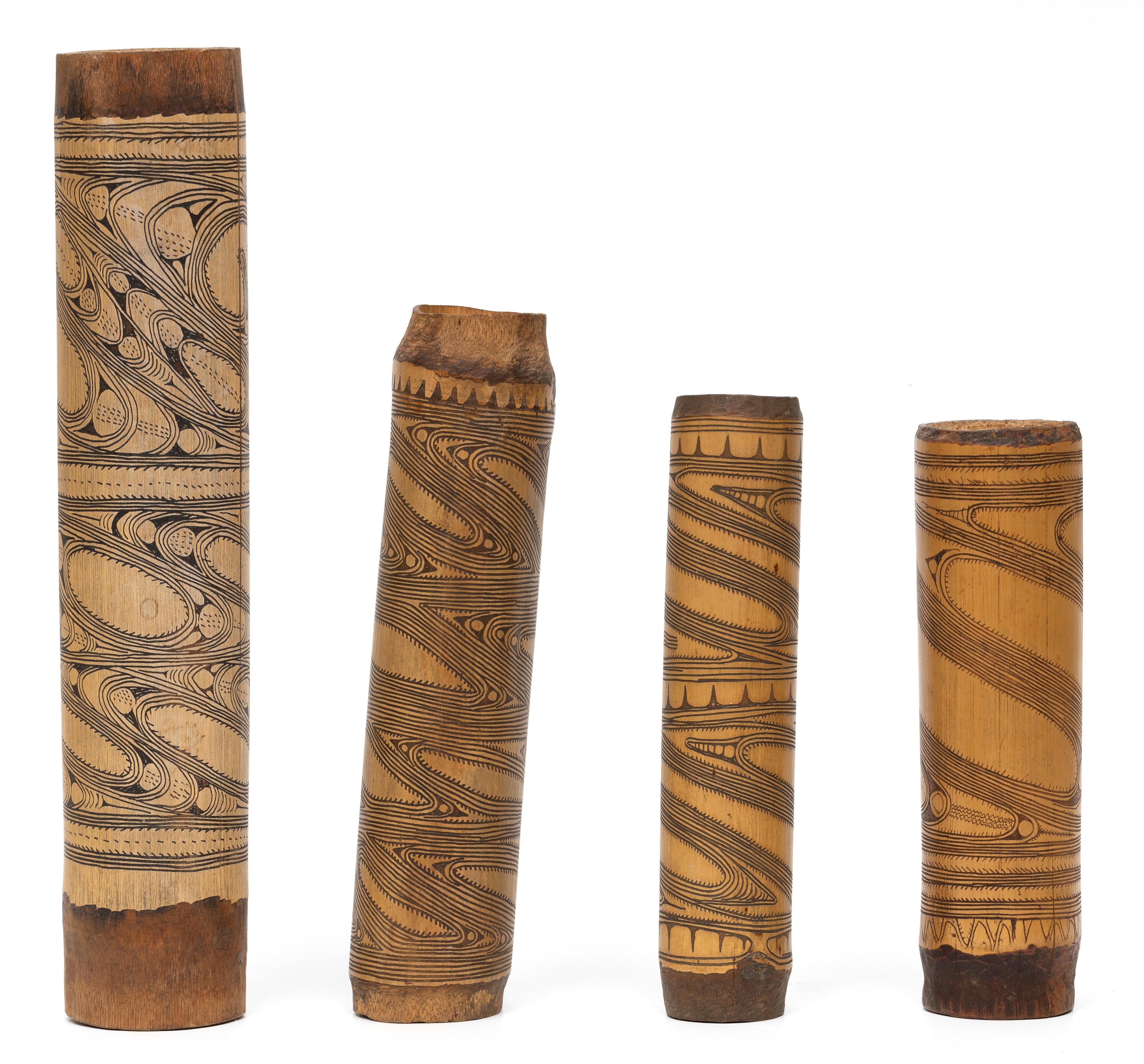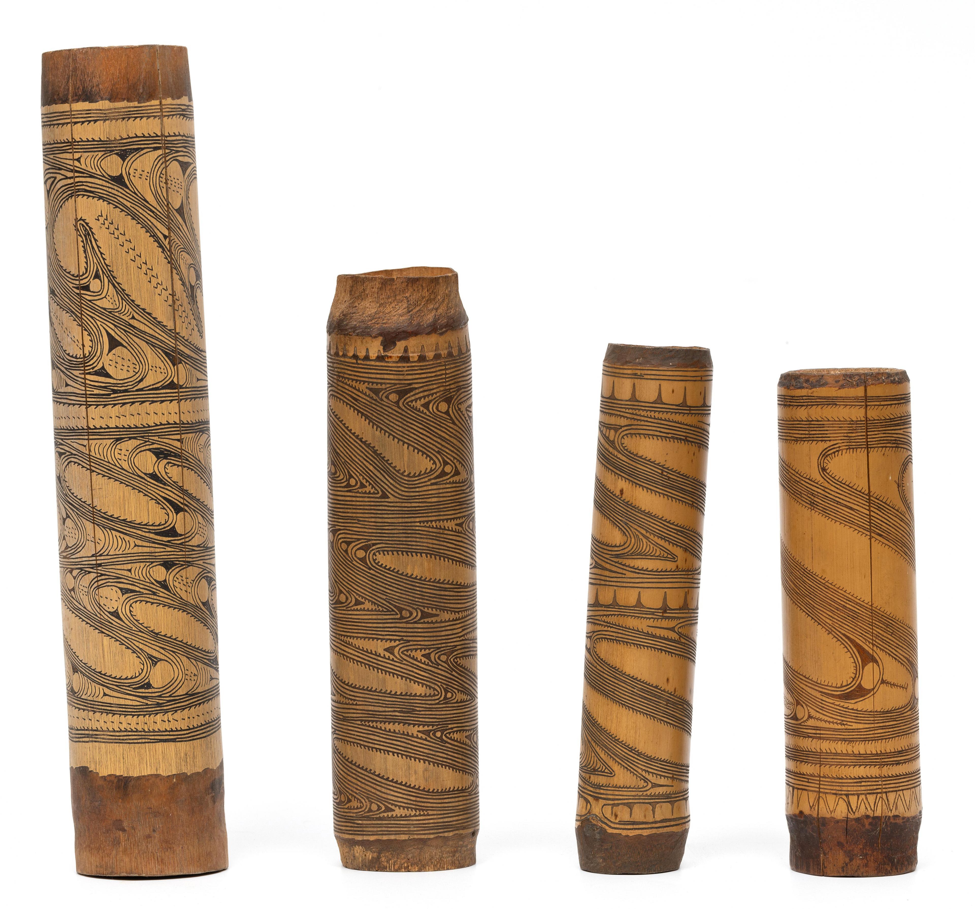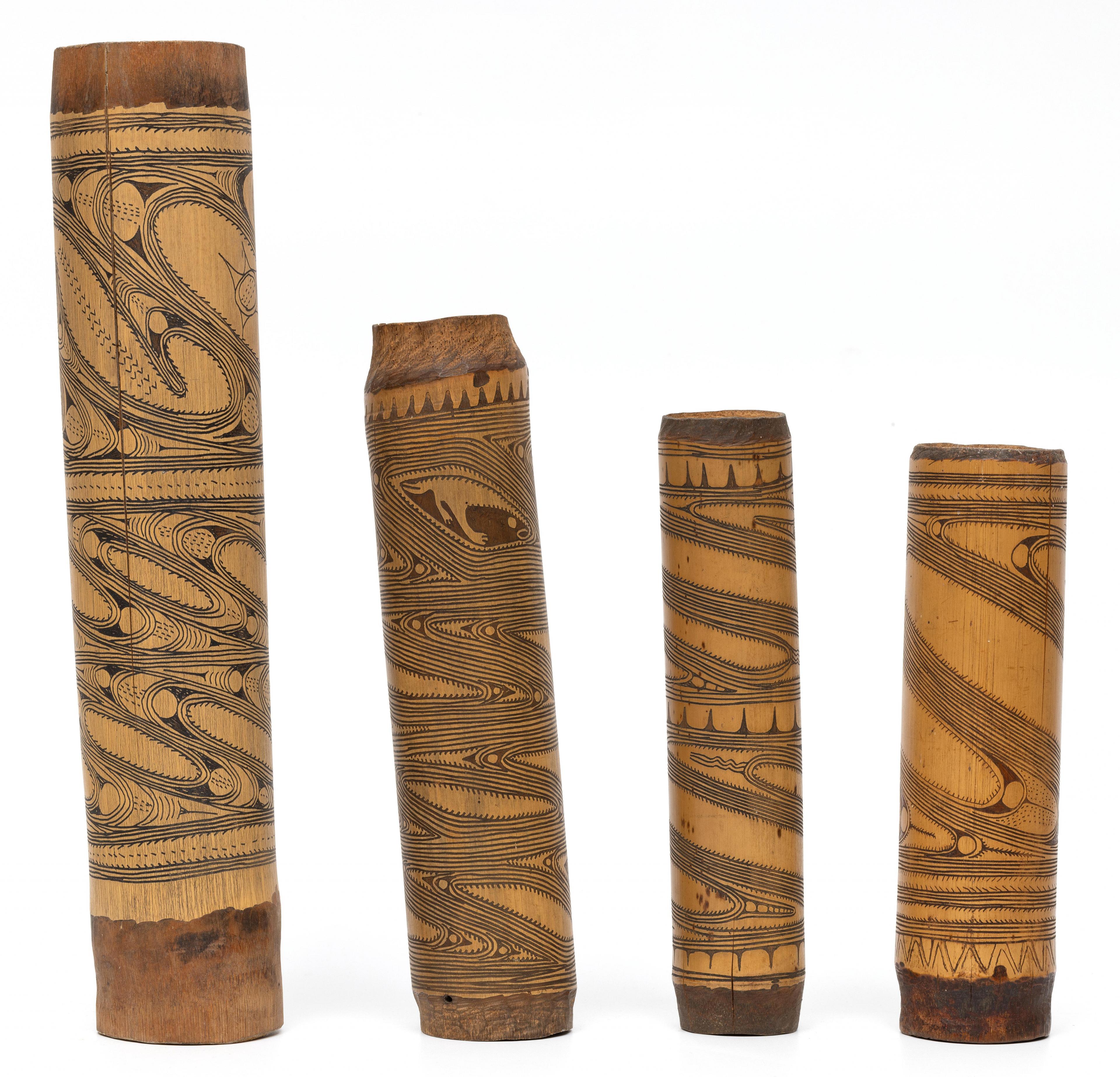 Papua New Guinea, Sepik, four engraved bamboo containers,