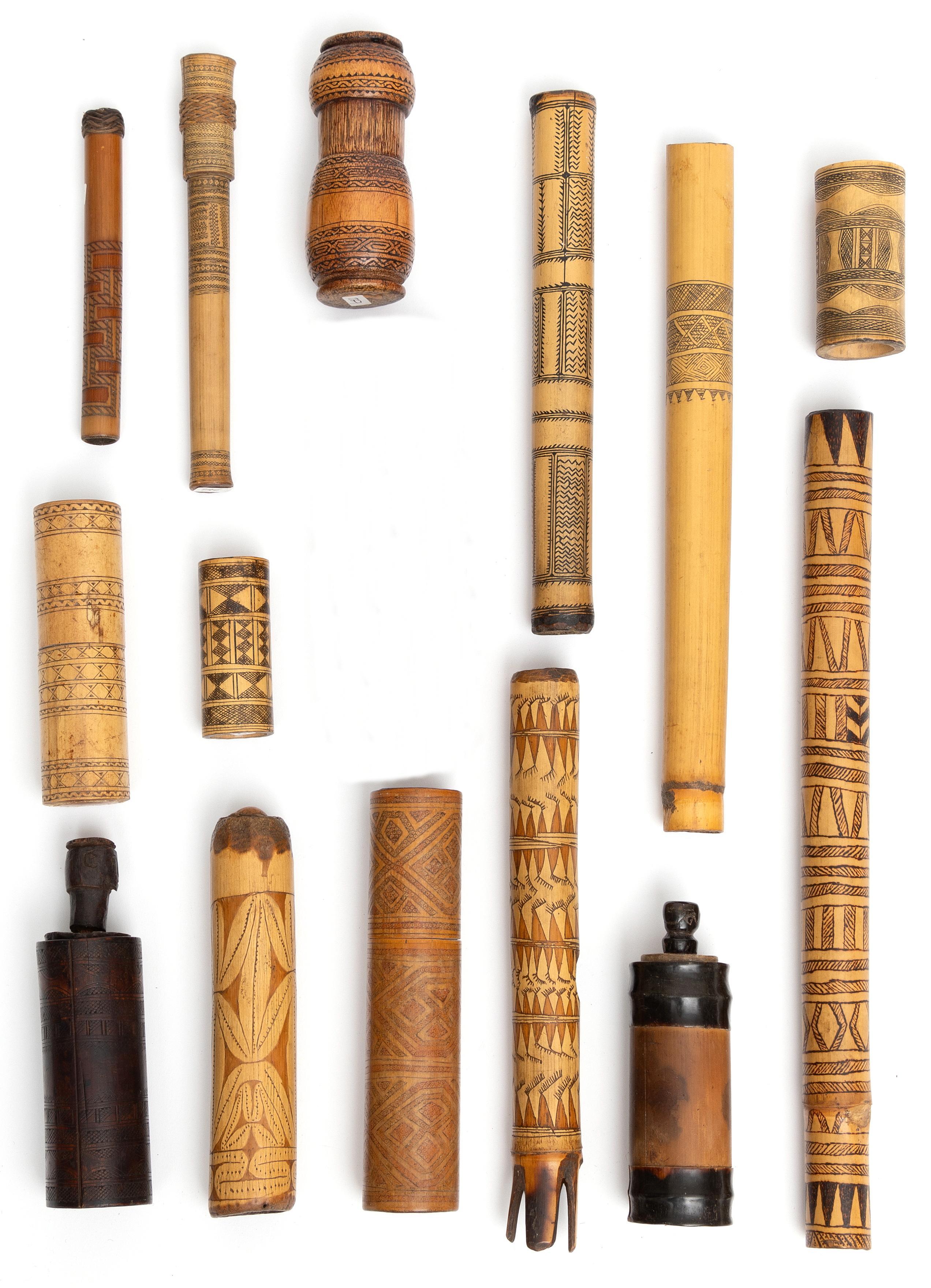 A collection of fourteen engraved bamboo containers hailing from Eastern Indonesia to Papua New Guinea.